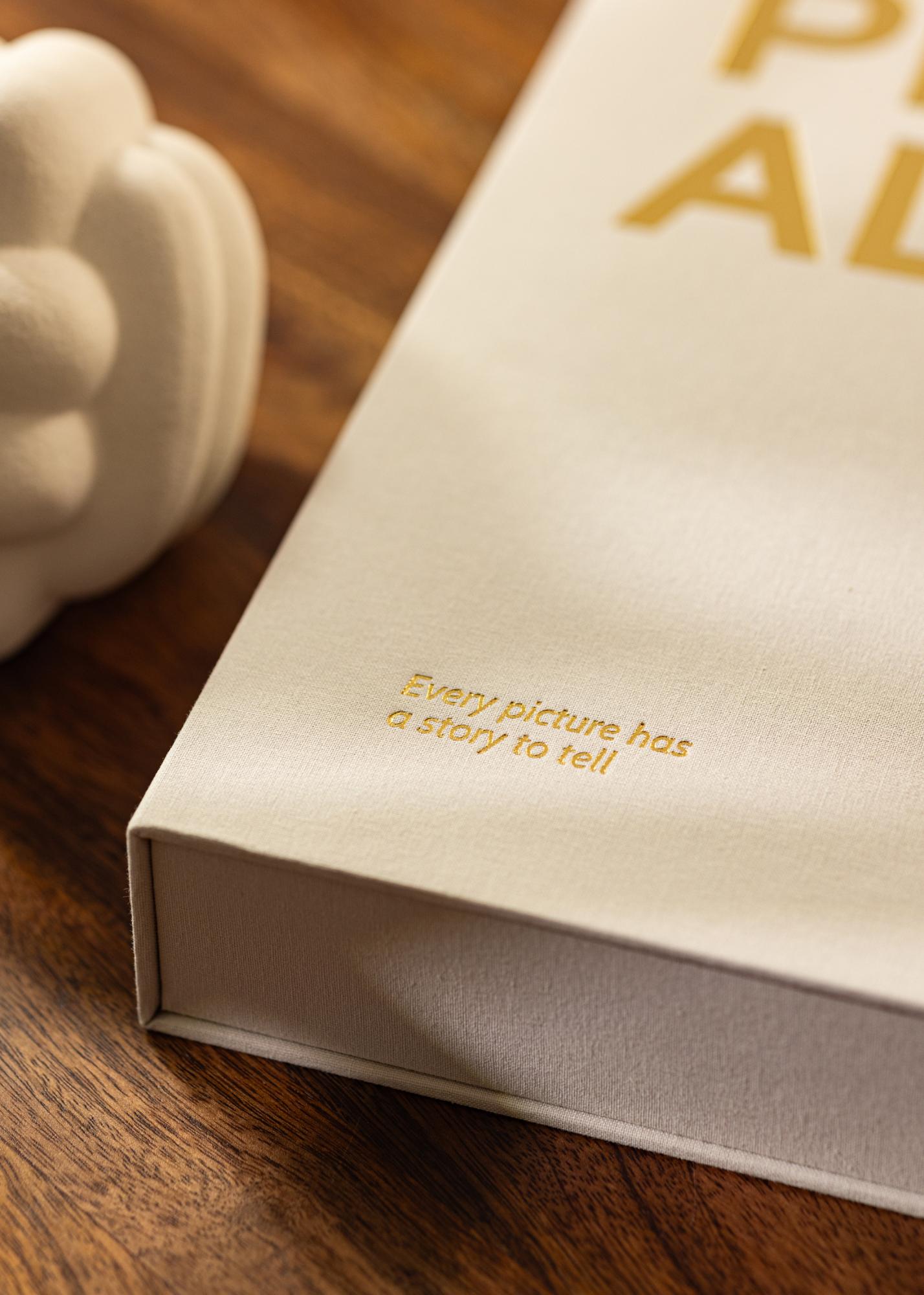 Questo è l'album fotografico per coloro che cercano un album che contenga i loro migliori ricordi fotografici e che sia anche bello da tenere in mostra. L'album è progettato come un Coffee Table Book, con un design moderno che diventa un elemento decorativo perfetto per il tavolino del soggiorno o per la libreria. È realizzato come una scatola esclusiva, con una copertina in tessuto color crema dallo stile elegante. Quando apri l'album, trovi un raccoglitore ad anelli con 60 pagine nere per gli album (30 fogli) che puoi riempire con fotografie di momenti speciali. Puoi incollare le foto esattamente dove desideri.
