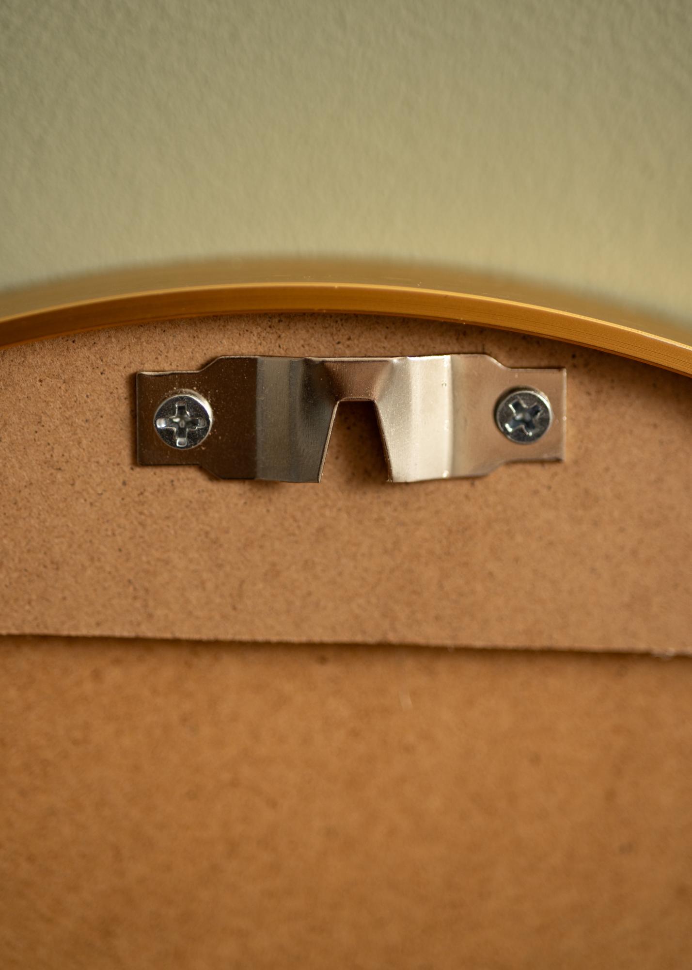 Lo specchio rotondo KAILA Edge Gold è disponibile in diverse dimensioni, e questa specchio ha un diametro di 30 cm. Il retro dello specchio è dotato di un supporto per il montaggio a parete facile e stabile, e viti e tasselli adatti sono inclusi.