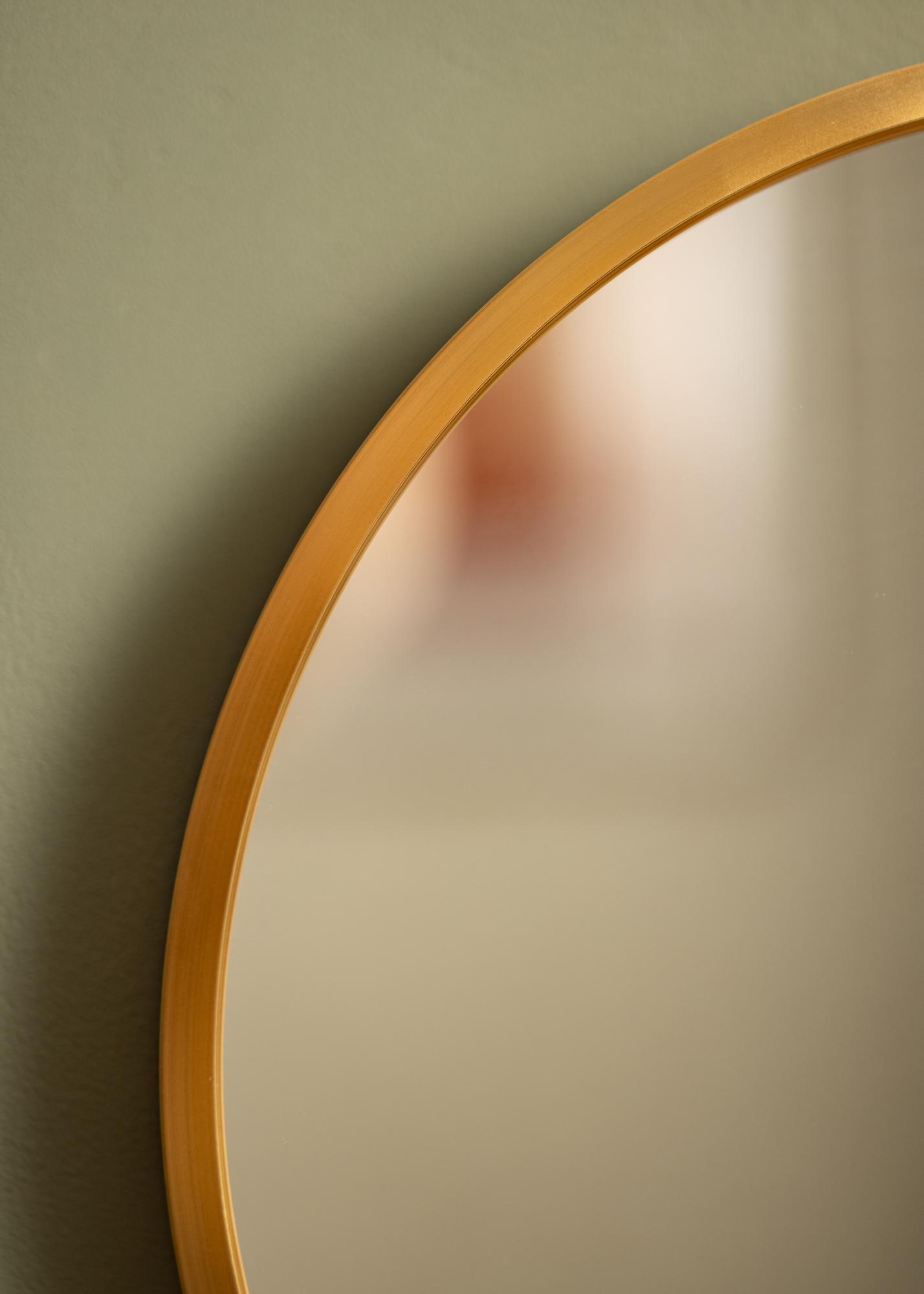 Uno specchio rotondo dal design elegante svedese con una cornice metallica in una bellissima finitura dorata. La cornice ha una superficie spazzolata, che conferisce al bellissimo colore dorato un aspetto leggermente opaco. La cornice è anche sottile, ma ha allo stesso tempo - a seconda delle dimensioni - una profondità compresa tra 30-40 mm, il che fa sporgere un po' dal muro creando un effetto tridimensionale affascinante. La profondità della cornice fa anche sì che lo specchio si senta solido e robusto, senza togliere la sensazione minimalista dello specchio.