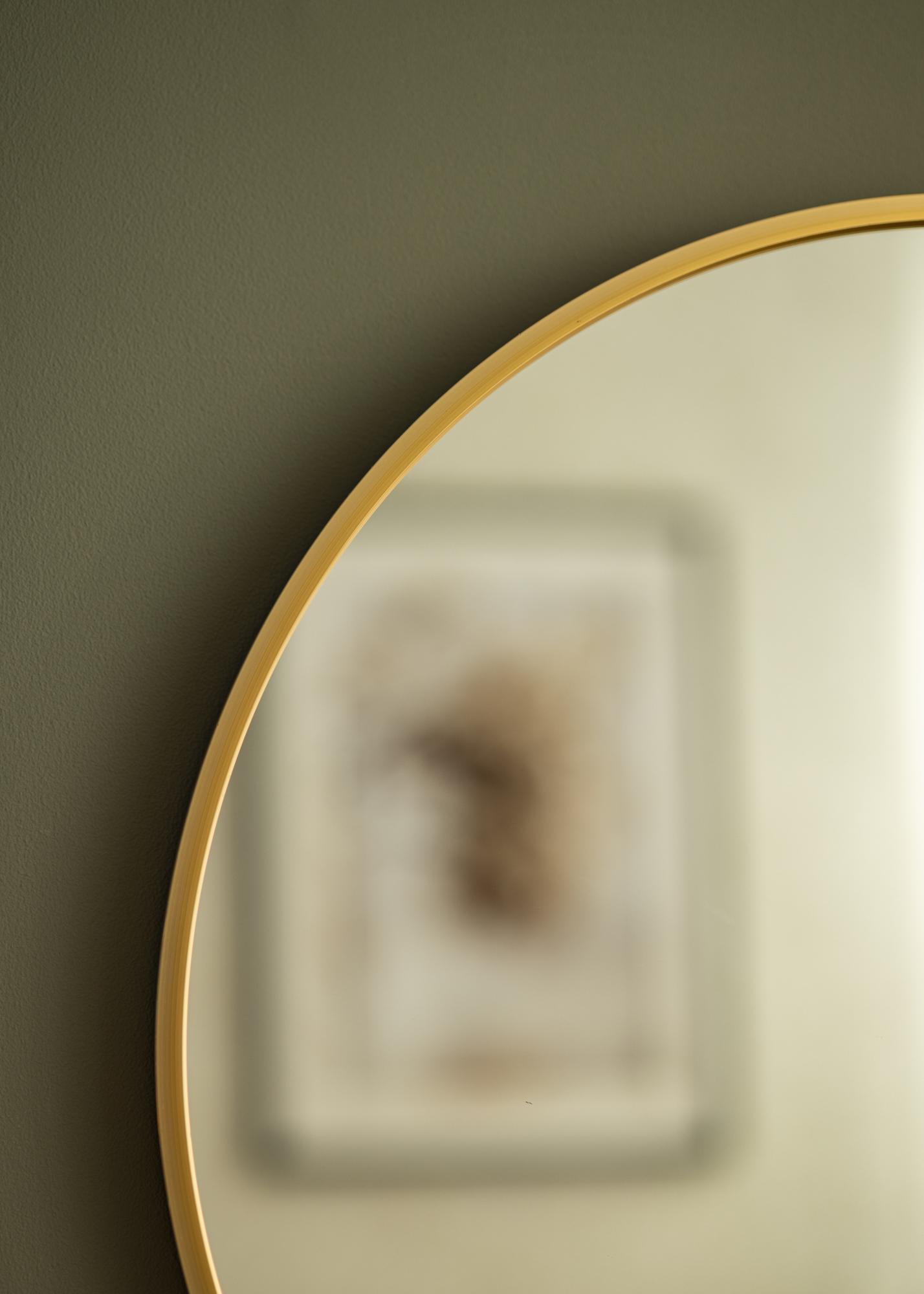 Uno specchio rotondo dal design elegante svedese con una cornice metallica in una bellissima finitura dorata. La cornice ha una superficie spazzolata, che conferisce al bellissimo colore dorato un aspetto leggermente opaco. La cornice è anche sottile, ma ha allo stesso tempo - a seconda delle dimensioni - una profondità compresa tra 30-40 mm, il che fa sporgere un po' dal muro e crea un effetto tridimensionale affascinante. La profondità della cornice fa anche sì che lo specchio si senta solido e robusto, senza togliere la sensazione minimalista dello specchio.