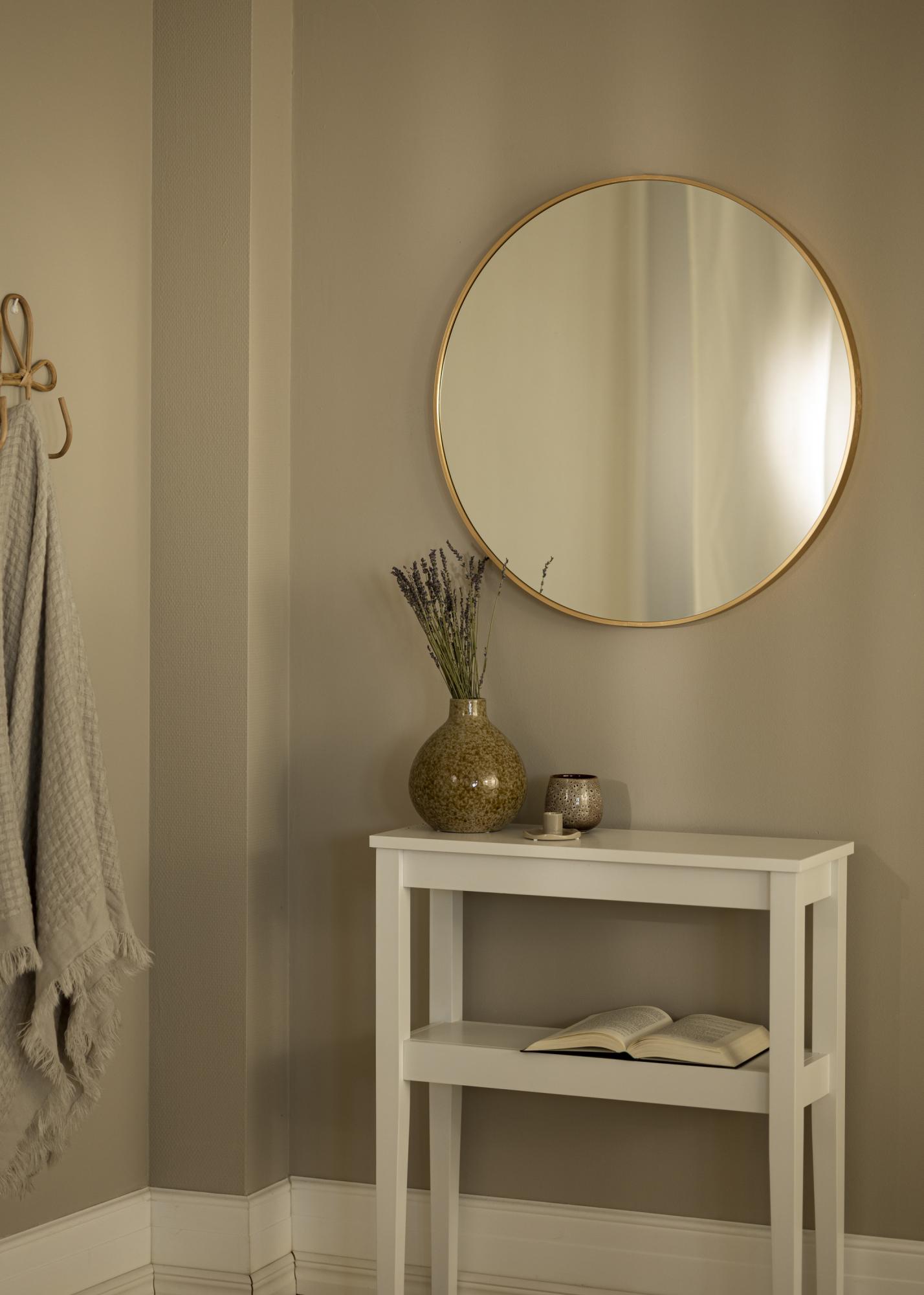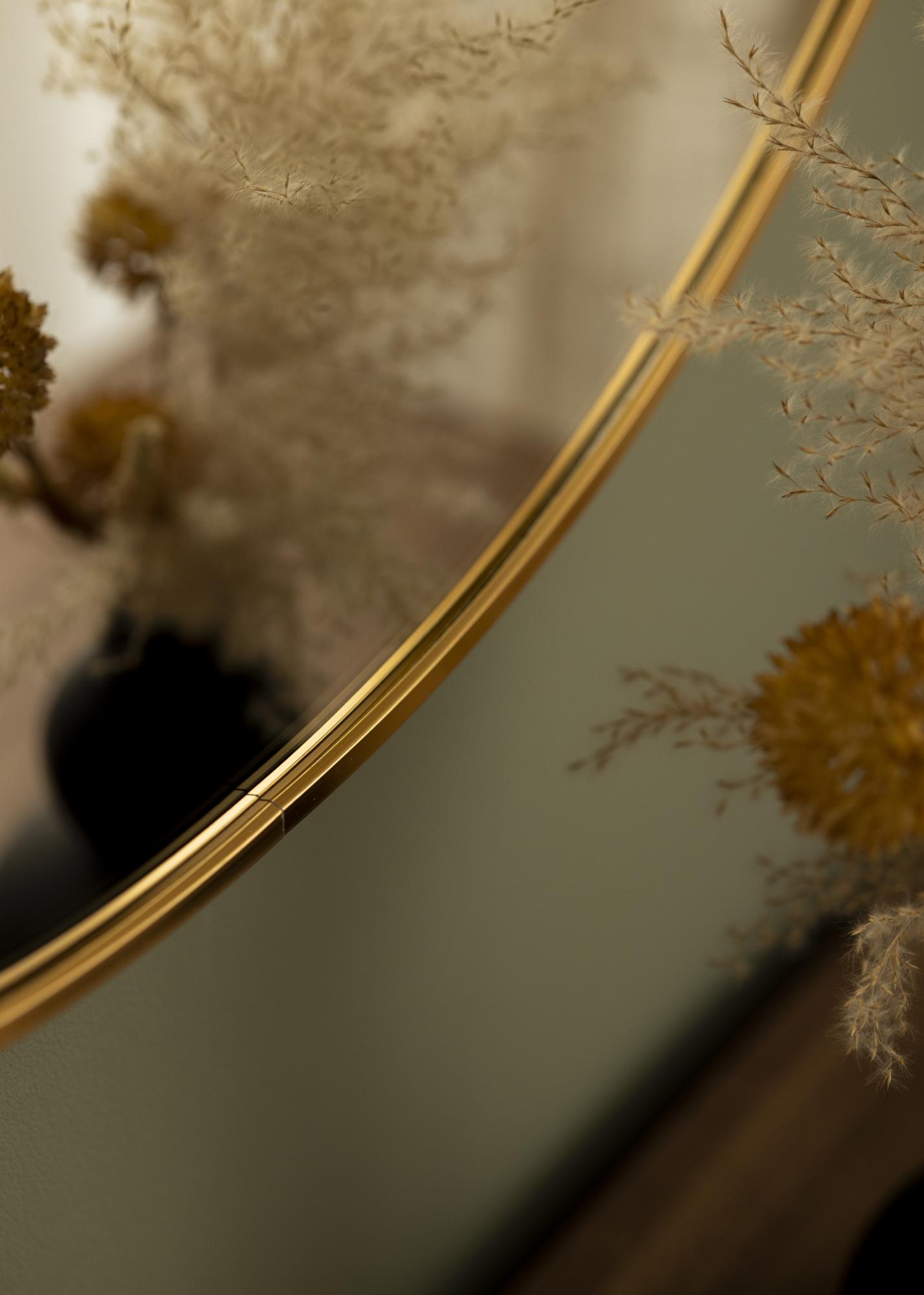 Uno specchio rotondo dal design elegante svedese con una cornice metallica in una bellissima finitura dorata. La cornice ha una superficie spazzolata, che conferisce al bellissimo colore dorato un aspetto leggermente opaco. La cornice è anche sottile, ma ha allo stesso tempo - a seconda delle dimensioni - una profondità compresa tra 30-40 mm, il che fa sì che si sporga un po' dal muro e crei un effetto tridimensionale affascinante. La profondità della cornice fa anche sì che lo specchio sia solido e robusto, senza togliere la sensazione minimalista dello specchio.