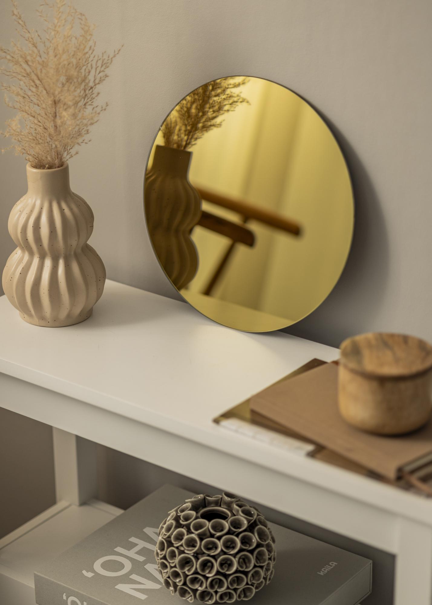 Questo specchio rotondo è elegante e minimalista, allo stesso tempo lussuoso ed esclusivo. Questo è dovuto alla felice combinazione di dettagli d'effetto e forma essenziale. Lo specchio è sottile e senza cornice, il che contribuisce alla sua linea pulita. lo specchio con tonalità dorata contribuisce a valorizzare l'intero e conferisce una sensazione di esclusività.