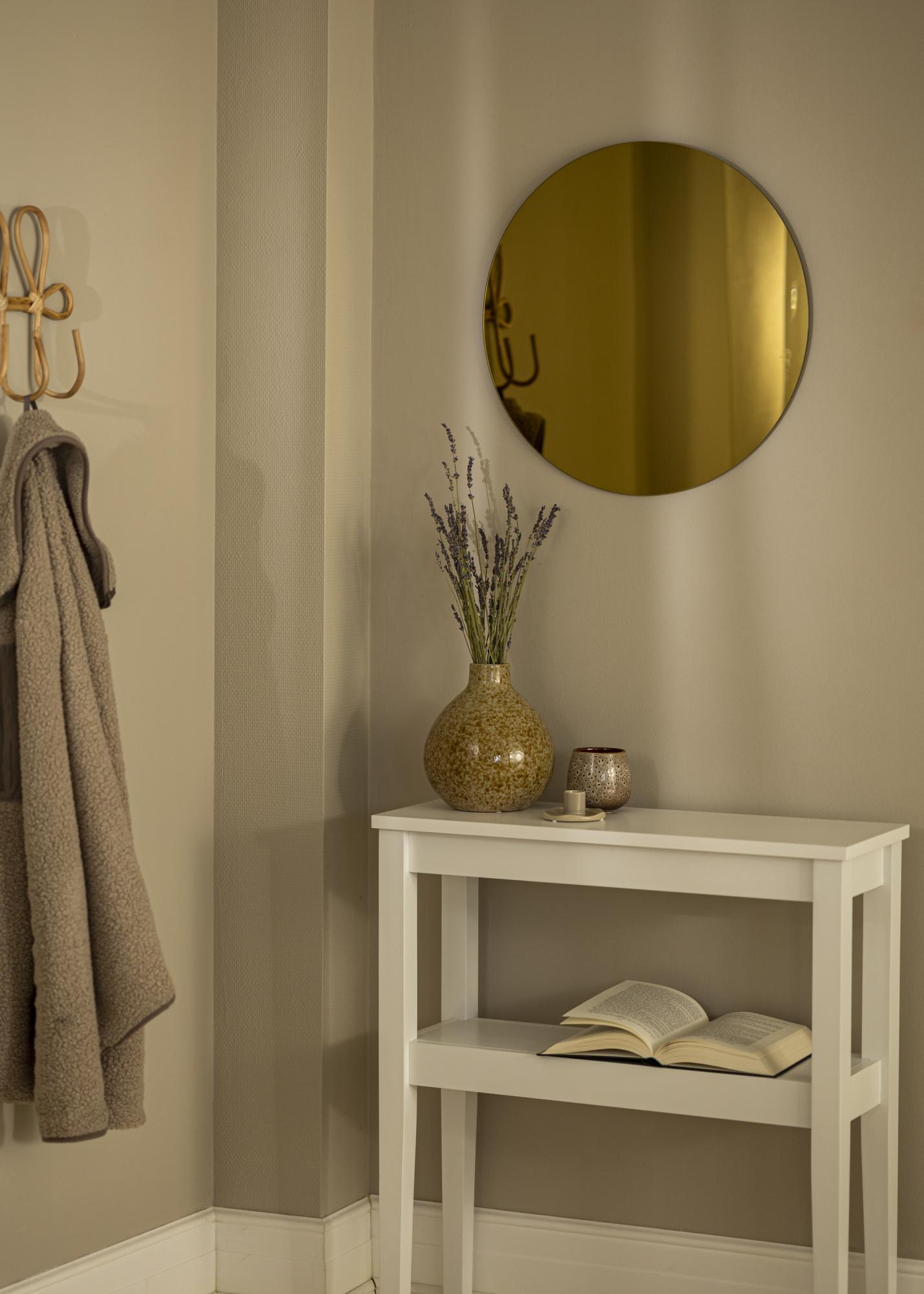 Lo specchio rotondo KAILA Gold è un perfetto esempio di come una forma elegante incontri dettagli suggestivi. Questo specchio rotondo è sottile e non ha una cornice, il che gli conferisce un aspetto moderno e minimalista. Ciò si combina con un bellissimo vetro specchiato dorato che valorizza l'intero e rende lo specchio piacevolmente accattivante.