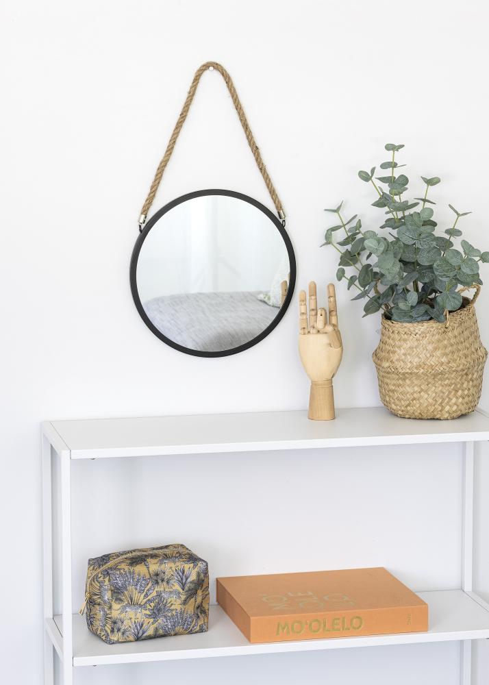 Ecco uno specchio da parete rotondo perfetto per chi è attratto da un arredamento ispirato al mare! Lo specchio è realizzato in metallo e ha una corda decorativa in canapa per un appeso decorativo. È presente un supporto da parete. lo specchio è incorniciato da un bordo nero che conferisce allo specchio una profondità elegante. Lo specchio ha un diametro di 30 cm.