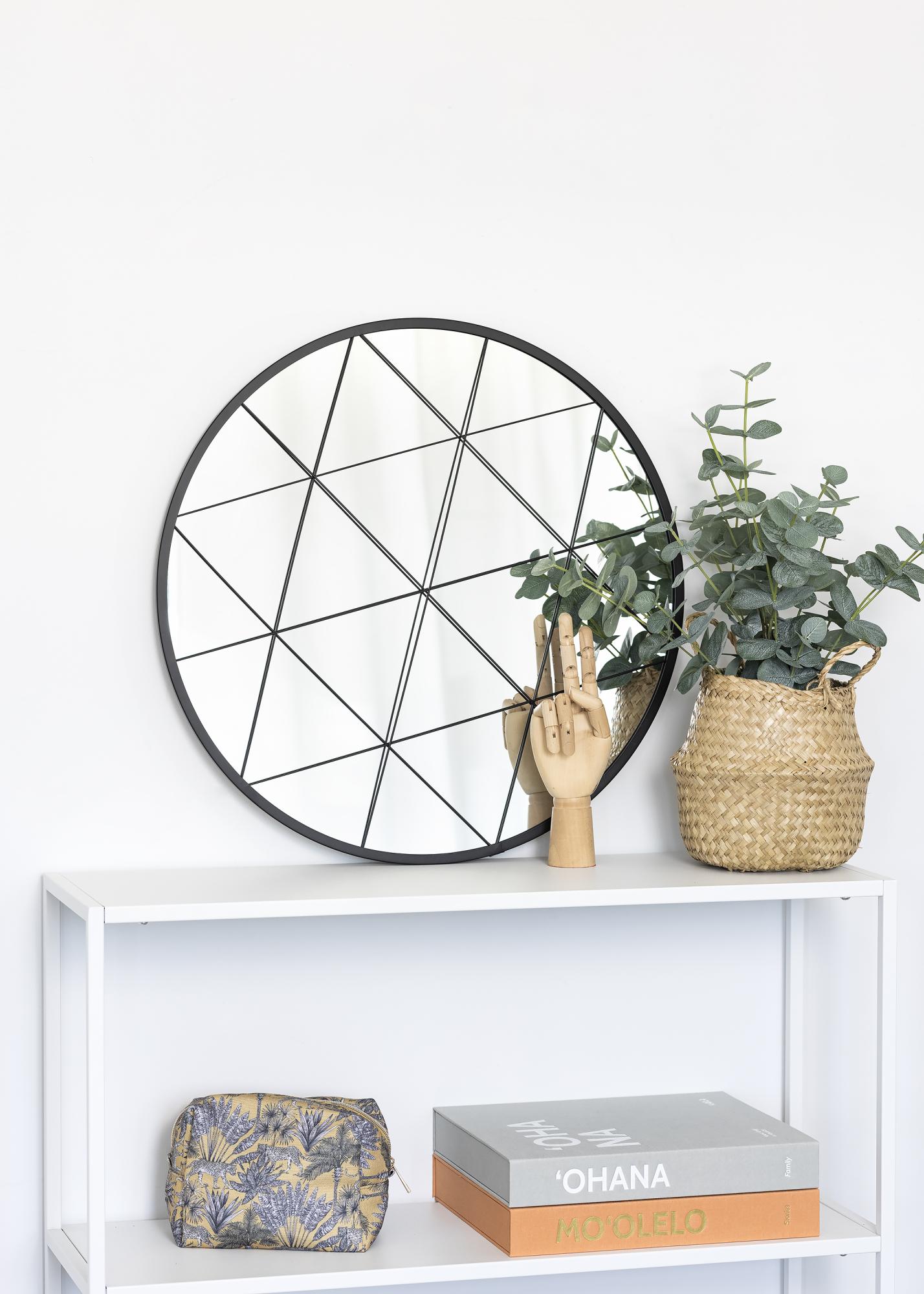 Questo è uno specchio da parete dal design accattivante e alla moda del marchio svedese KAILA. Lo specchio ha un motivo che forma bellissimi triangoli e rende questo specchio un punto focale nella casa. Lo specchio è di colore nero, è realizzato in metallo e ha un diametro di 55 cm. Posiziona questo specchio da qualche parte in casa dove possa esprimere la sua funzionalità e decorazione, ad esempio nell'ingresso, nel soggiorno o nella camera da letto!