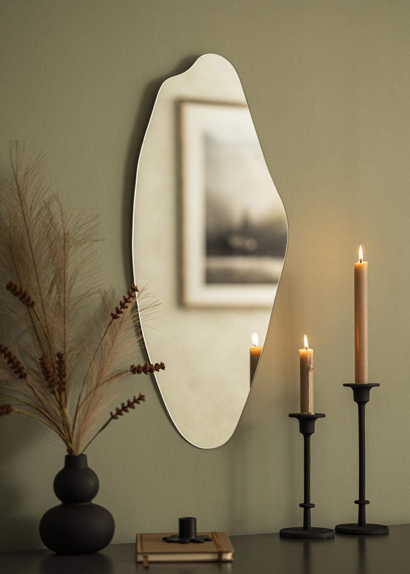 Questo è uno specchio rettangolare con una bellissima forma asimmetrica, che lo rende un elemento d'arredo affascinante perfetto per una casa moderna. Lo specchio ha pratici supporti per la parete sul retro e può essere appeso alla parete nella stanza desiderata - può essere utilizzato anche in bagno!