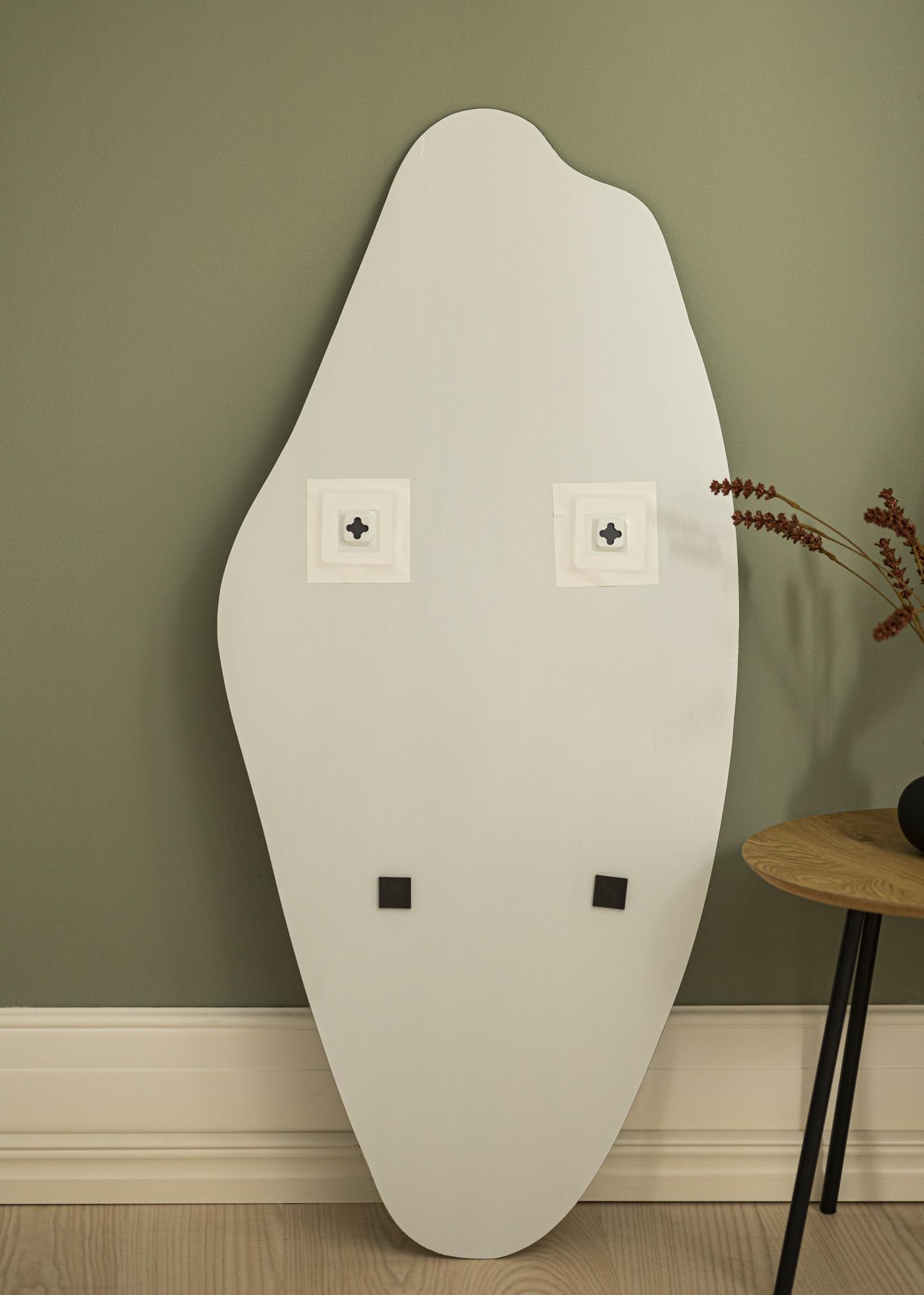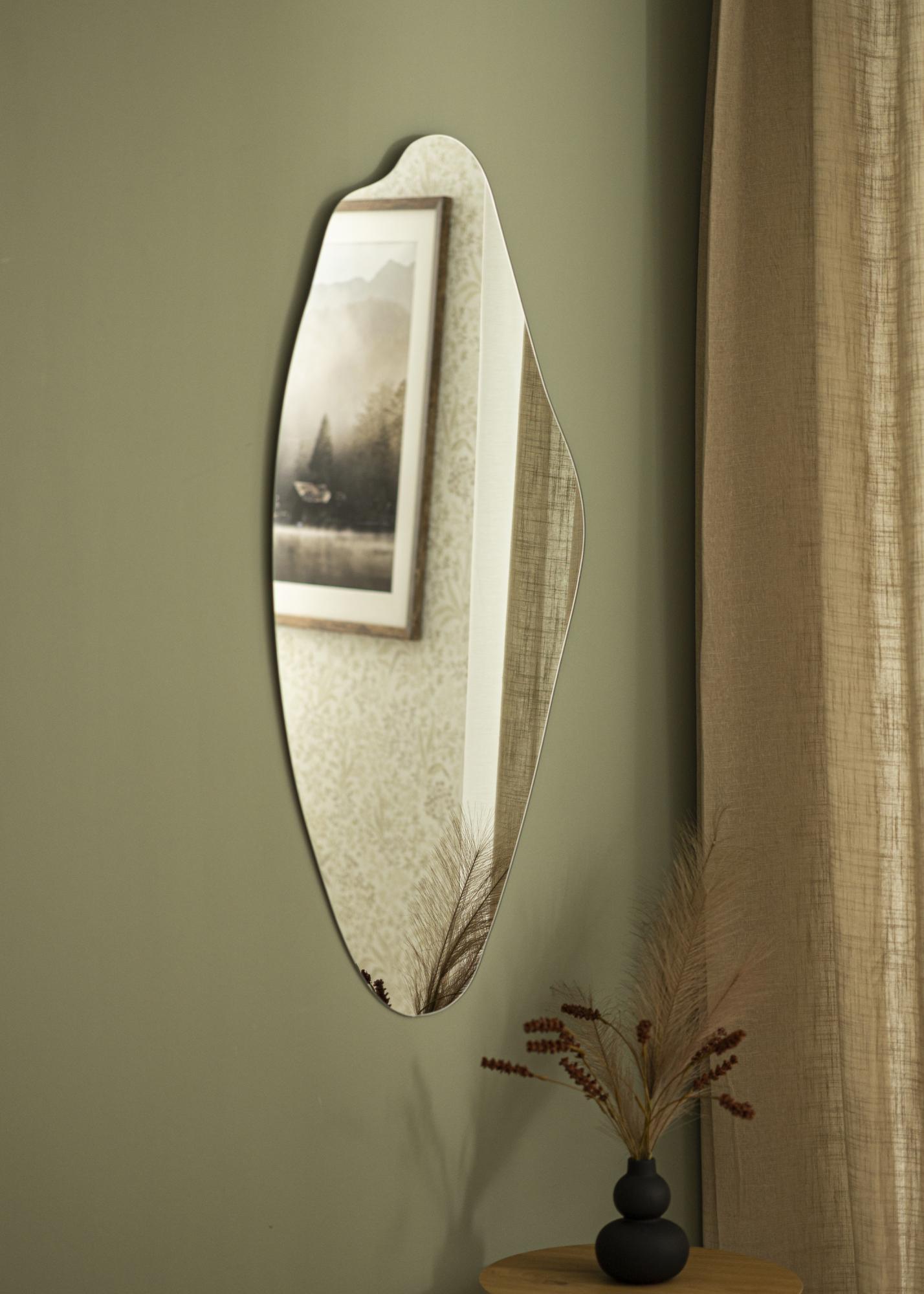 Questo è uno specchio rettangolare con una bellissima forma asimmetrica, che lo rende un elemento d'arredo affascinante perfetto per una casa moderna. Lo specchio ha pratici supporti per la parete sul retro e può essere appeso alla parete nella stanza desiderata - può essere utilizzato anche in bagno!