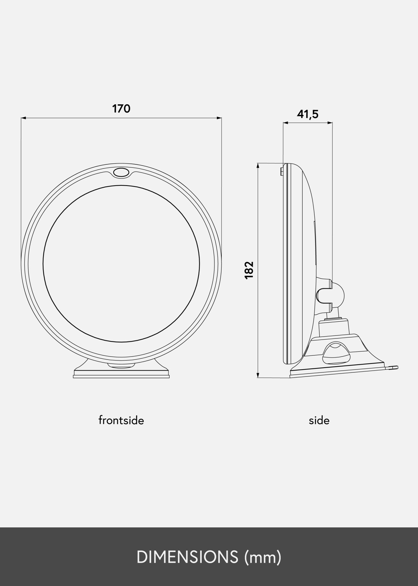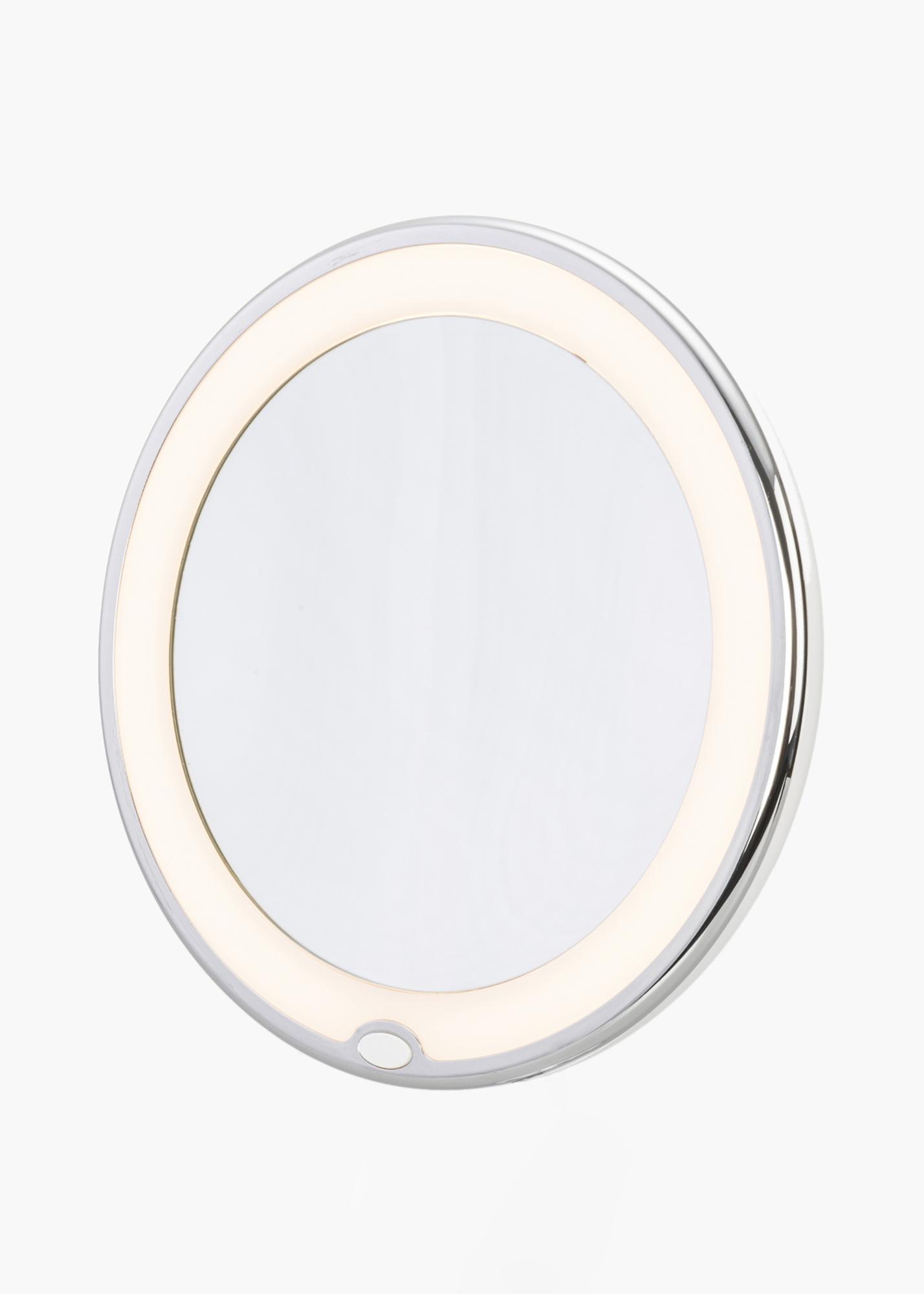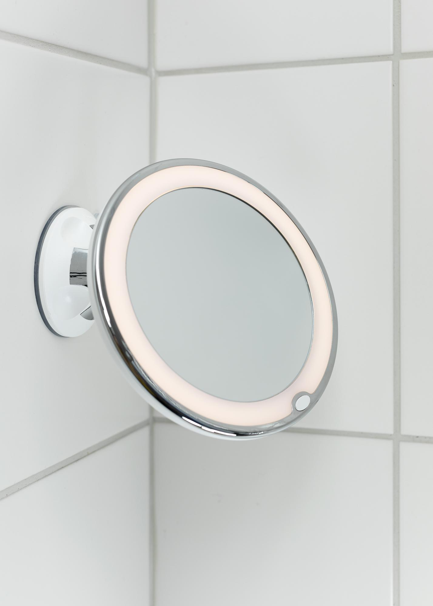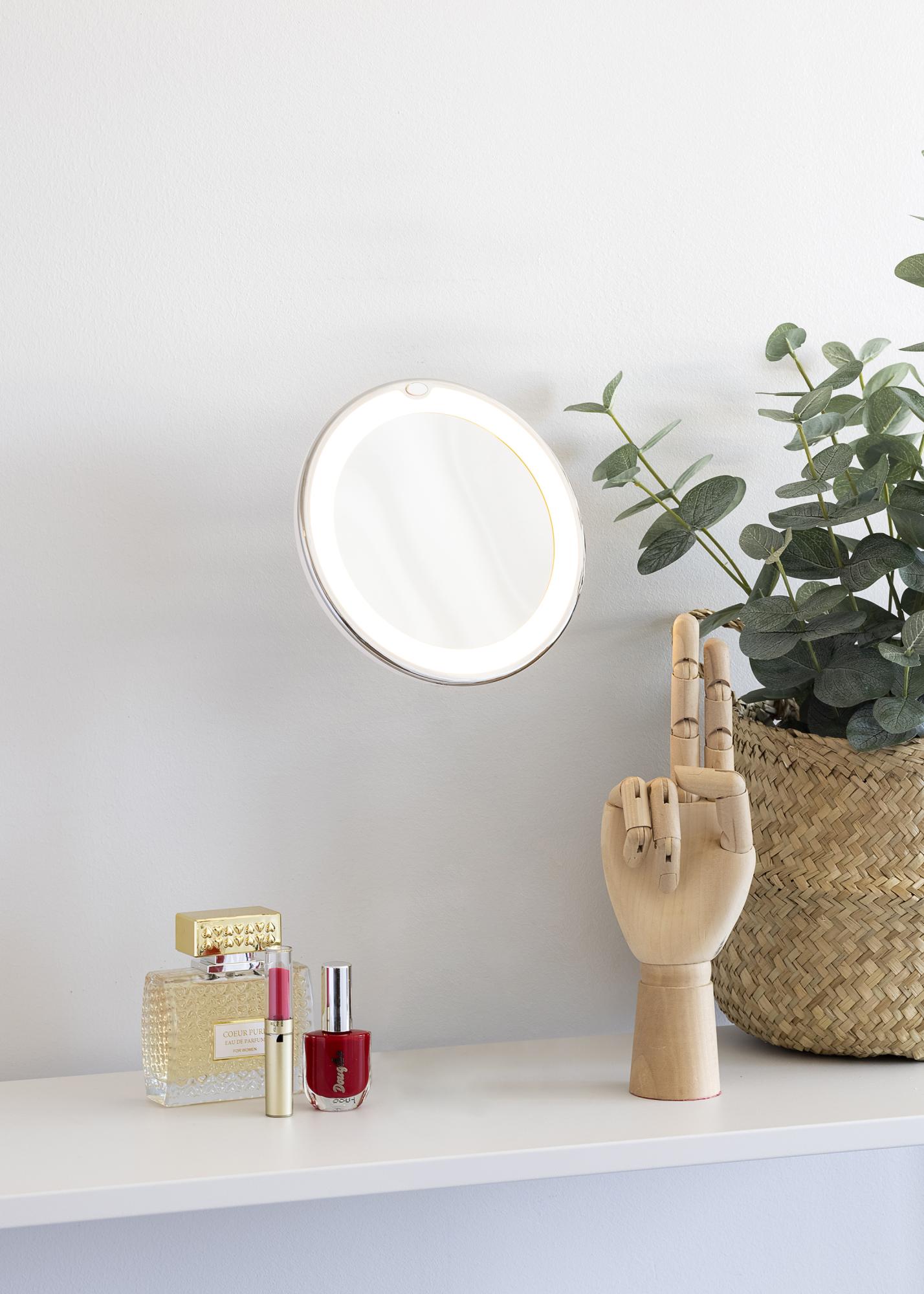 Questo è un classico specchio da bagno di KAILA con un design elegante. Lo specchio ha un'illuminazione a LED integrata che lo incornicia. Lo specchio da bagno ha un diametro di 17 cm e ha un vetro ingranditore con zoom 5x. In altre parole, questo specchio è eccellente per vedere un primo piano nitido del tuo viso! Lo specchio è un dettaglio d'arredo, ma il suo design compatto consente anche di riporlo facilmente quando non viene utilizzato. Lo specchio viene fissato al muro, alla piastrella o al tavolo con la ventosa inclusa. La ventosa è bloccabile e assicura che lo specchio sia stabile. Viene fornito smontato.