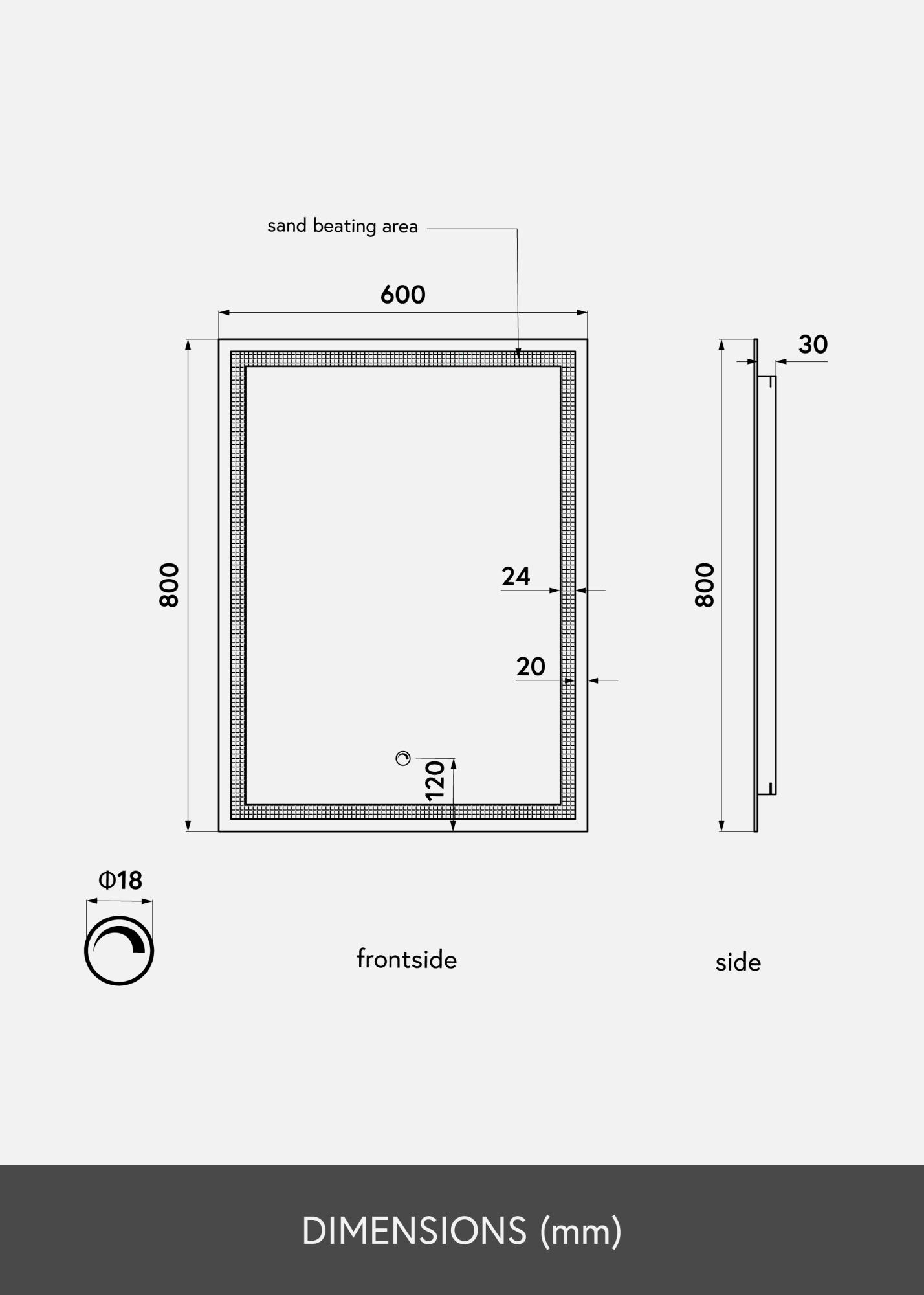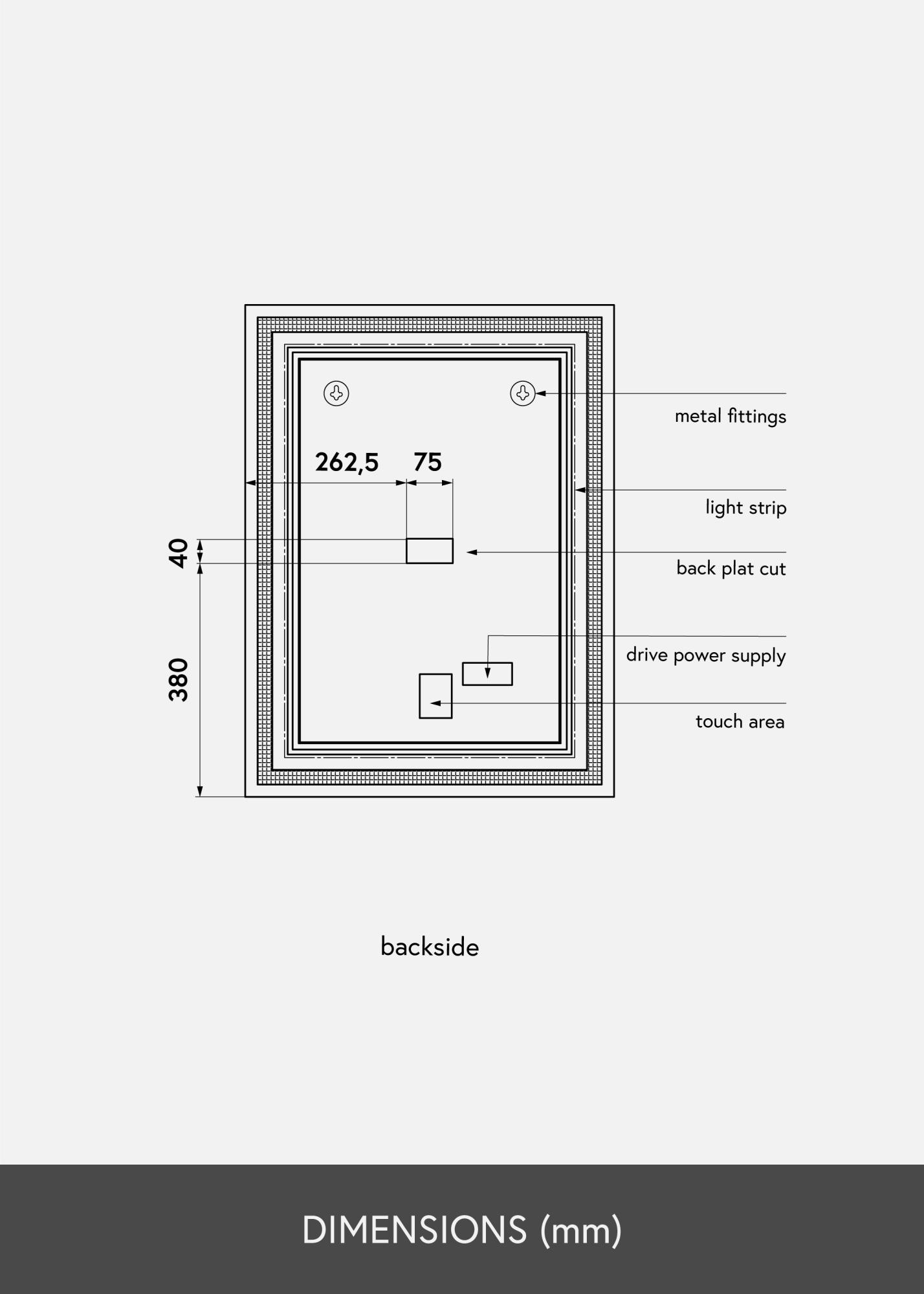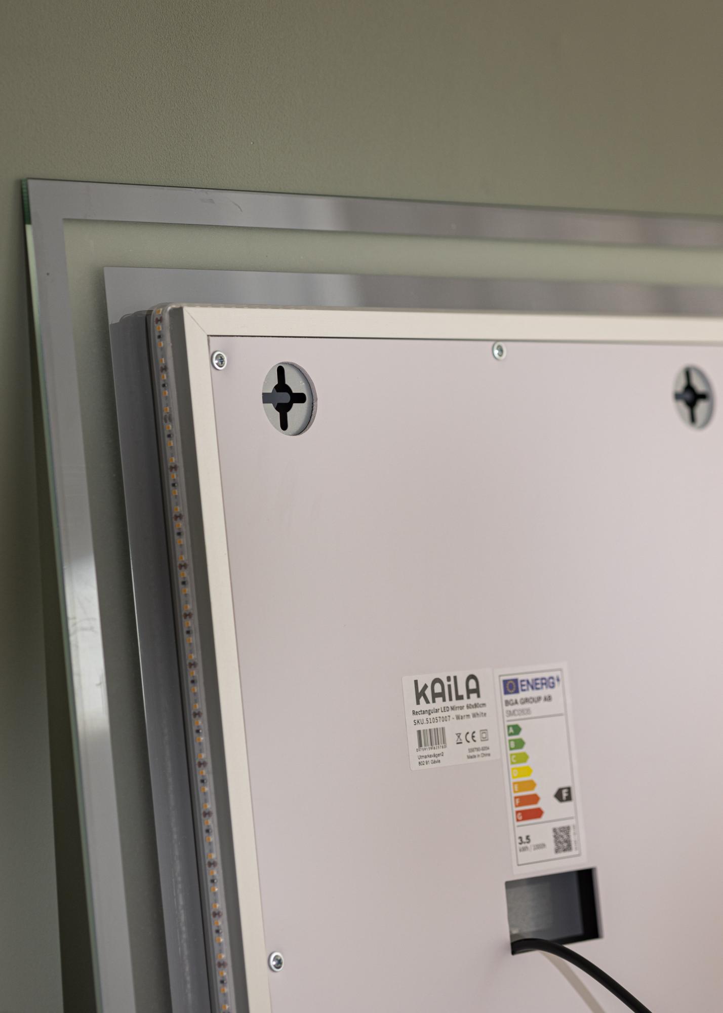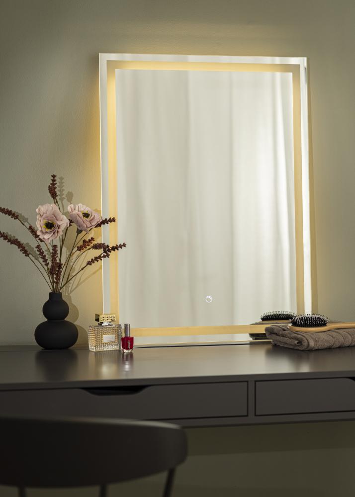 Se desideri uno specchio moderno e minimalista con illuminazione, questo è lo specchio per te. È dotato di lampade a LED a basso consumo energetico che forniscono una luce uniforme, perfetta per applicare il trucco o semplicemente specchiarti durante il giorno. L'illuminazione è posizionata sul retro dello specchio, ma si illumina attraverso come una cornice elegante sul fronte. Per regolare l'intensità luminosa, tieni premuto il pulsante touch nella parte inferiore dello specchio per alcuni secondi.