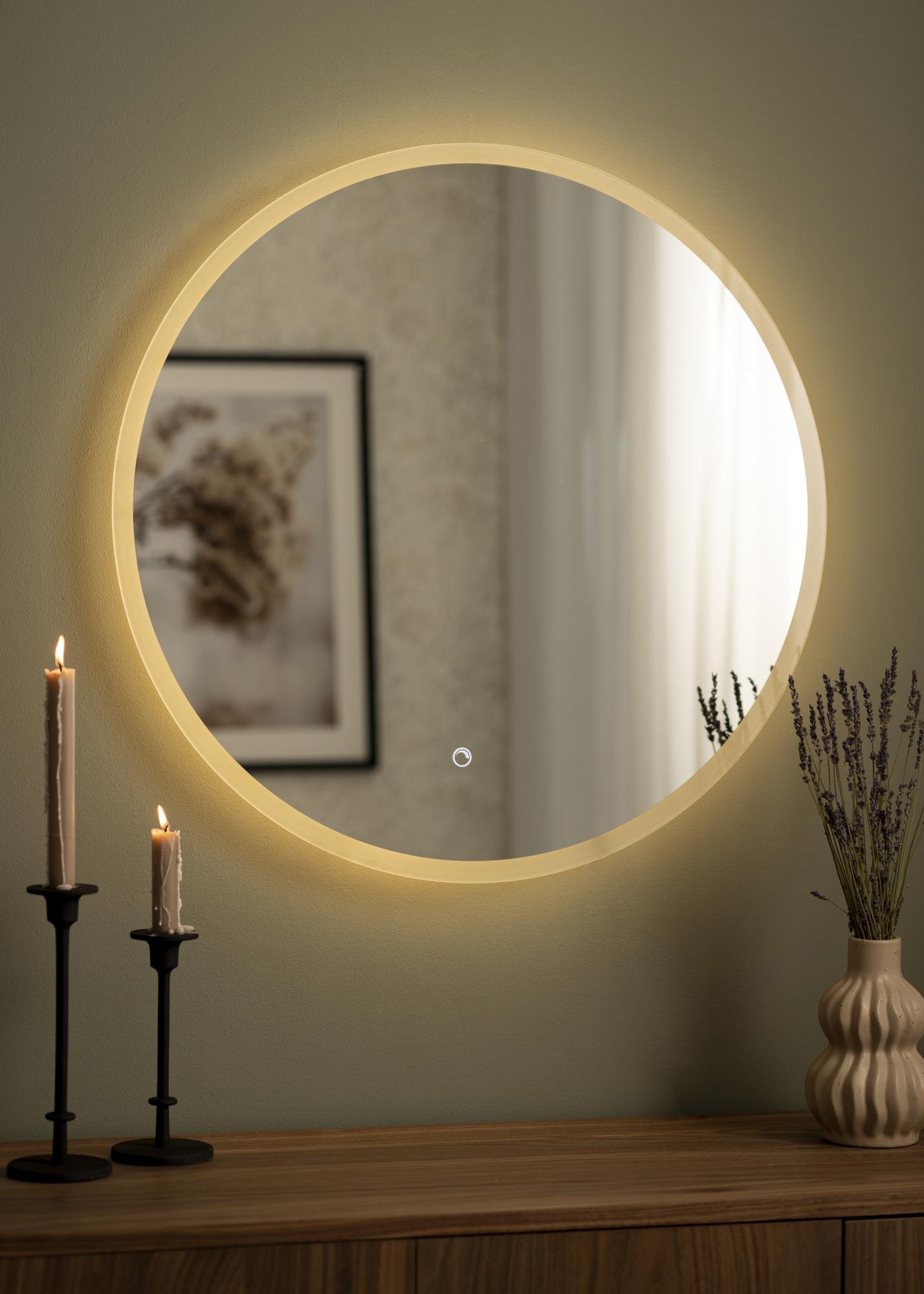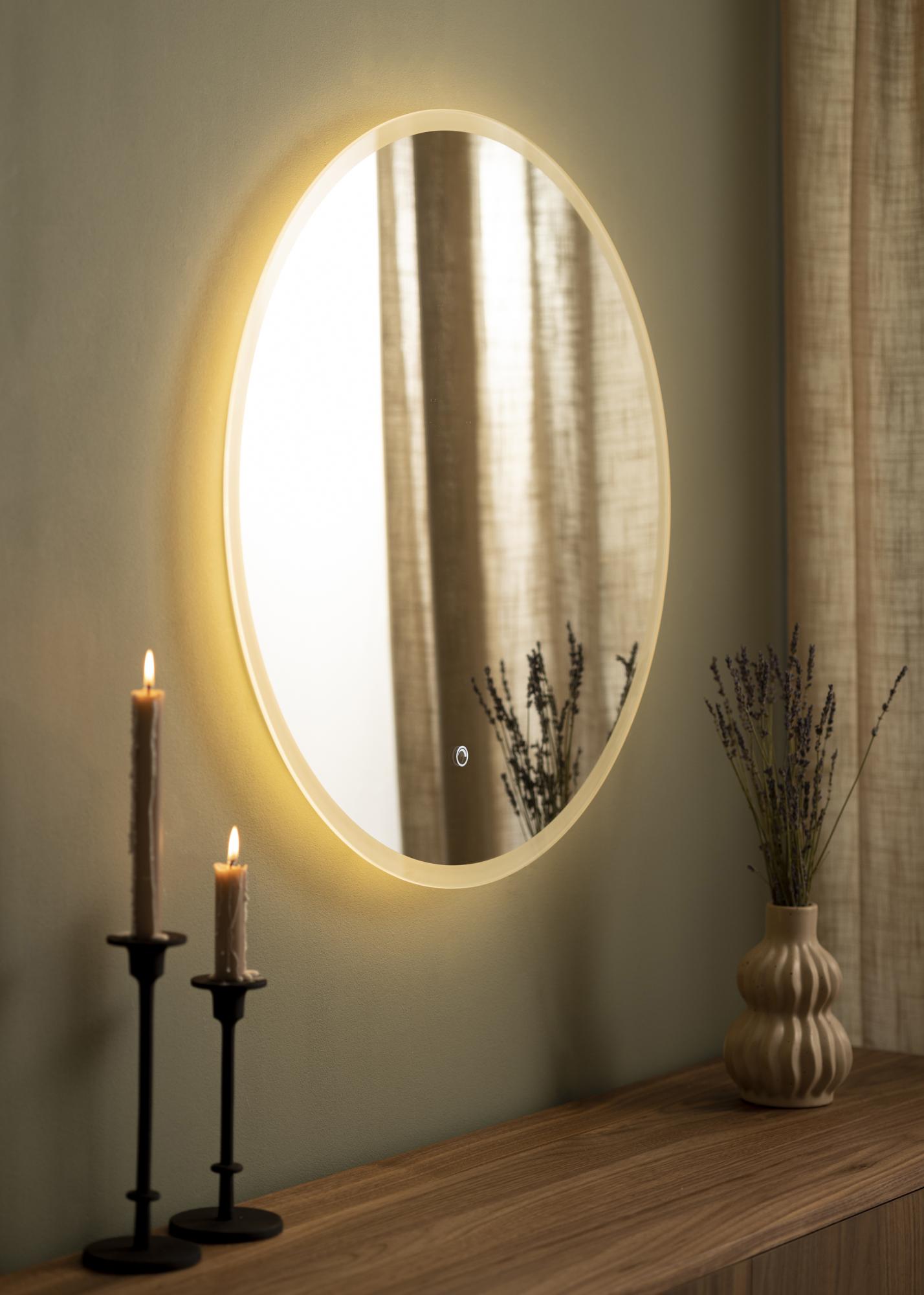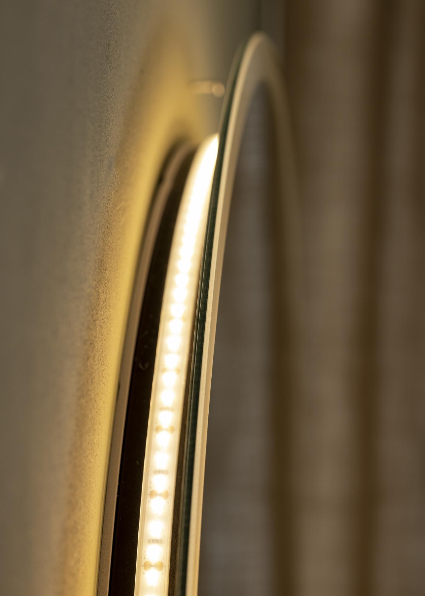 Questo è un classico e elegante specchio da bagno rotondo. Lo specchio è incorniciato da un bordo opaco con illuminazione a LED integrata. La luce si accende dietro lo specchio e crea una piacevole luce bianco caldo in avanti a 3000K. La luce è dimmerabile e puoi facilmente regolare l'intensità della luce tenendo premuto il pulsante per alcuni secondi. La prossima volta che accendi la luce, lo specchio ricorderà l'intensità luminosa impostata. Lo specchio ha dei supporti da parete inclusi ed è approvato per il bagno. Lo specchio da bagno è destinato all'installazione fissa e viene collegato a un interruttore di alimentazione.