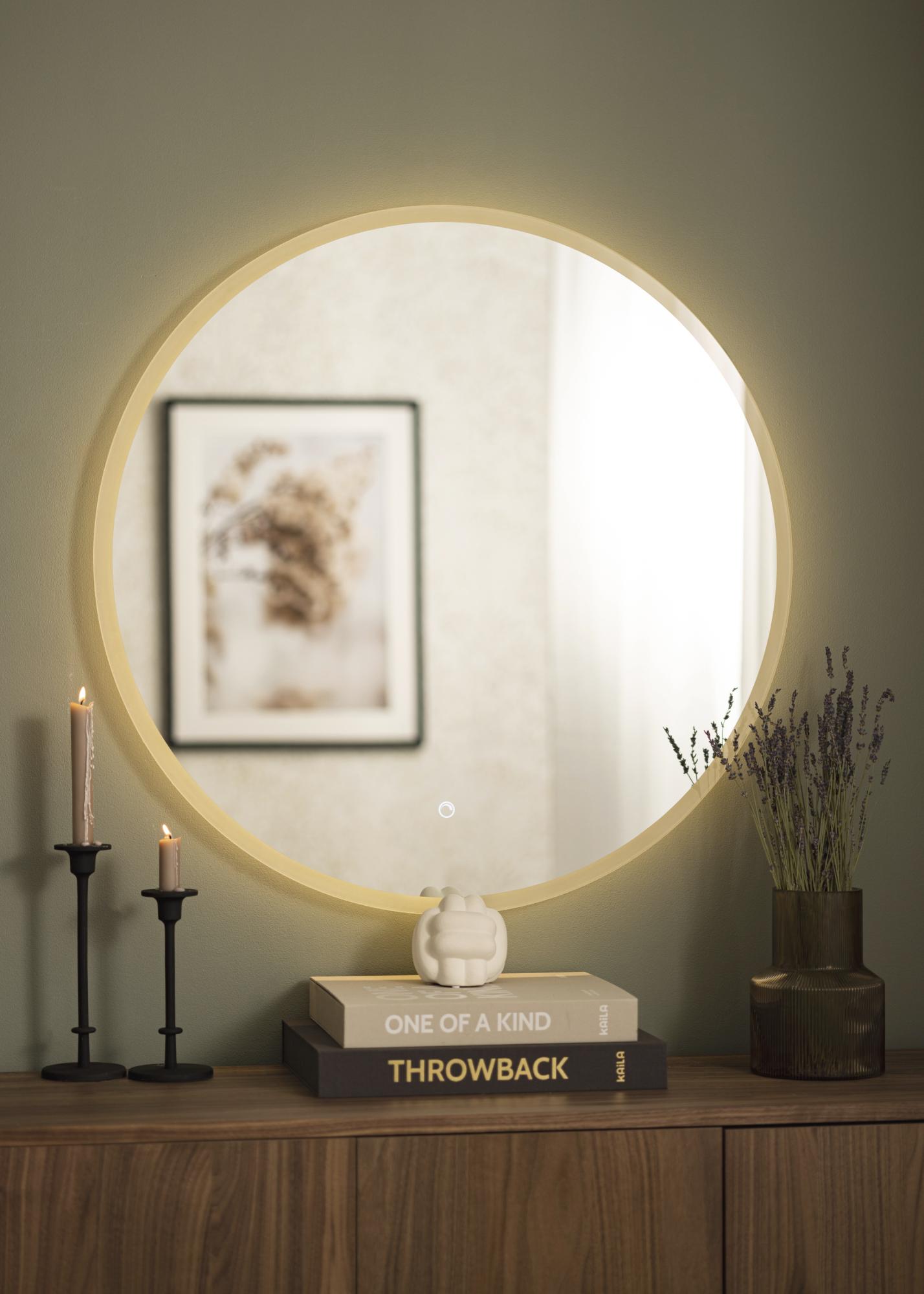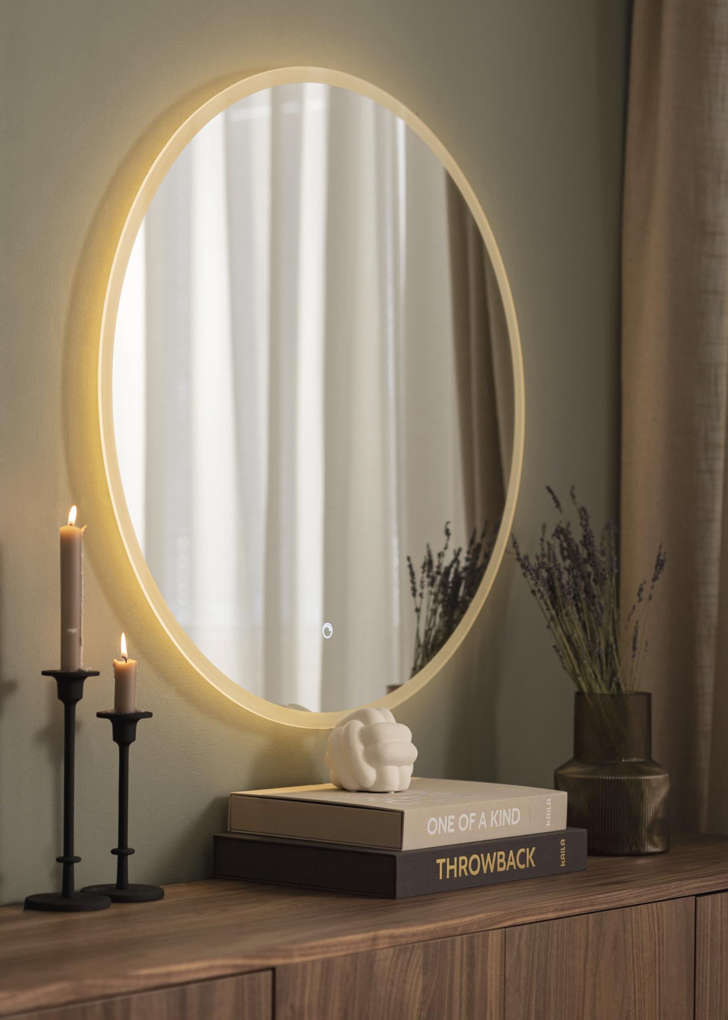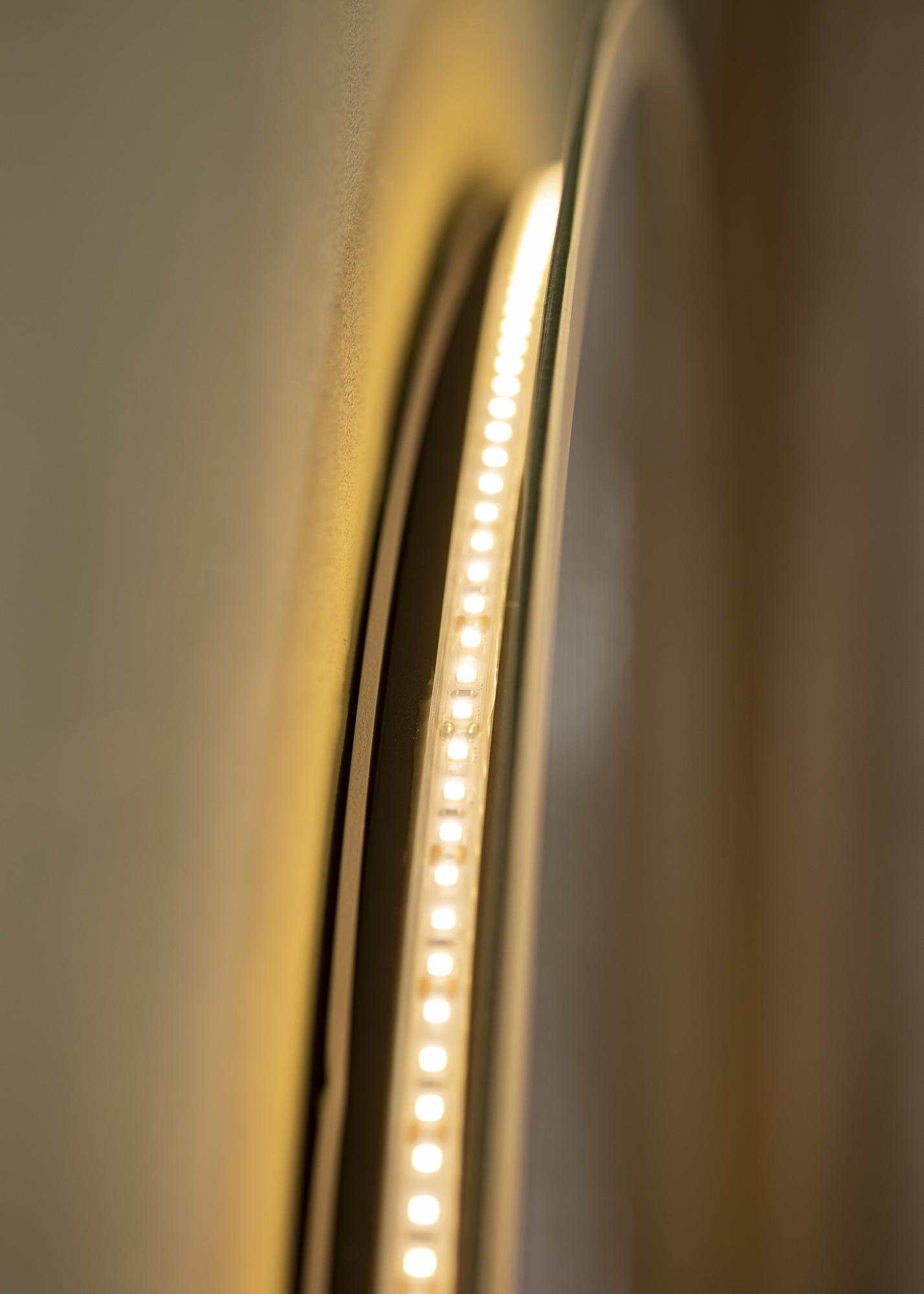 Questo è un classico e elegante specchio da bagno rotondo. Lo specchio è incorniciato da un bordo opaco con illuminazione a LED integrata. La luce si accende dietro lo specchio e crea una piacevole luce bianco caldo in avanti a 3000K. La luce è dimmerabile e puoi facilmente regolare l'intensità della luce tenendo premuto il pulsante per alcuni secondi. La prossima volta che accendi la luce, lo specchio ricorderà l'intensità luminosa impostata. Lo specchio ha dei supporti da parete inclusi ed è approvato per il bagno. Lo specchio da bagno è destinato all'installazione fissa e viene collegato a un interruttore. Per far funzionare correttamente lo specchio, deve essere collegato a un interruttore normale, non a un dimmer.