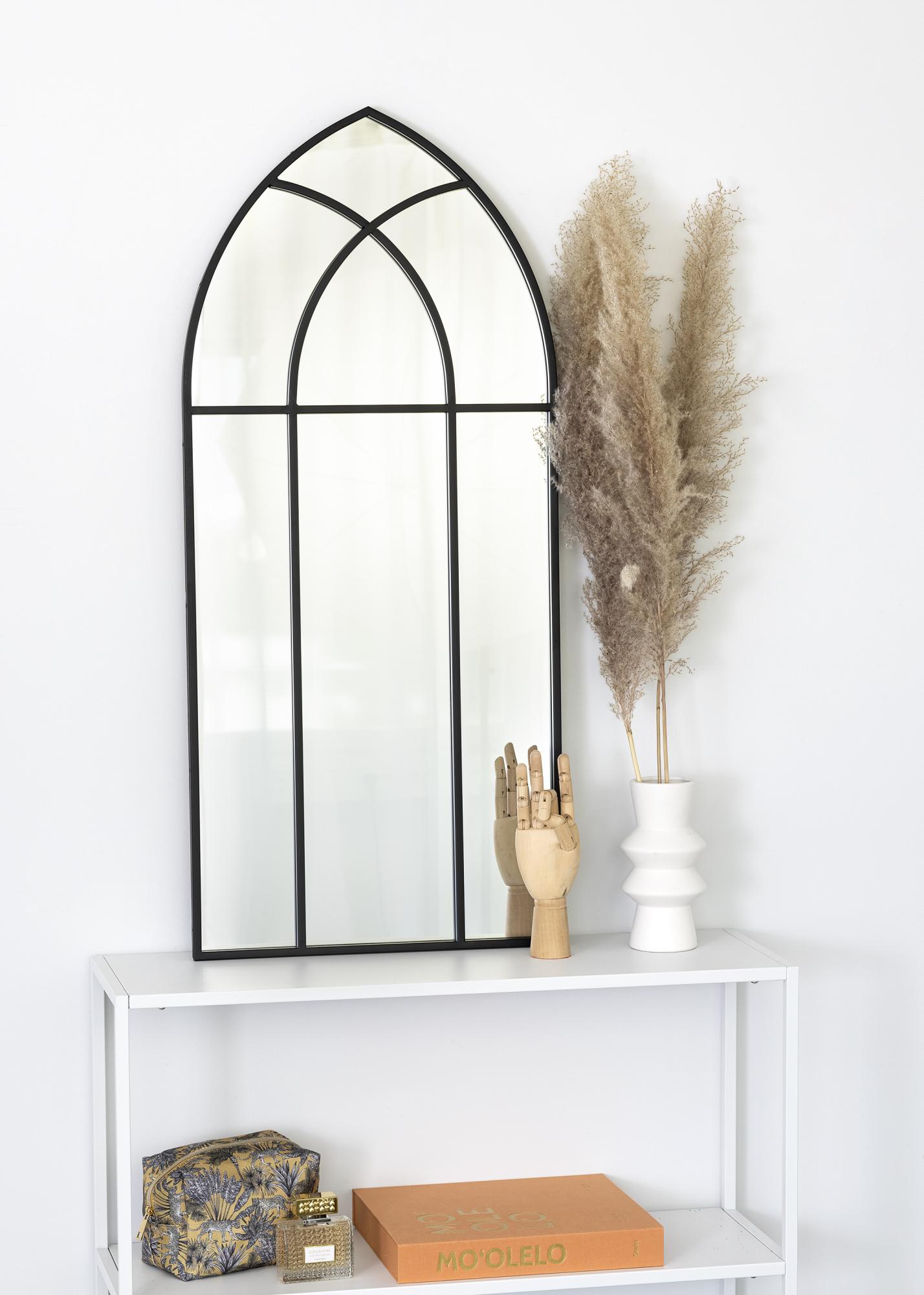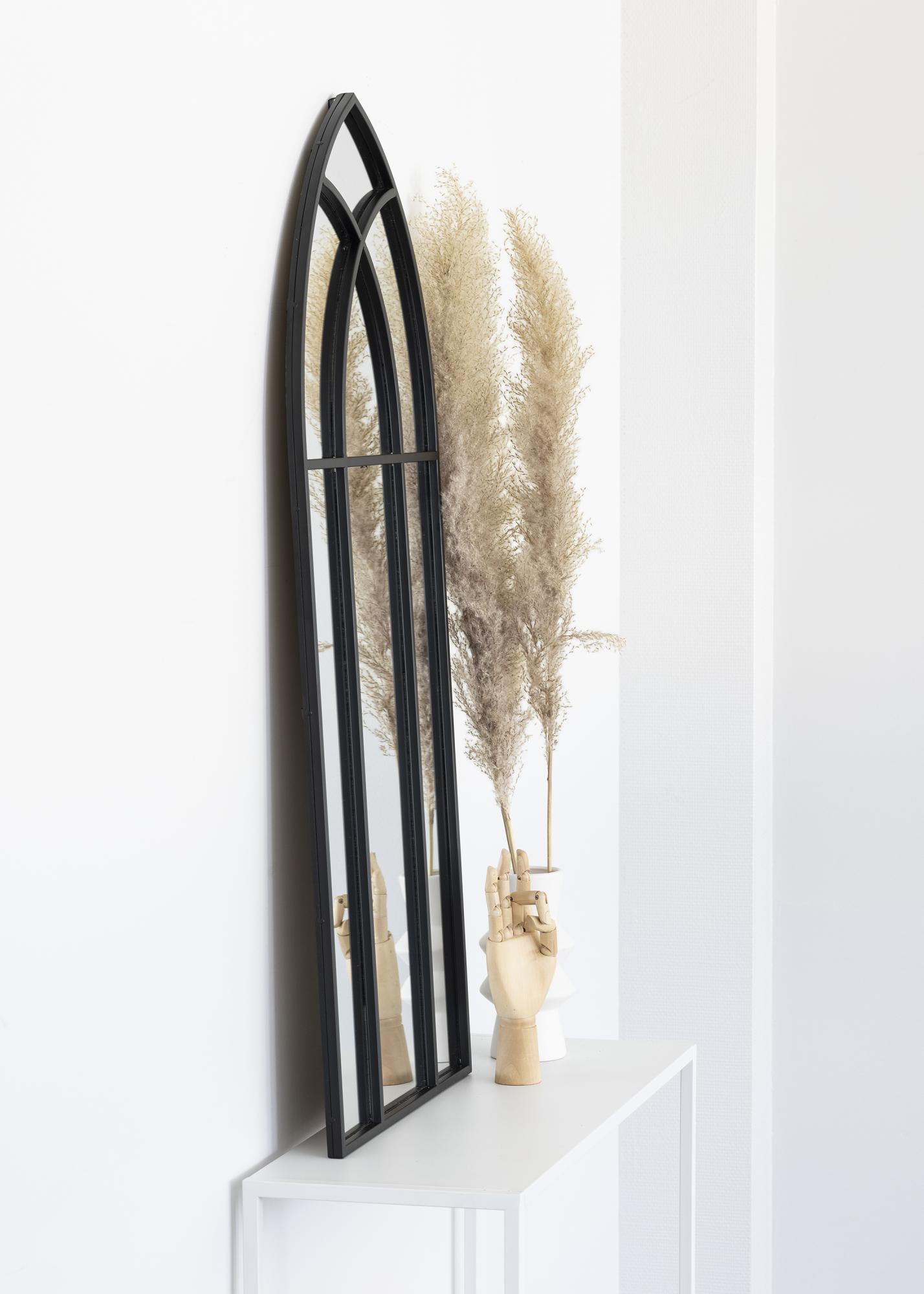 Questo è uno specchio molto decorativo che crea immediatamente un'atmosfera più romantica nella stanza in cui viene posizionato! Lo specchio ha un design che ricorda una finestra da giardino e allo stesso tempo ha un carattere gotico. La forma affascinante dello specchio lo renderà un punto focale nella tua casa! Lo specchio misura 45x100 e ha un motivo decorativo di sottili linee nere in metallo.