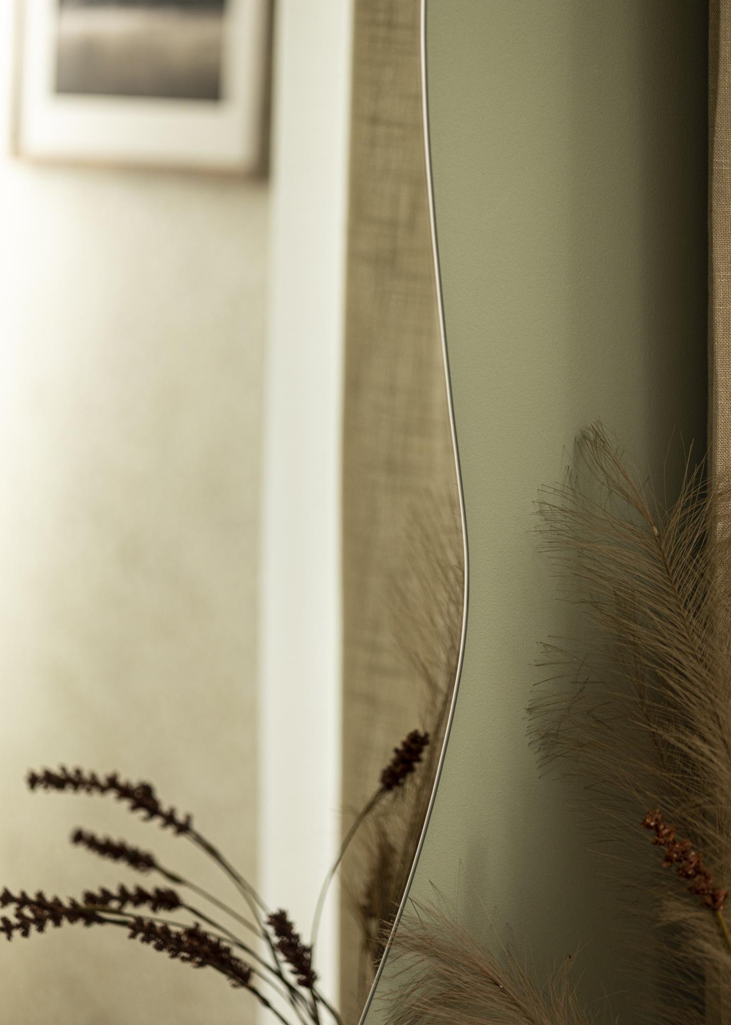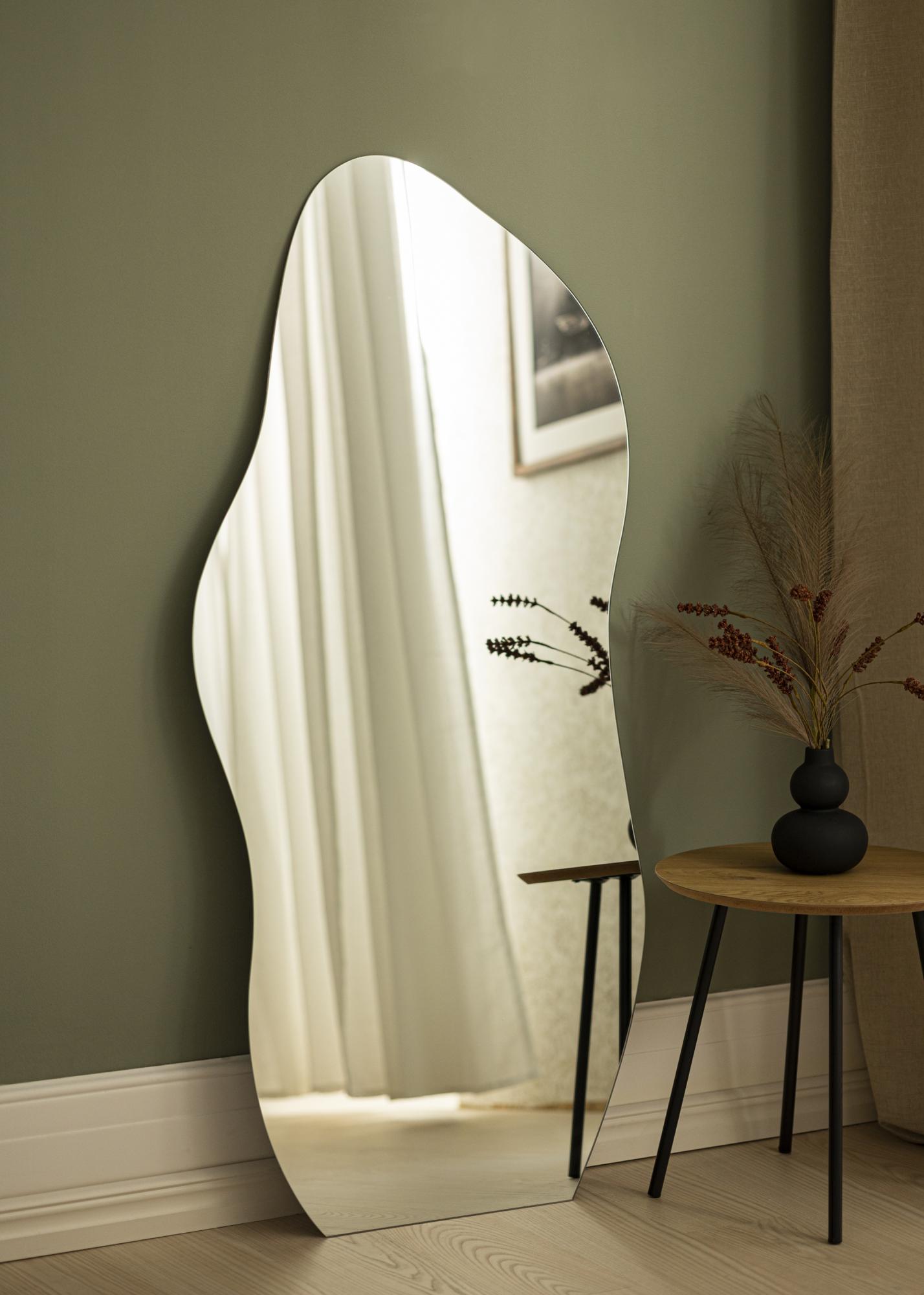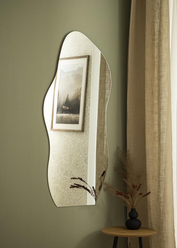 Questo è uno specchio da parete dal design trendy, con lati dalla forma morbida e ondulata. Il bordo inferiore è dritto, rendendo lo specchio particolarmente elegante da appendere sopra un mobile, dove il bordo inferiore dello specchio diventa una linea parallela alla parte superiore del comò o del tavolino. Lo specchio ha supporti per la parete sul retro e viene montato sulla parete in posizione verticale.
