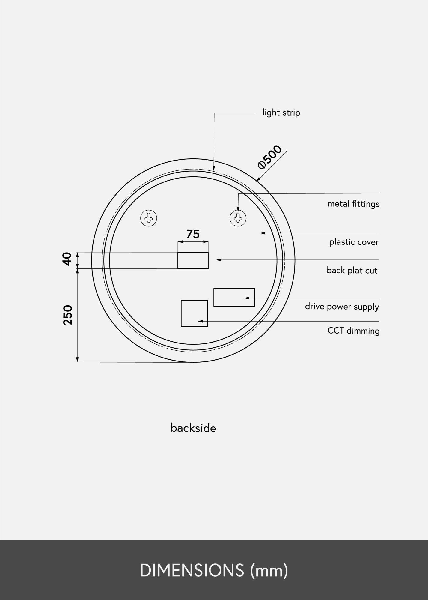 Lo specchio è approvato per il bagno, ma il suo design senza tempo ed elegante si adatta anche bene ad altre pareti della casa. Lo specchio ha un diametro di 50 cm, è solo 3 cm di profondità e ha supporti da parete. Lo specchio è destinato all'installazione fissa e viene collegato a un interruttore. Per far funzionare correttamente lo specchio, deve essere collegato a un interruttore normale, non a un dimmer.