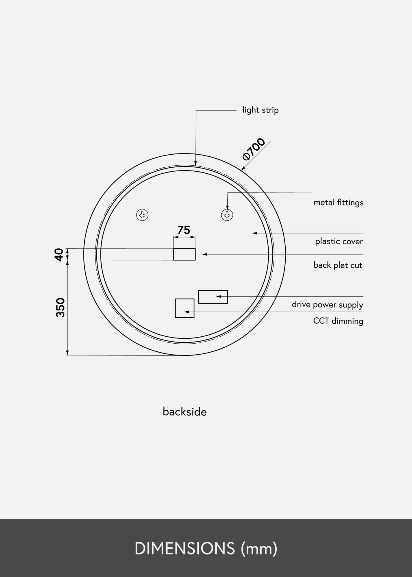 Lo specchio è approvato per il bagno, ma il suo design senza tempo ed elegante si adatta anche bene ad altre pareti della casa. Lo specchio ha un diametro di 70 cm, è solo 3 cm di profondità e ha supporti da parete. Lo specchio è destinato all'installazione fissa e viene collegato a un interruttore. Per far funzionare correttamente lo specchio, deve essere collegato a un interruttore normale, non a un dimmer.