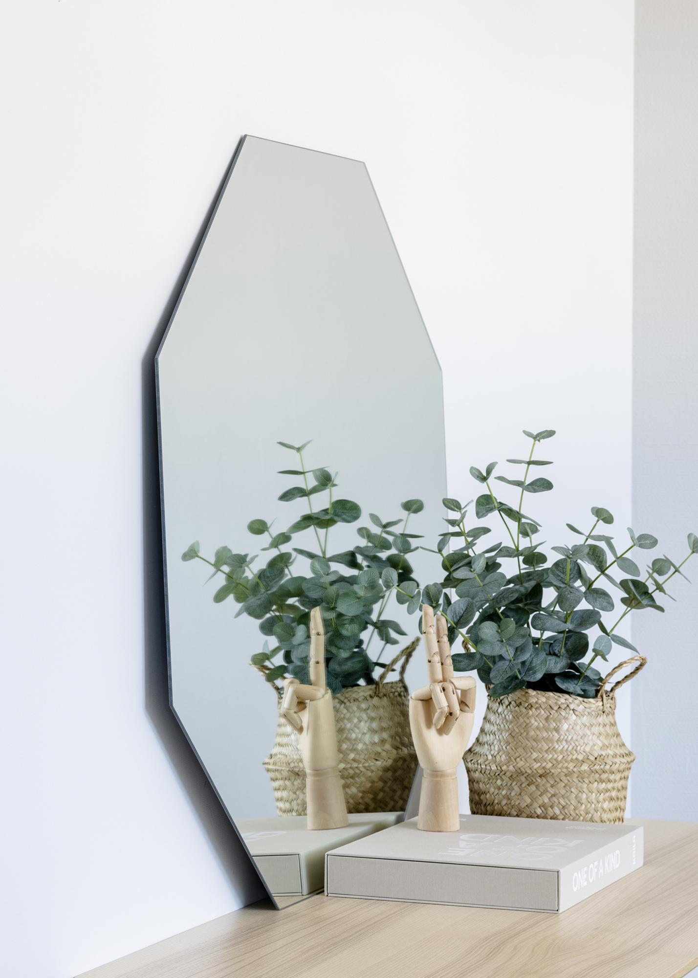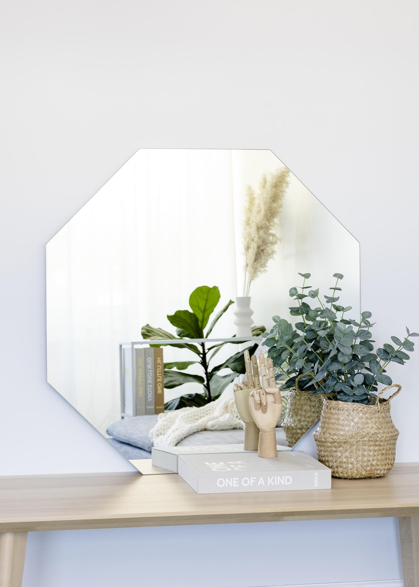 Questo elegante specchio di KAILA è perfetto per il soggiorno, l'ingresso o la camera da letto. La forma ottagonale senza cornice offre un perfetto equilibrio tra minimalismo e glamour. Arredando con diverse forme e materiali, puoi creare dinamicità nella tua casa, e questo specchio angolare offre un bel contrasto con altri mobili e dettagli d'arredo. Lo specchio ha un supporto da parete e può essere facilmente appeso al muro.