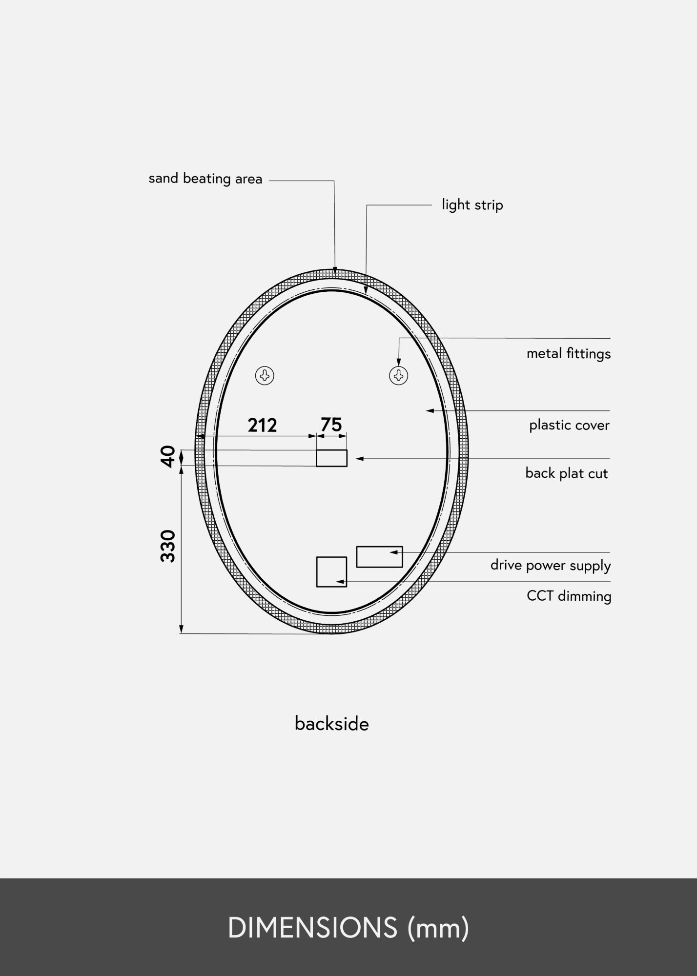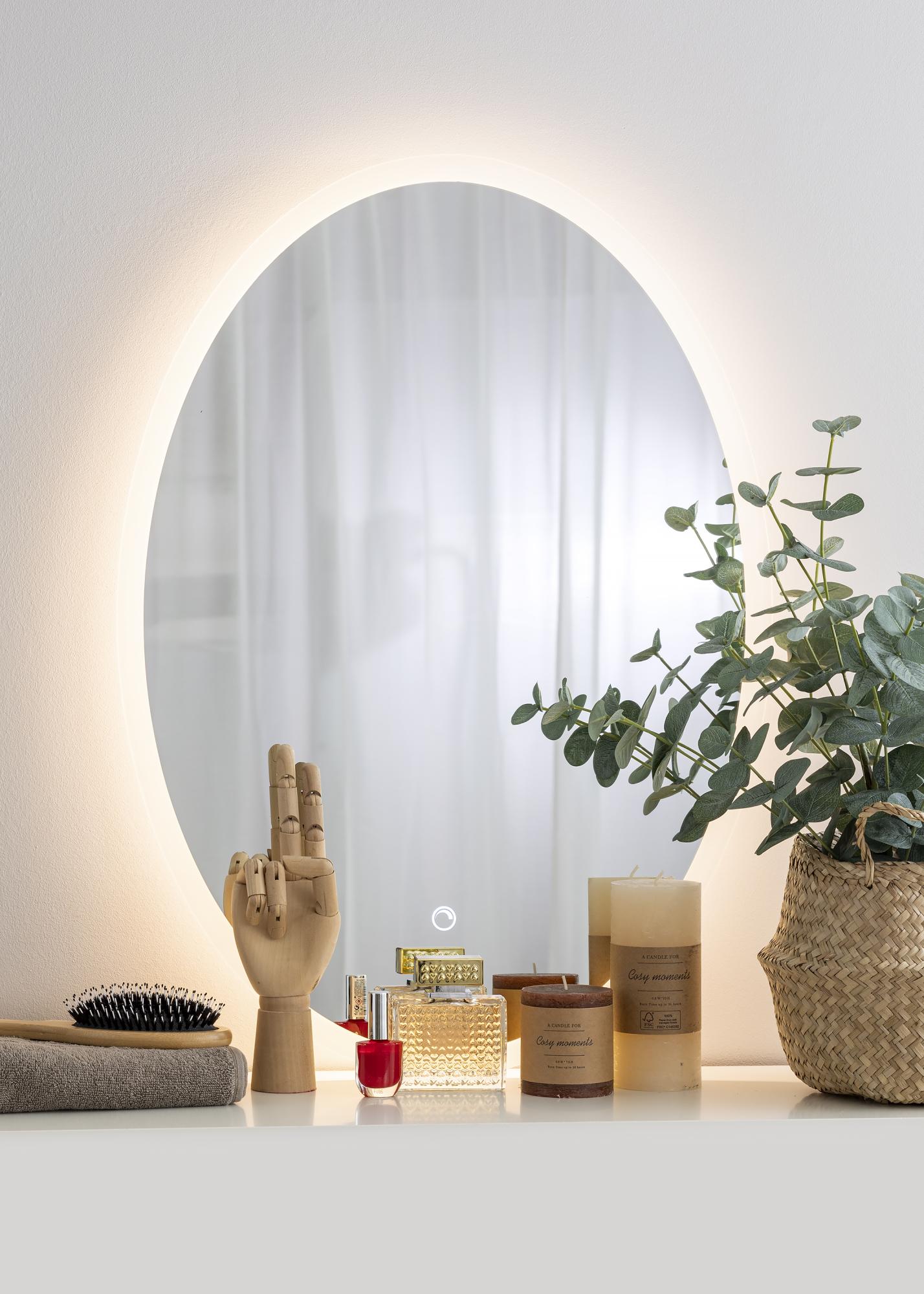 Questo è davvero uno specchio per il bagno dal design elegante, con la sua forma ovale e l'illuminazione LED integrata! L'illuminazione LED integrata è regolabile e la luminosità può essere facilmente regolata premendo il pulsante touch impermeabile sullo schermo. La luce si accende in una tonalità bianco caldo a 3000K dietro lo specchio e crea una bella luce in avanti. LED è una fonte di luce a basso consumo energetico che fornisce una luce uniforme e naturale. Lo specchio è approvato per il bagno. Lo specchio per il bagno è destinato all'installazione fissa e viene collegato a un interruttore. Per far funzionare correttamente lo specchio, deve essere collegato a un interruttore normale, non a un dimmer.