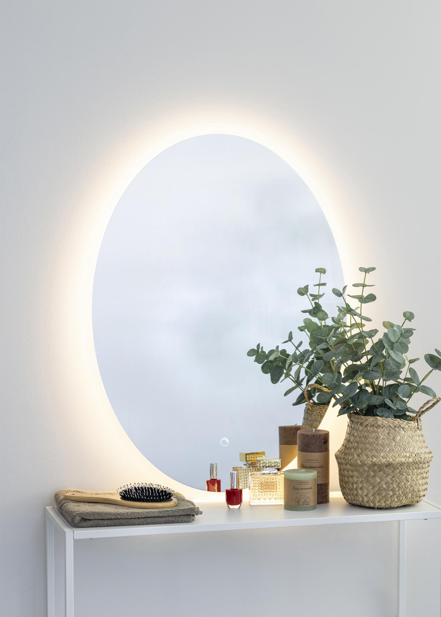 Questo è veramente uno specchio per il bagno dal design elegante, con la sua forma ovale e l'illuminazione a LED integrata! L'illuminazione a LED integrata è regolabile in intensità e si regola facilmente premendo il pulsante touch impermeabile sullo schermo. L'illuminazione si accende con una tonalità bianco caldo a 3000K dietro lo specchio e offre una bella luce in avanti. Il LED è una fonte di luce a basso consumo energetico che fornisce una luce uniforme e naturale. Lo specchio è approvato per il bagno. Lo specchio per il bagno è destinato all'installazione fissa e viene collegato a un interruttore. Per far funzionare correttamente lo specchio, deve essere collegato a un interruttore normale, non a un dimmer.