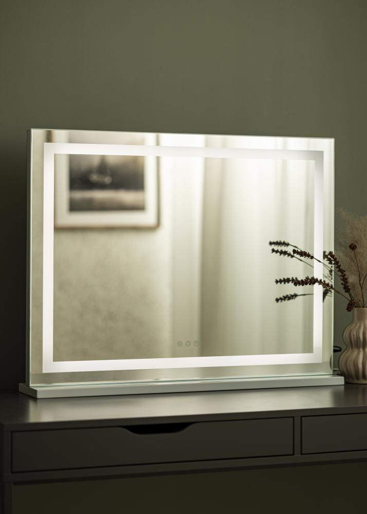 Con questo specchio per il trucco, il tuo angolo trucco può diventare più lussuoso in un istante! Il design elegante, con una forma rettangolare con illuminazione a LED che incornicia la superficie dello specchio di 80x60 cm, fa sì che questo specchio si adatti bene in ogni stanza. Lo specchio può essere montato a parete o posizionato in posizione orizzontale su un tavolo. Questo rende lo specchio perfetto per coloro che non desiderano forare la parete. Questo specchio trucco con luci è perfetto per chi desidera un’illuminazione precisa e uno stile raffinato nella propria postazione beauty.