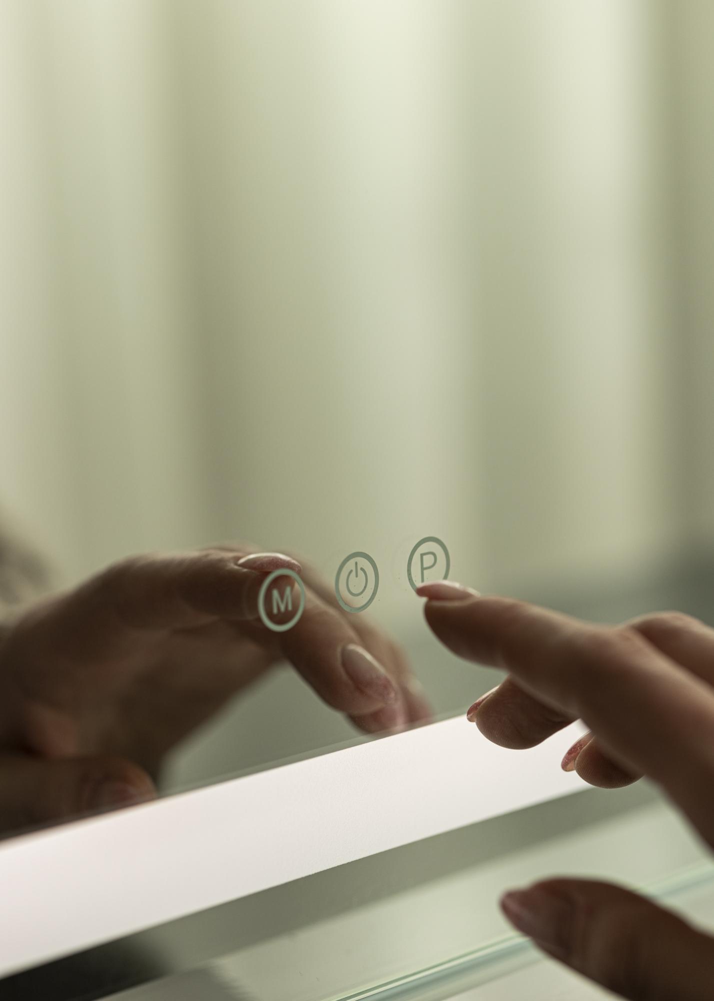 Nella parte inferiore dello specchio ci sono tre pulsanti touch - uno per accendere e spegnere l'illuminazione e due per regolare le impostazioni di luminosità. Il pulsante "M" regola la temperatura del colore della luce tra 3000K-6000K e il pulsante "P" regola l'intensità. In altre parole, puoi impostare l'illuminazione perfetta per ogni occasione.