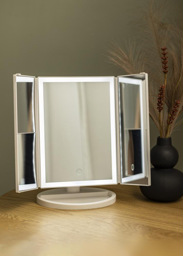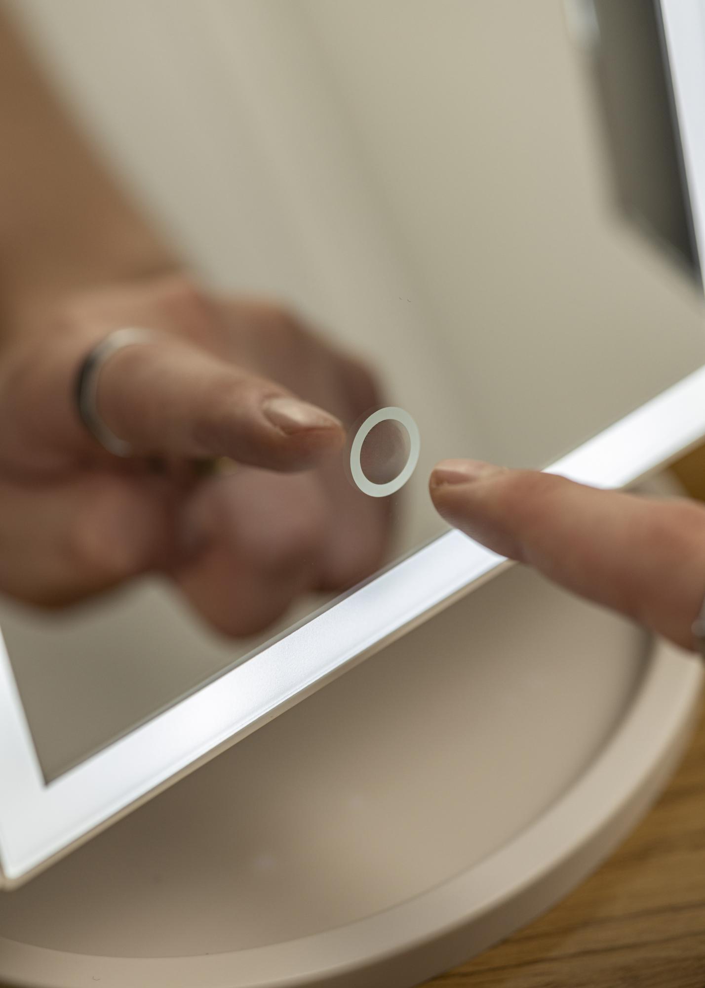 Uno specchio da trucco elegante e alla moda su piedistallo con quattro specchi diversi e illuminazione a LED dimmerabile. Il lato sinistro dello specchio da trucco ha specchi ingranditori con zoom 2x e 3x. L'illuminazione a LED integrata incornicia elegantemente lo specchio più grande al centro e offre una piacevole luce bianca calda a 3000K. Puoi accendere l'illuminazione premendo il pulsante touch sullo schermo e regolare facilmente l'intensità della luce tenendo premuto il pulsante per alcuni secondi. Lo specchio misura 38x30 cm e può essere inclinato, offrendoti la possibilità di specchiarti da diverse angolazioni.