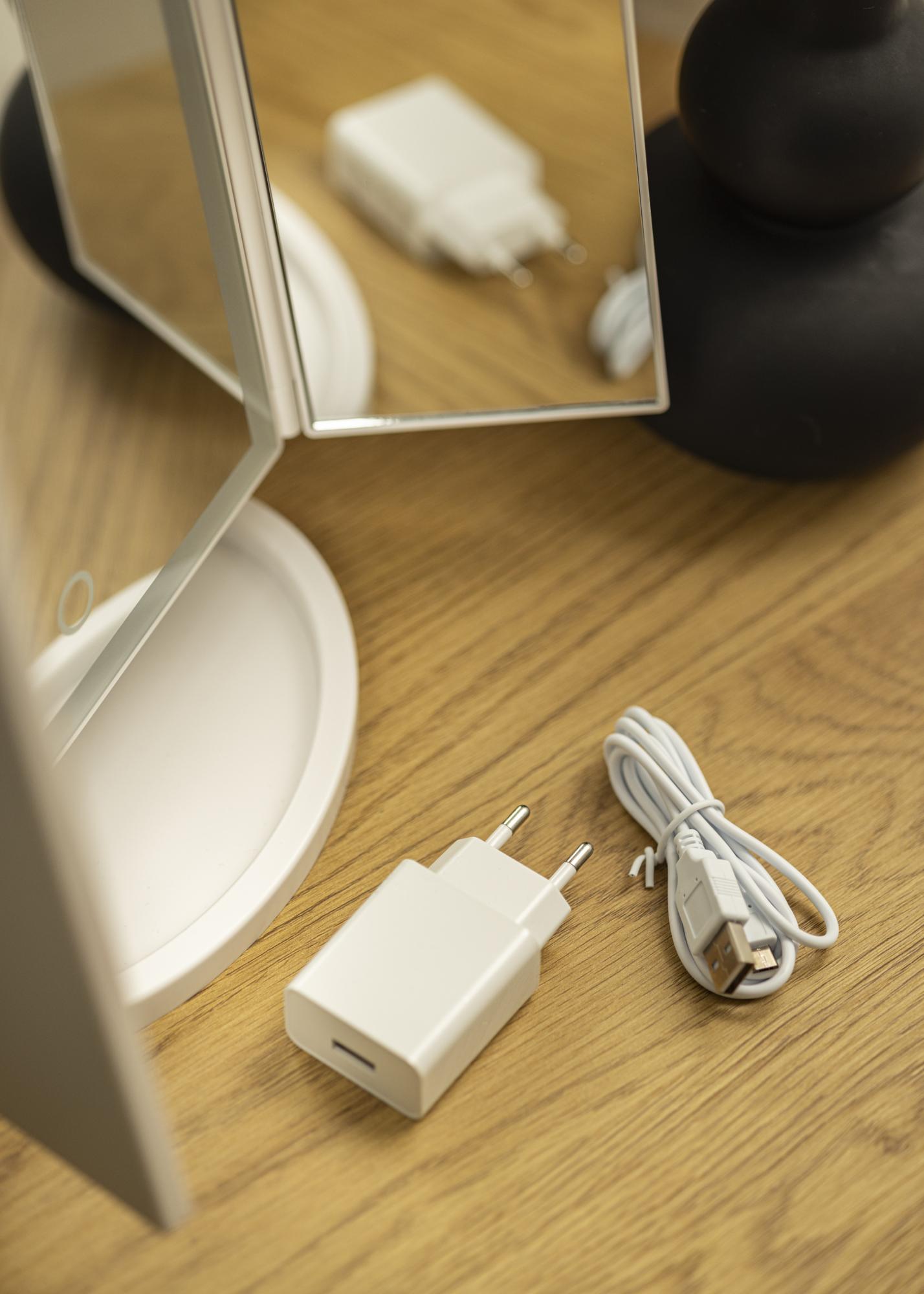 Lo specchio funziona con 4 batterie AA (non incluse) o può essere caricato tramite l'adattatore USB e il cavo USB inclusi.