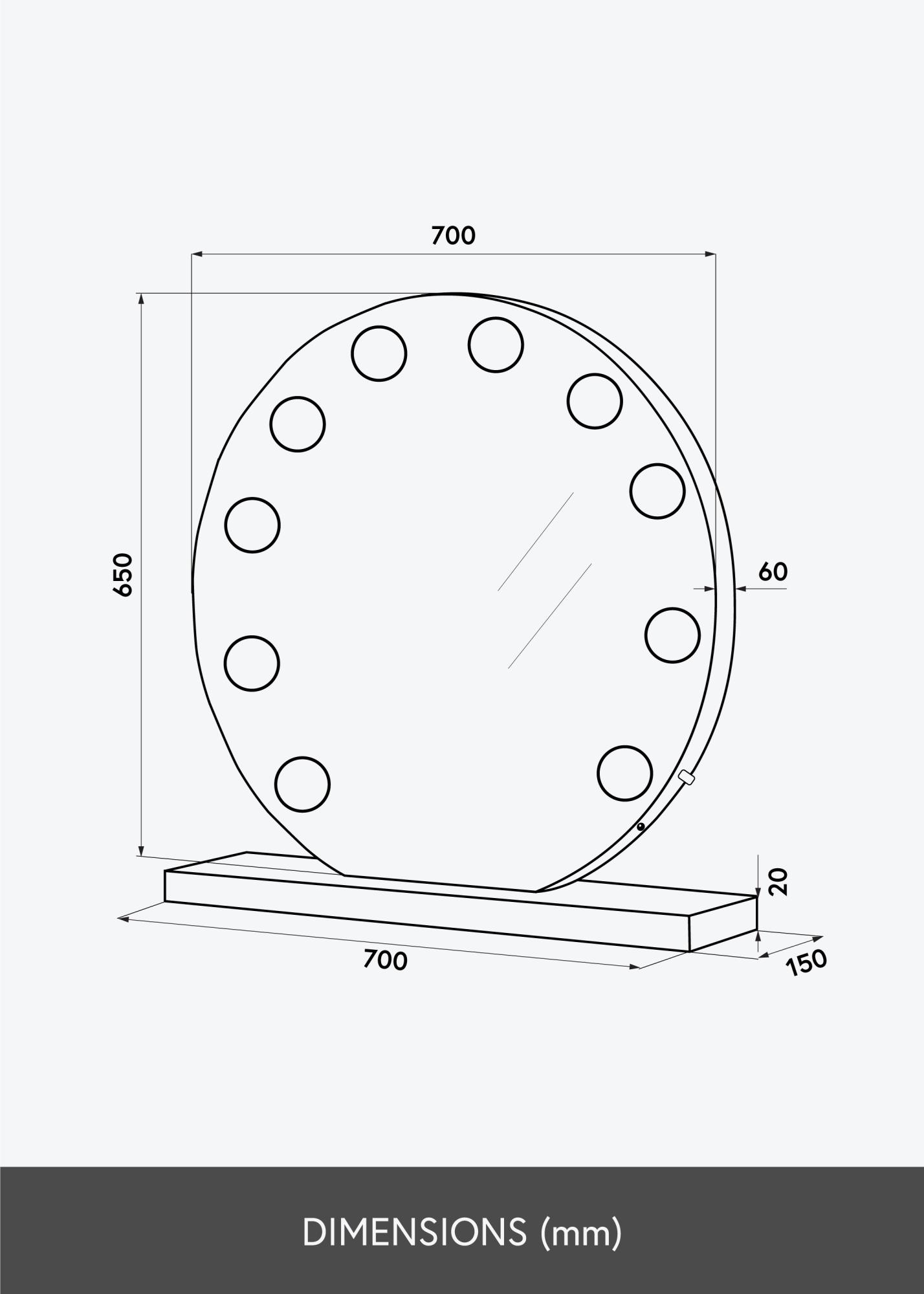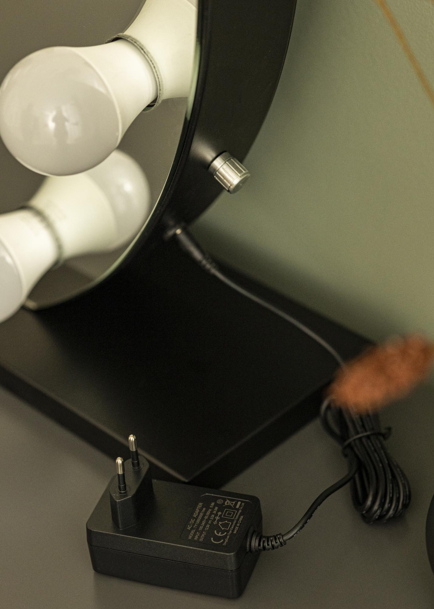 Questo specchio decorativo per il trucco ti offre stile e funzionalità in un unico pacchetto! Ha un design elegante, con una forma rotonda, un'elegante base nera e 10 lampadine con attacco E27, che incorniciano splendidamente la superficie dello specchio. La luce fredda bianca dell'illuminazione integrata è perfetta quando ti prepari per la giornata. Lo specchio può essere posizionato in verticale, il che ti consente di metterlo facilmente in camera da letto, soggiorno o ingresso, dove l'illuminazione dello specchio può anche fungere da sfondo luminoso. Lo specchio può anche essere montato a parete. Per regolare l'illuminazione si gira la manopola posizionata sul lato corto dello specchio.