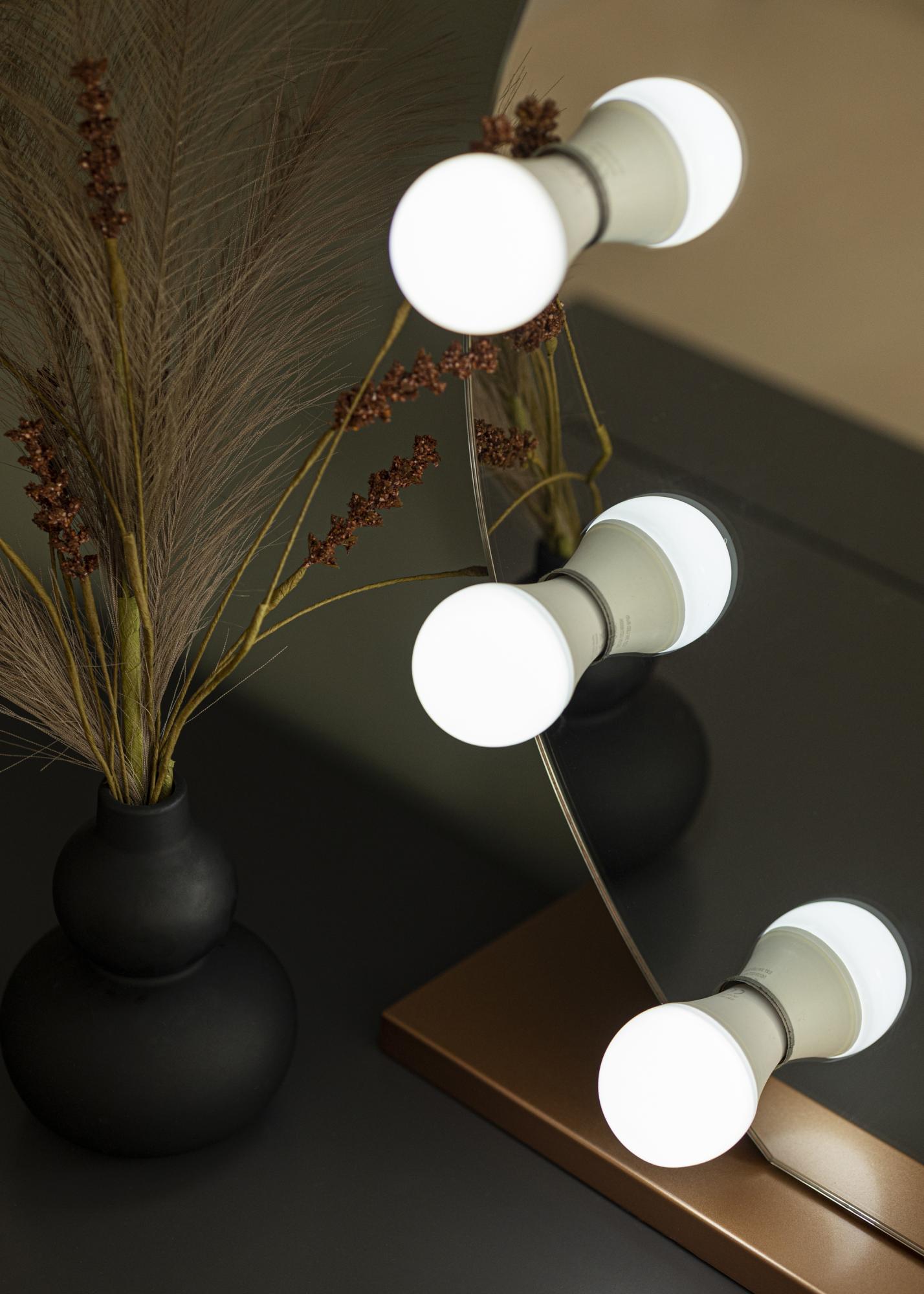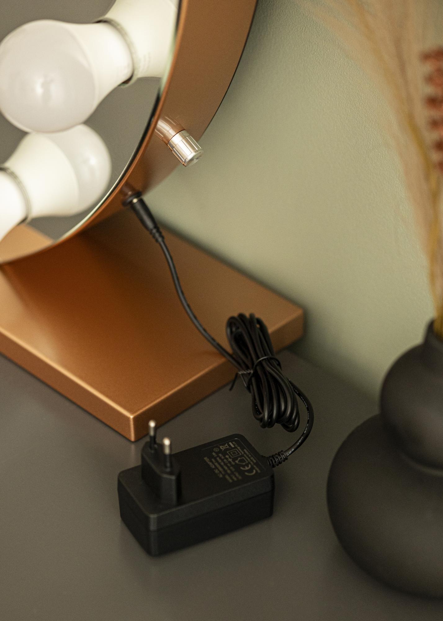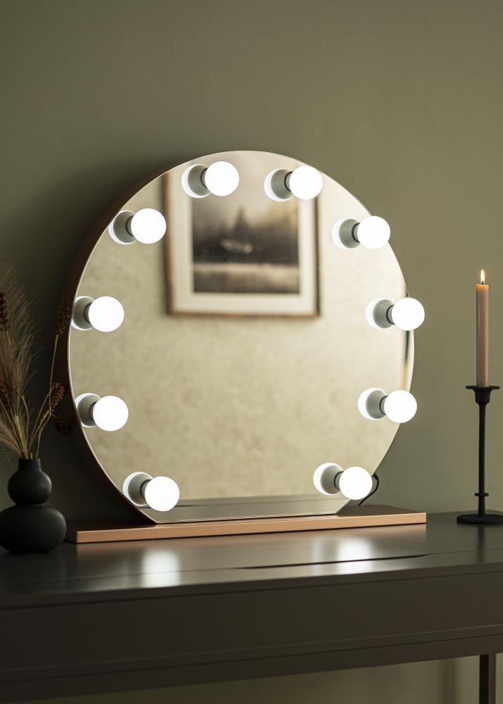 Lascia che questo specchio da trucco in oro rosa aggiunga un tocco di lusso alla tua stanza. Le 10 lampadine dell'illuminazione, posizionate come una cornice intorno alla superficie dello specchio, emettono una luce bianca, fredda e uniforme. Le lampadine hanno una base E27 e sono sostituibili. Grazie alla funzione di regolazione dell'intensità luminosa, puoi adattare la luminosità alle tue esigenze. Tutto quello che devi fare è girare la manopola sul lato corto dello specchio.