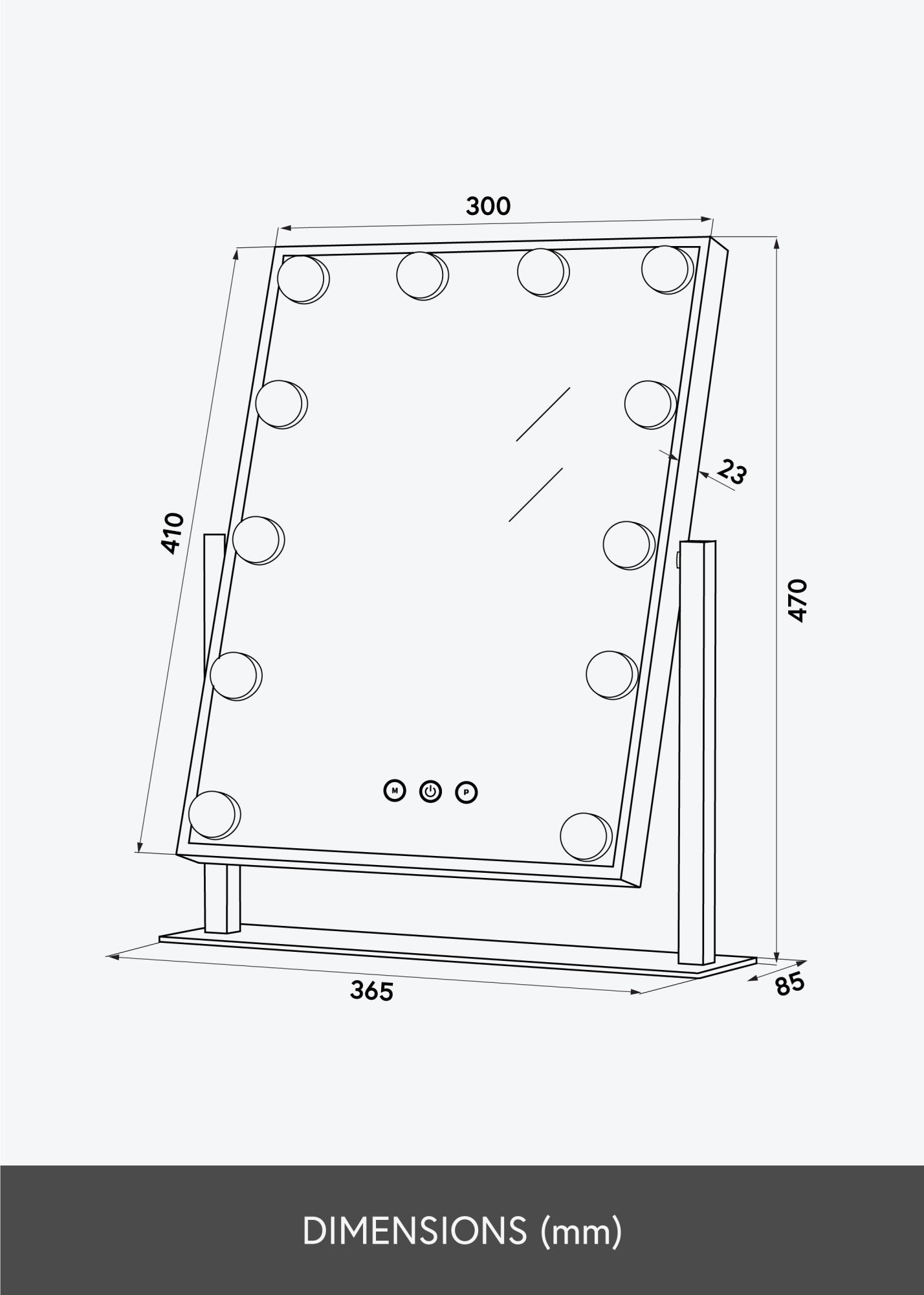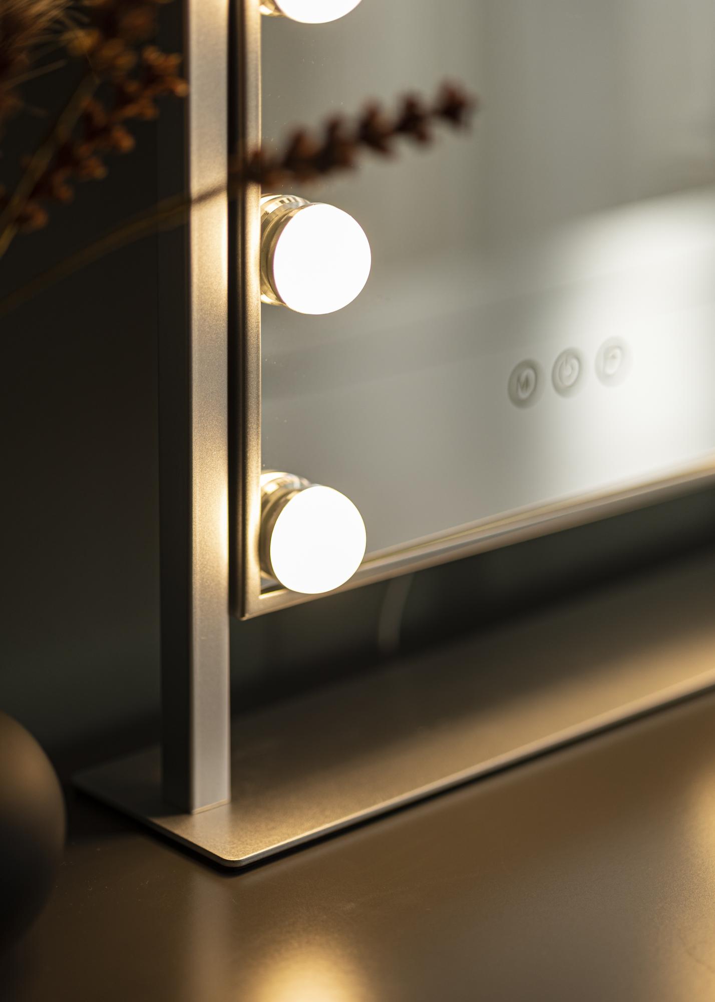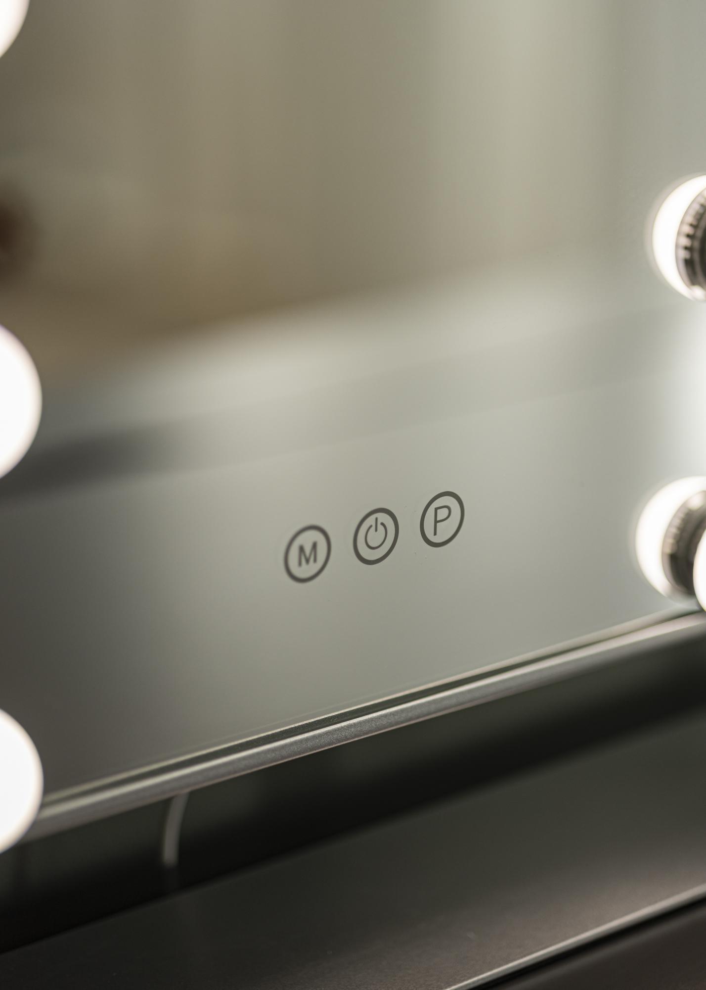Con uno specchio per il trucco di lusso con illuminazione integrata, puoi prepararti per il giorno in modo più piacevole. Questo specchio argentato ha un'illuminazione composta da 12 lampade a LED che incorniciano la superficie dello specchio, conferendo all'aspetto dello specchio una combinazione di minimalismo elegante e glamour hollywoodiano. Inoltre, l'illuminazione dello specchio è regolabile e puoi modificare la temperatura del colore e regolare la luminosità come desideri. Puoi farlo utilizzando i pulsanti touch sulla parte anteriore dello specchio, dove il pulsante "M" imposta la temperatura del colore e il pulsante "P" regola la luminosità. Puoi anche accendere e spegnere l'illuminazione dello specchio con un pulsante touch.