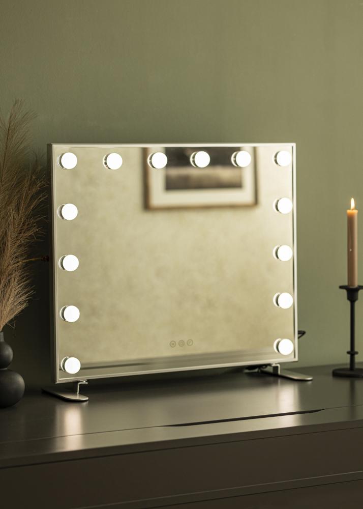 Questo è un elegante specchio per il trucco che diventerà un bel dettaglio d'arredo in tutte le stanze della casa. La sottile cornice argentata che circonda la superficie dello specchio di 60x50 cm dà un'espressione molto pulita, mentre le 14 lampade a LED tonde posizionate intorno ai bordi dello specchio danno una sensazione esclusiva. Su un lato dello specchio c'è una porta USB che ti permette di caricare i tuoi dispositivi intelligenti tramite connessione USB.