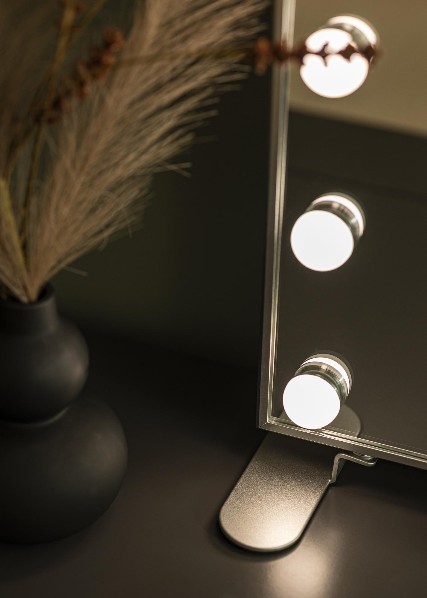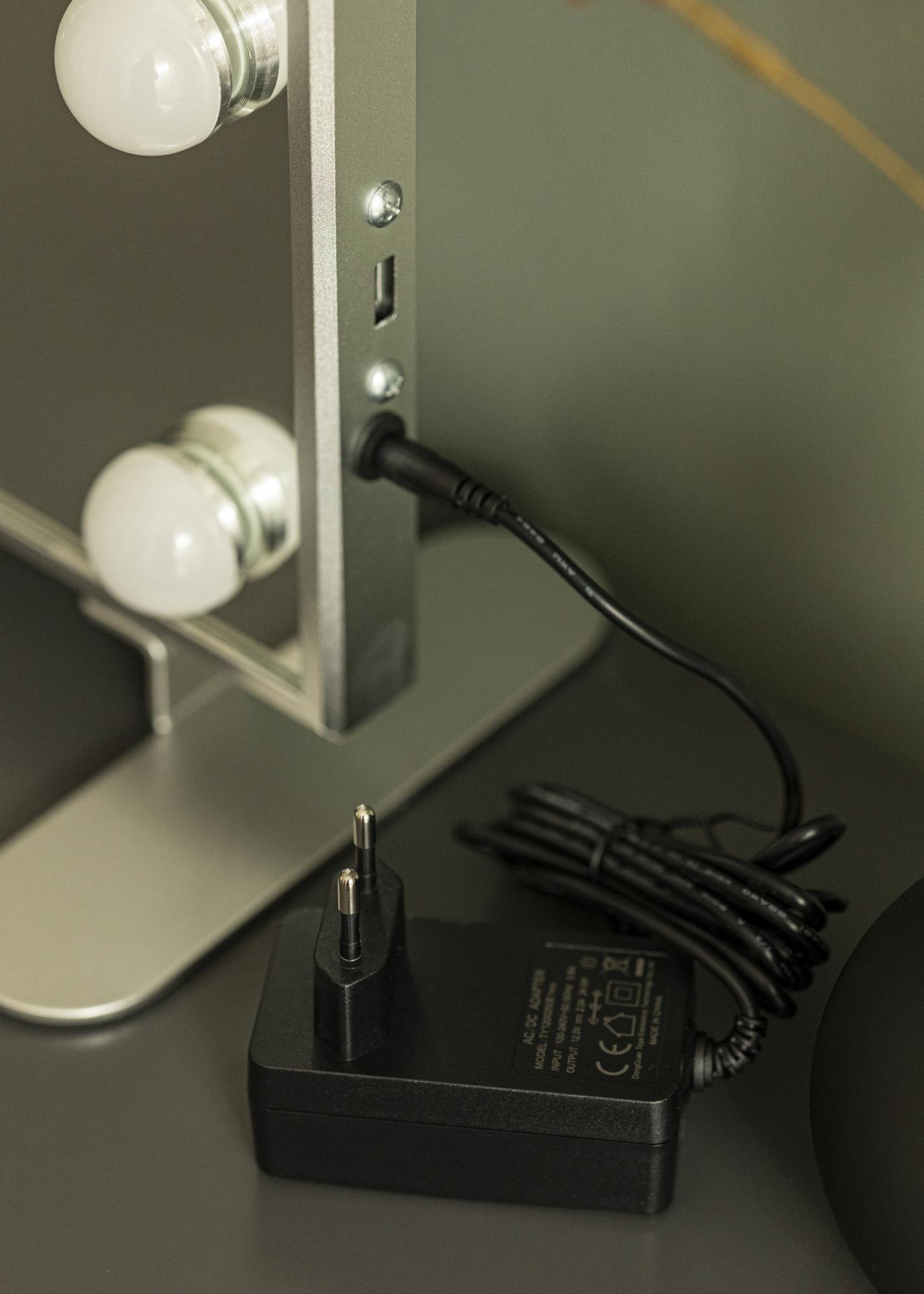 Il supporto argentato può essere smontato, il che significa che questo specchio può anche funzionare come un lussuoso specchio da parete. L'alimentazione avviene tramite presa.