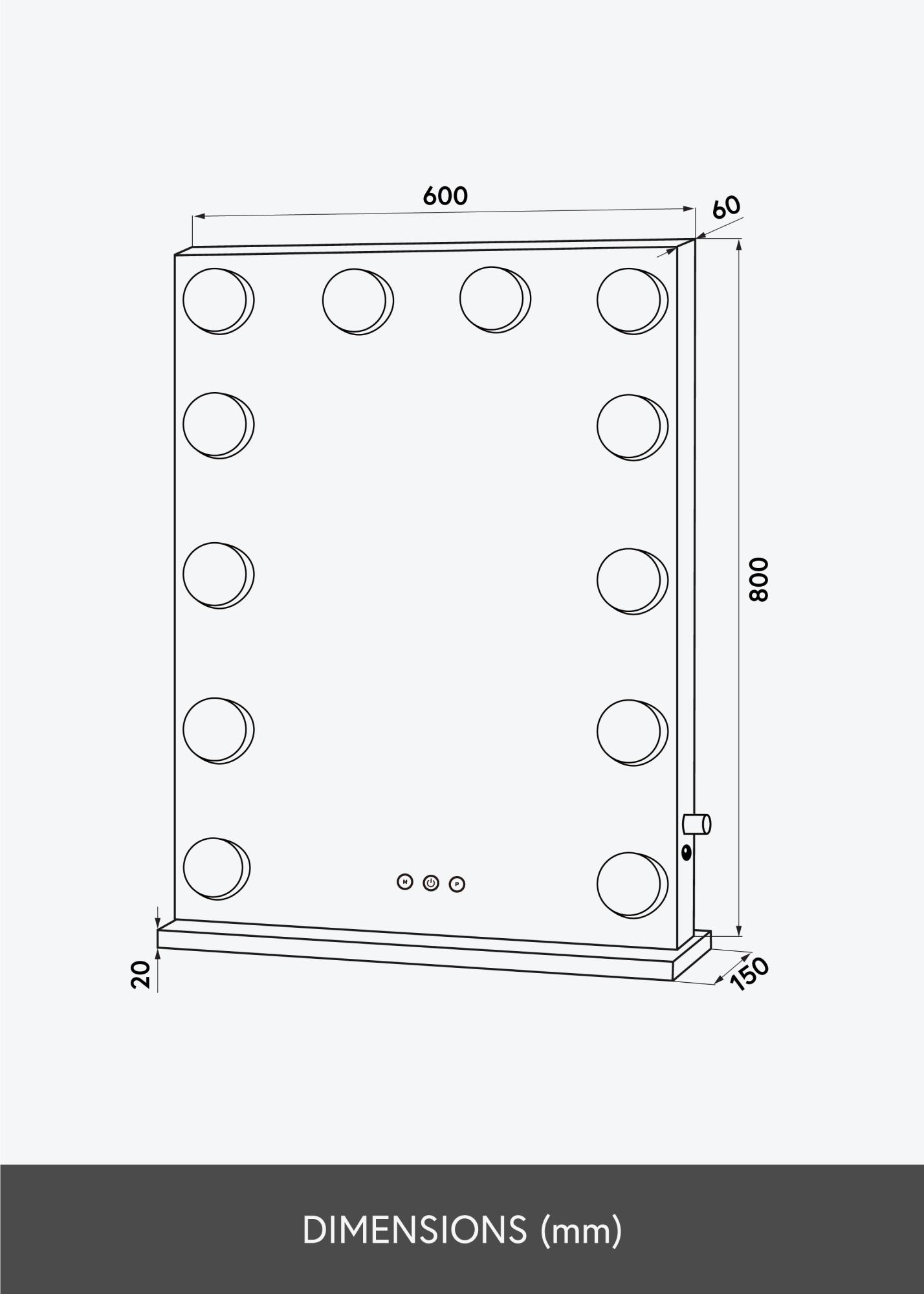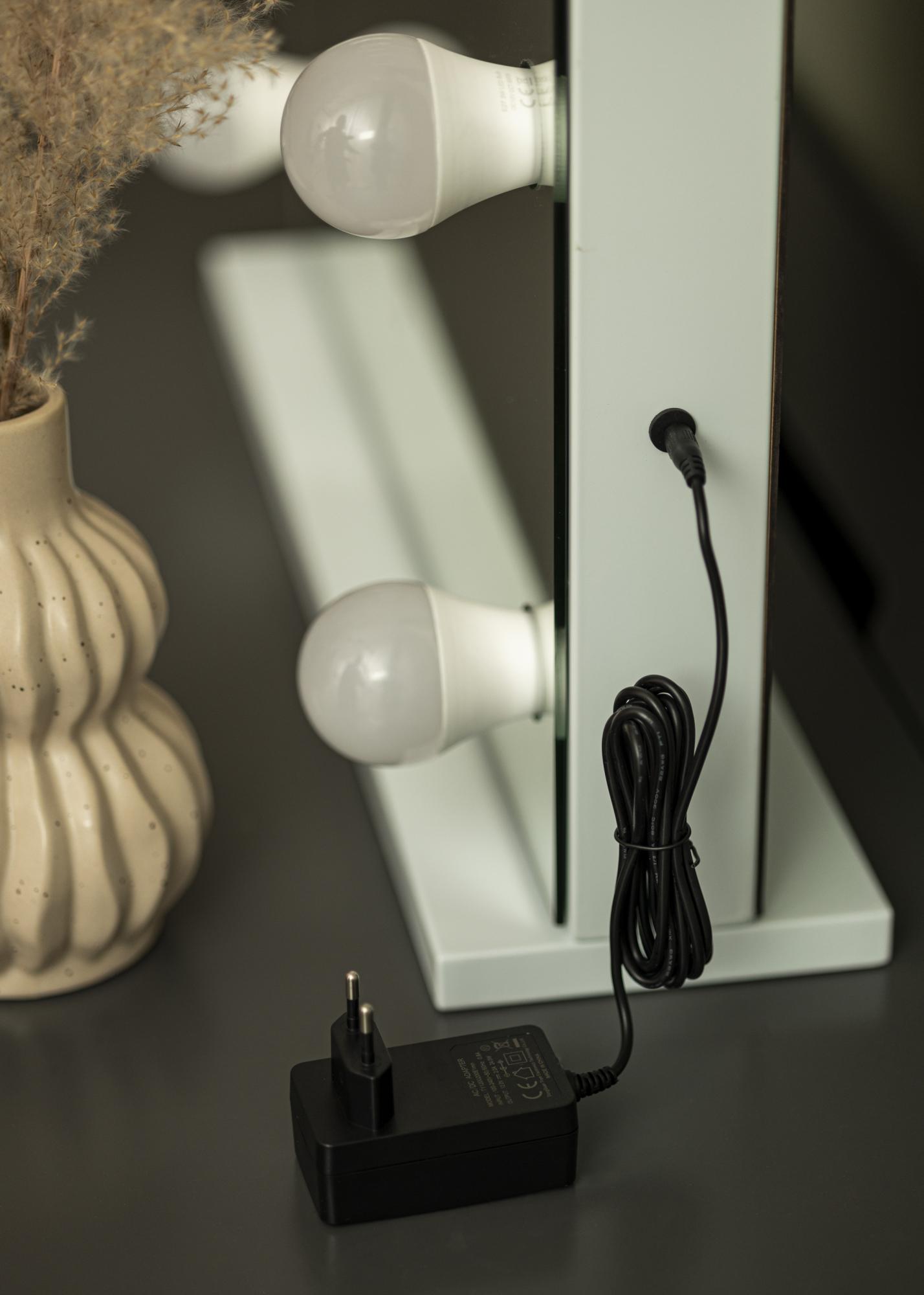 Questo è uno specchio per il trucco dal design Hollywoodiano, con una forma rettangolare classica, una grande superficie specchiante di 80x60 cm e 14 lampade a LED disposte come una cornice elegante. Può essere posizionato su un mobile, ad esempio come specchio funzionale sul tavolo da trucco o come dettaglio decorativo su un tavolino. Se preferisci appendere lo specchio al muro utilizzando i supporti posteriori, puoi rimuovere il supporto. Lo specchio si collega tramite presa.