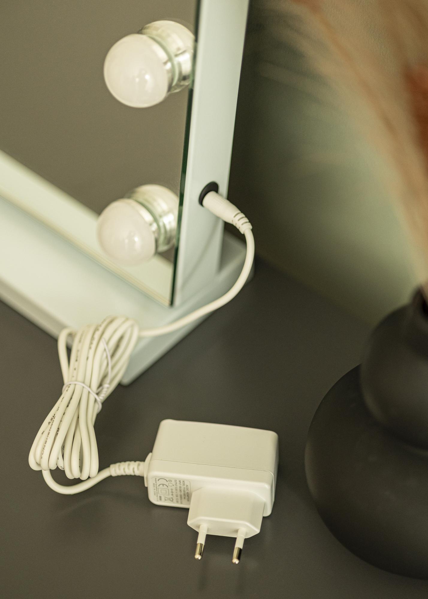 Lo specchio può essere appeso al muro in posizione orizzontale o montato sul supporto incluso. Questo modello ha un elegante supporto bianco che aumenta l'eleganza dell'intero aspetto dello specchio. L'alimentazione avviene tramite una presa di corrente.