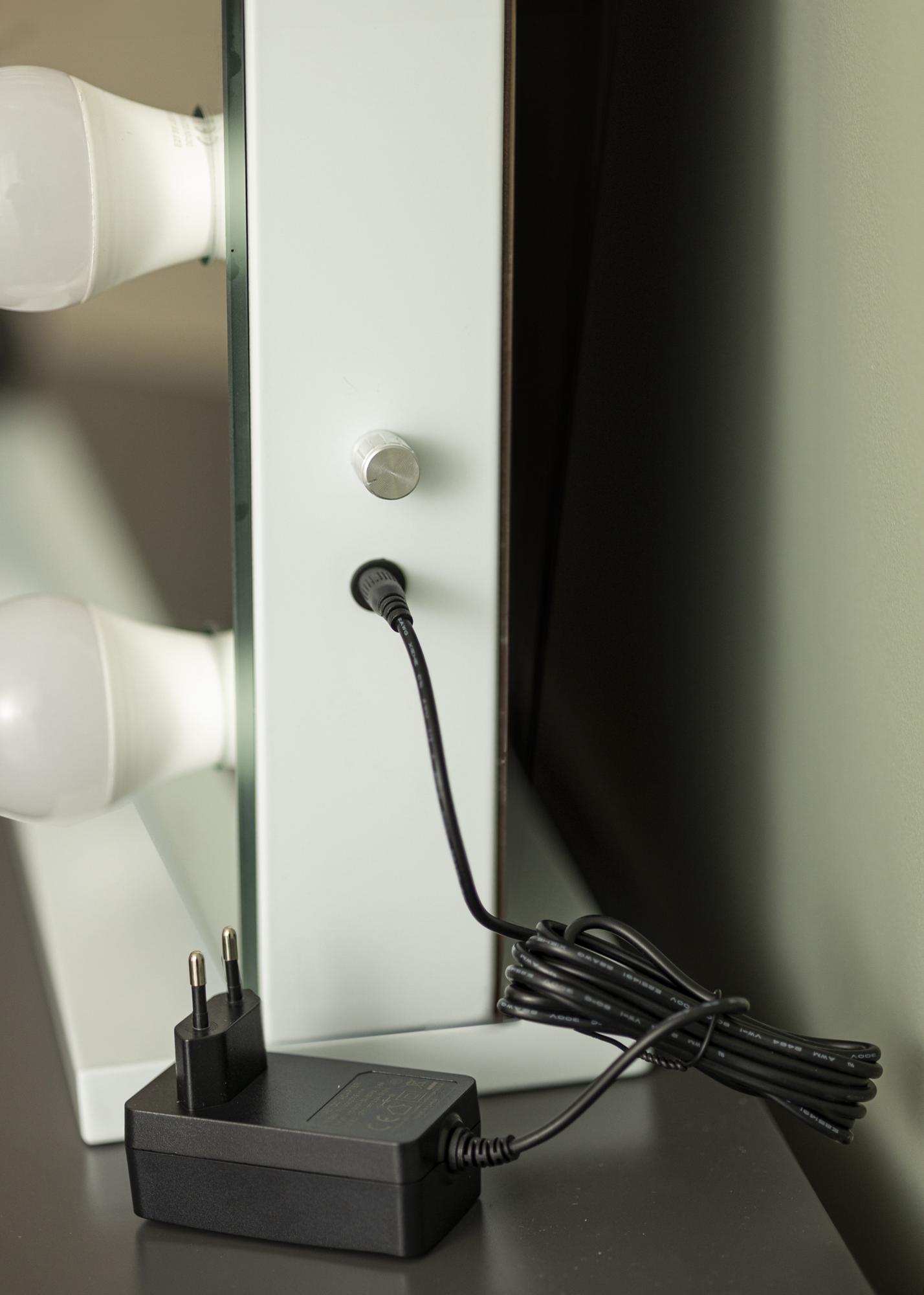 Questo è un unico specchio per il trucco con un design che ricorda una loggia per il trucco a Hollywood. La grande superficie dello specchio di 80x65 cm è incorniciata da 14 lampadine a bulbo con attacco E27. L'effetto è una luce bianca fredda uniforme che si adatta sia quando ti trucchi che quando desideri una fonte luminosa alla moda sul tavolino del soggiorno. Inoltre, l'illuminazione è regolabile, per una maggiore flessibilità. Basta girare la manopola sul lato corto dello specchio e regolare la luce come desideri.