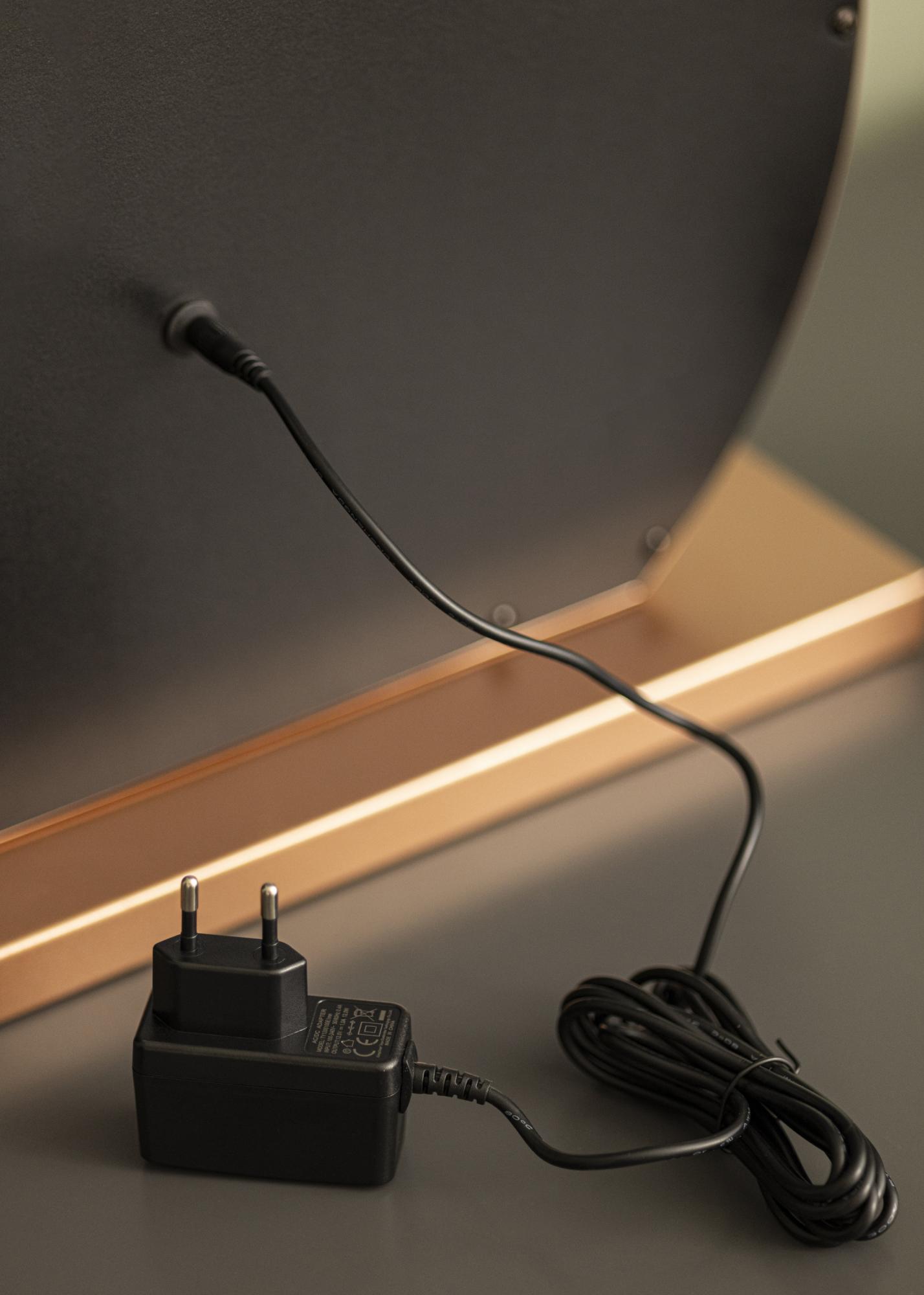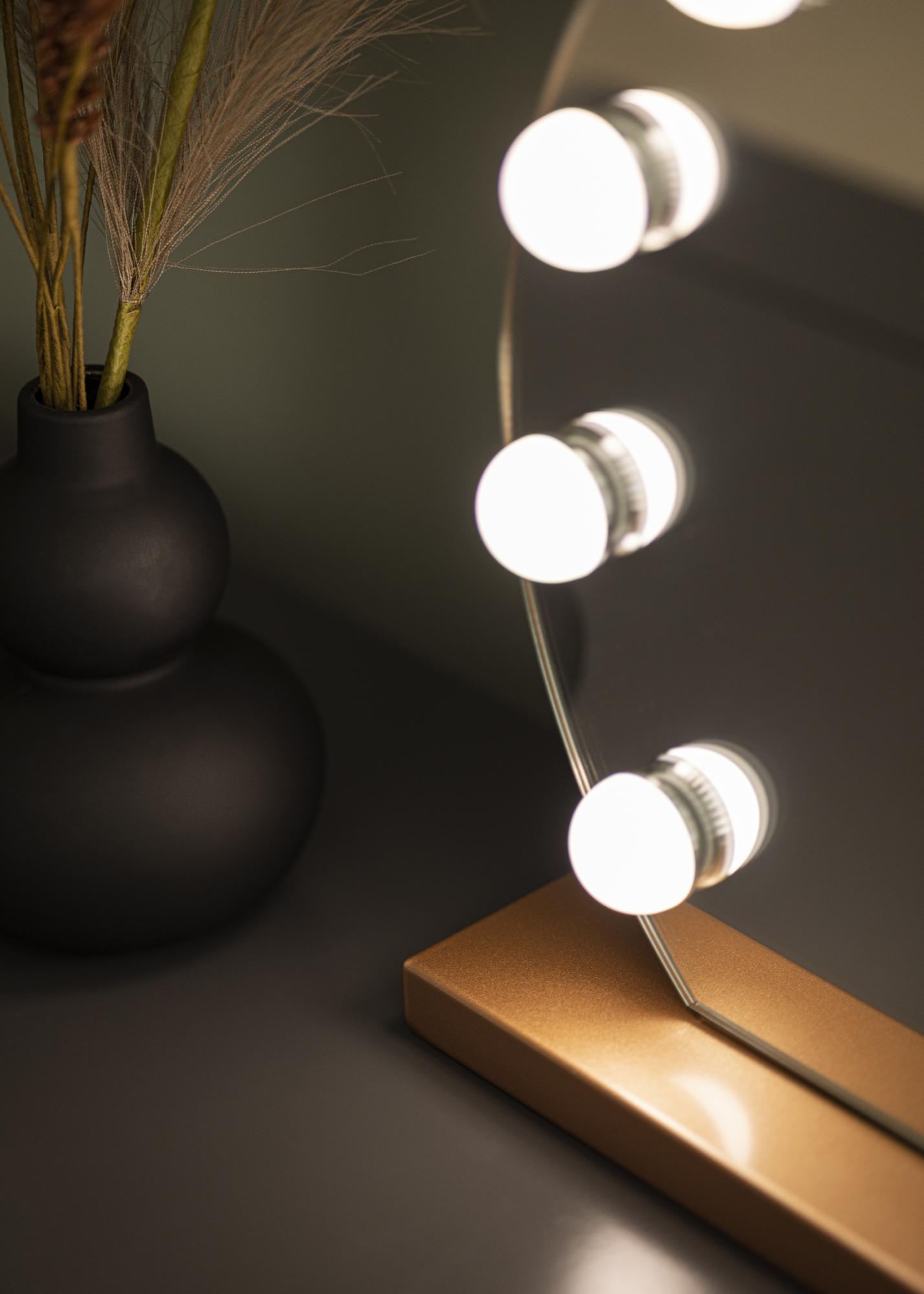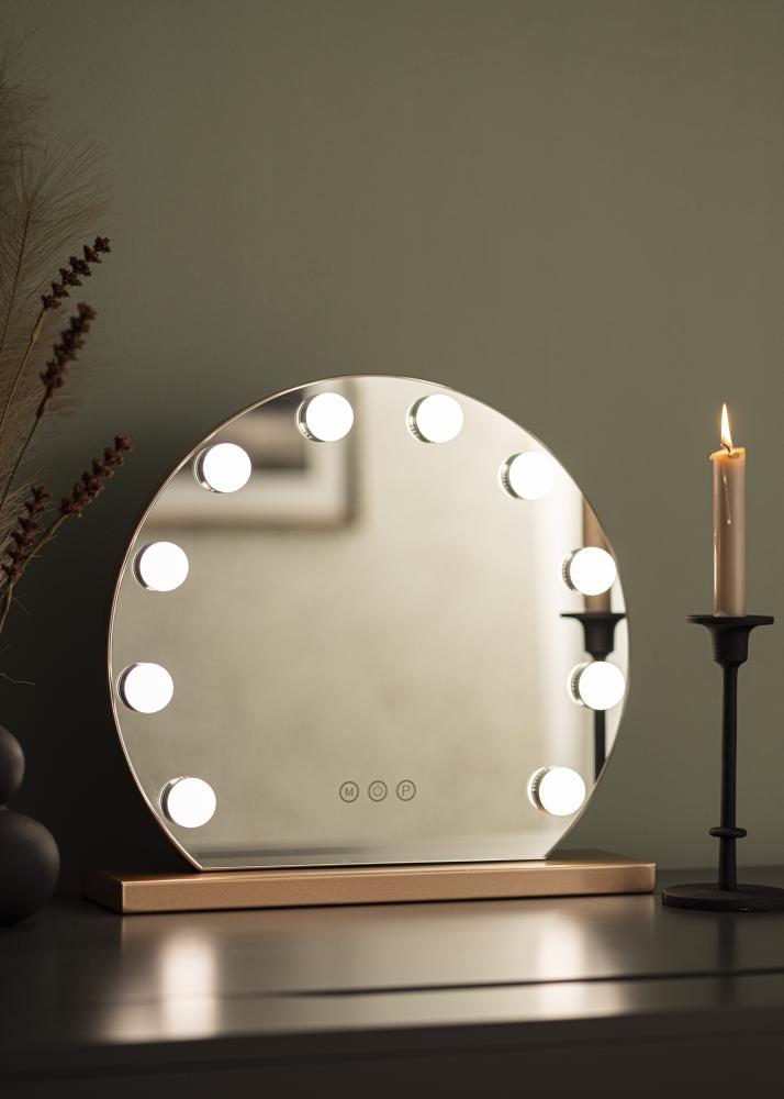 Questo specchio ha una forma classica rotonda con 10 grandi lampade a LED che incorniciano la superficie dello specchio di 40x30 cm. Ciò conferisce un aspetto esclusivo, ulteriormente enfatizzato dal supporto dello specchio in una trendy tonalità di oro rosa. Accendi l'illuminazione integrata con un pulsante touch sulla parte anteriore dello specchio. Hai anche la possibilità di regolare la temperatura del colore e la luminosità della luce secondo le tue preferenze. Anche questo viene fatto tramite comodi pulsanti touch, contrassegnati con "M" per l'aggiustamento della temperatura del colore e "P" per l'impostazione della luminosità. Le tre temperature del colore tra cui puoi scegliere sono calda, fredda e luce naturale.