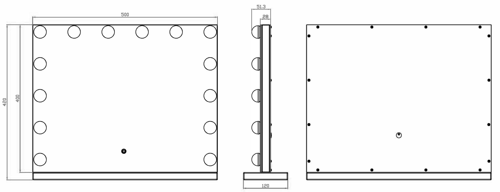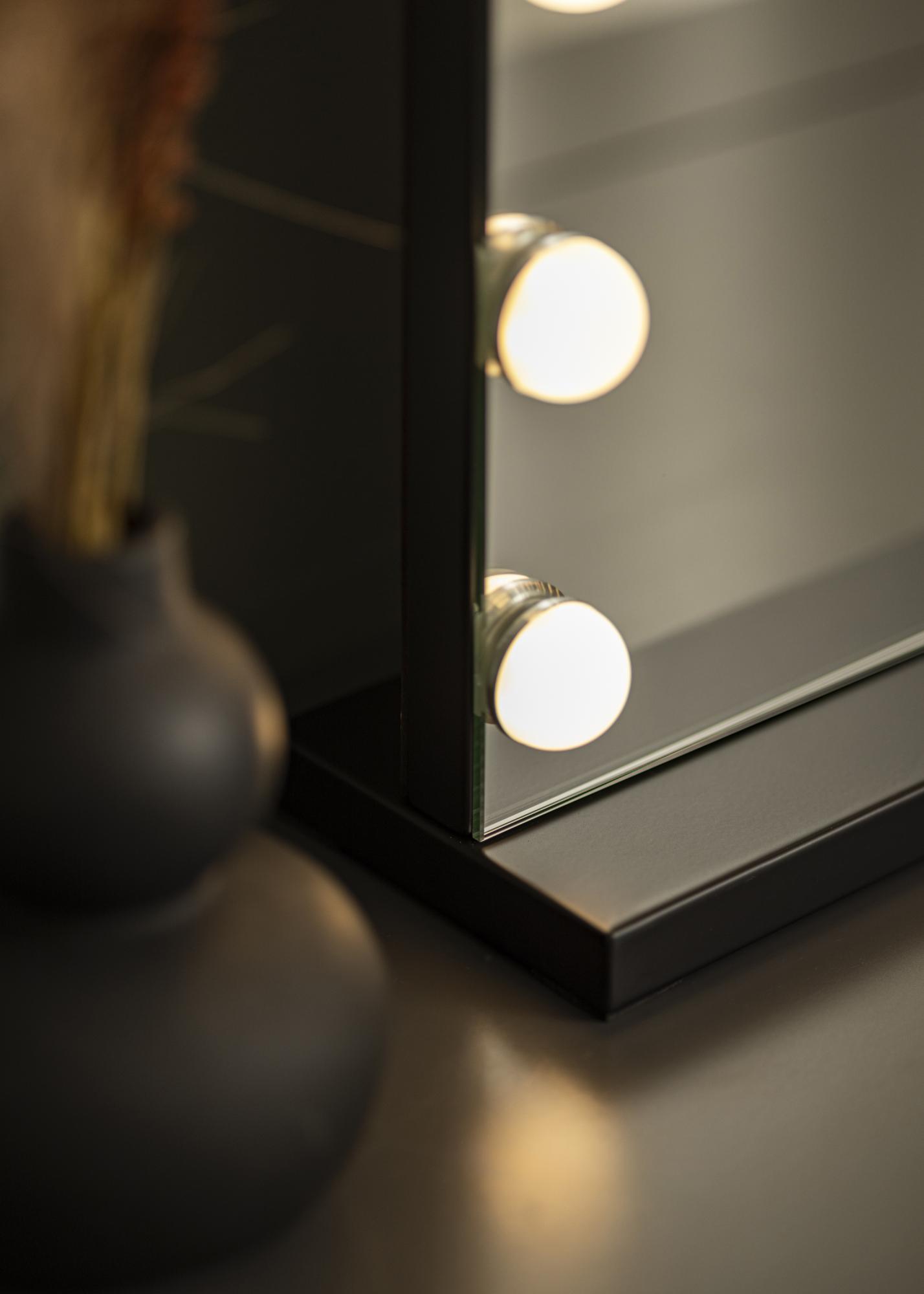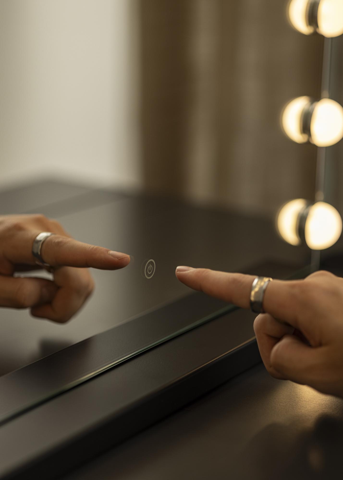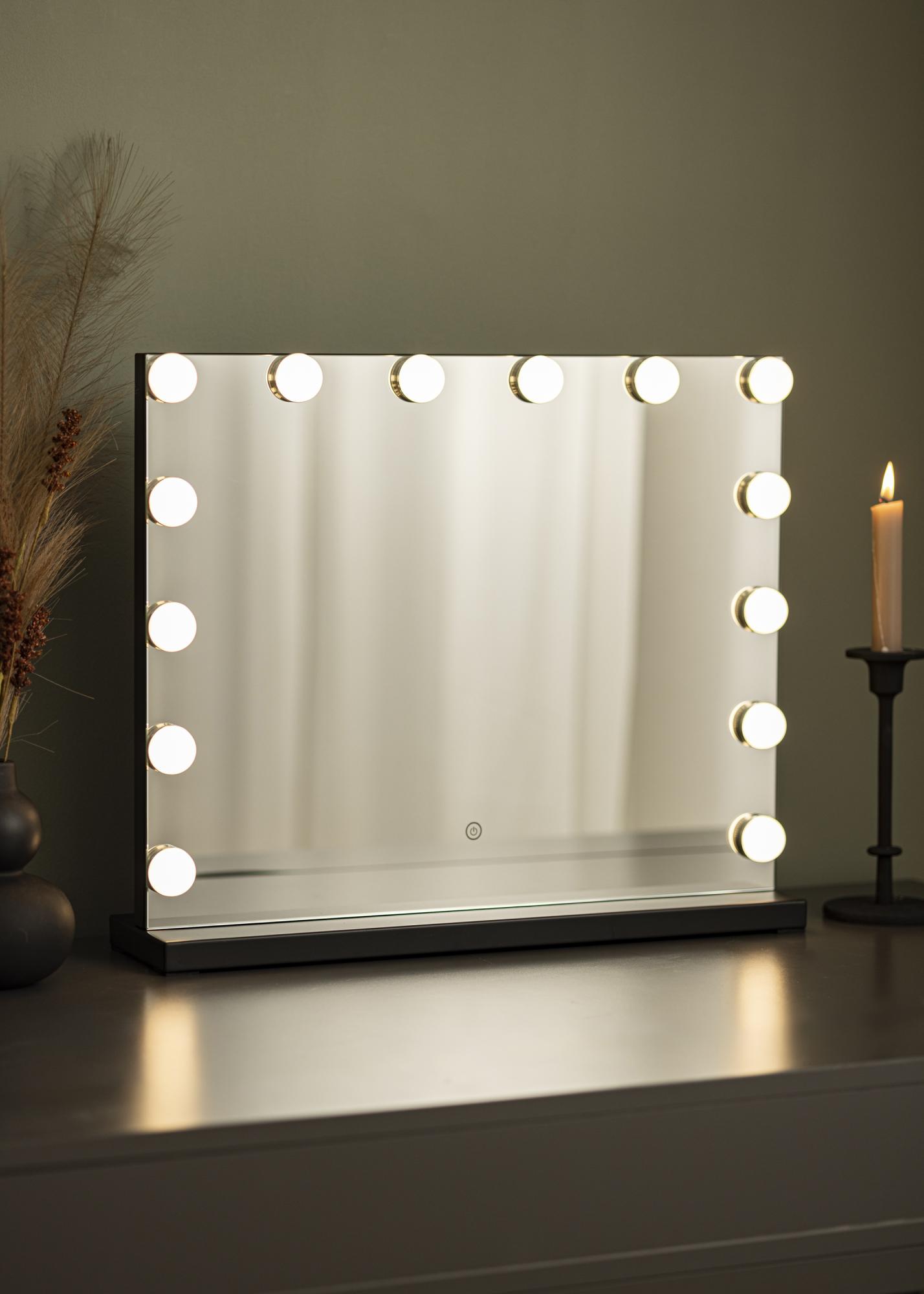 Trasforma una stanza in uno studio di trucco con questo lussuoso specchio per il trucco in stile Hollywood di KAILA! Questo è un grande specchio per il trucco con illuminazione integrata sotto forma di 14 lampadine a LED che incorniciano elegantemente la grande superficie dello specchio. L'illuminazione a LED è regolabile in intensità e ha una luce bianca calda a 3000K. Accendi facilmente l'illuminazione premendo il pulsante touch sullo schermo e regola facilmente l'intensità tenendo premuto il pulsante. Lo specchio misura 50x45 cm. Collegamento elettrico con spina.