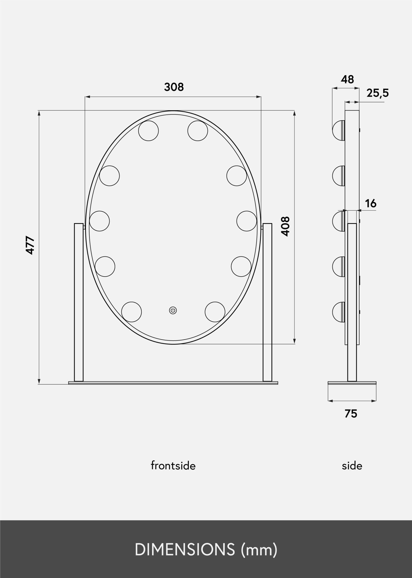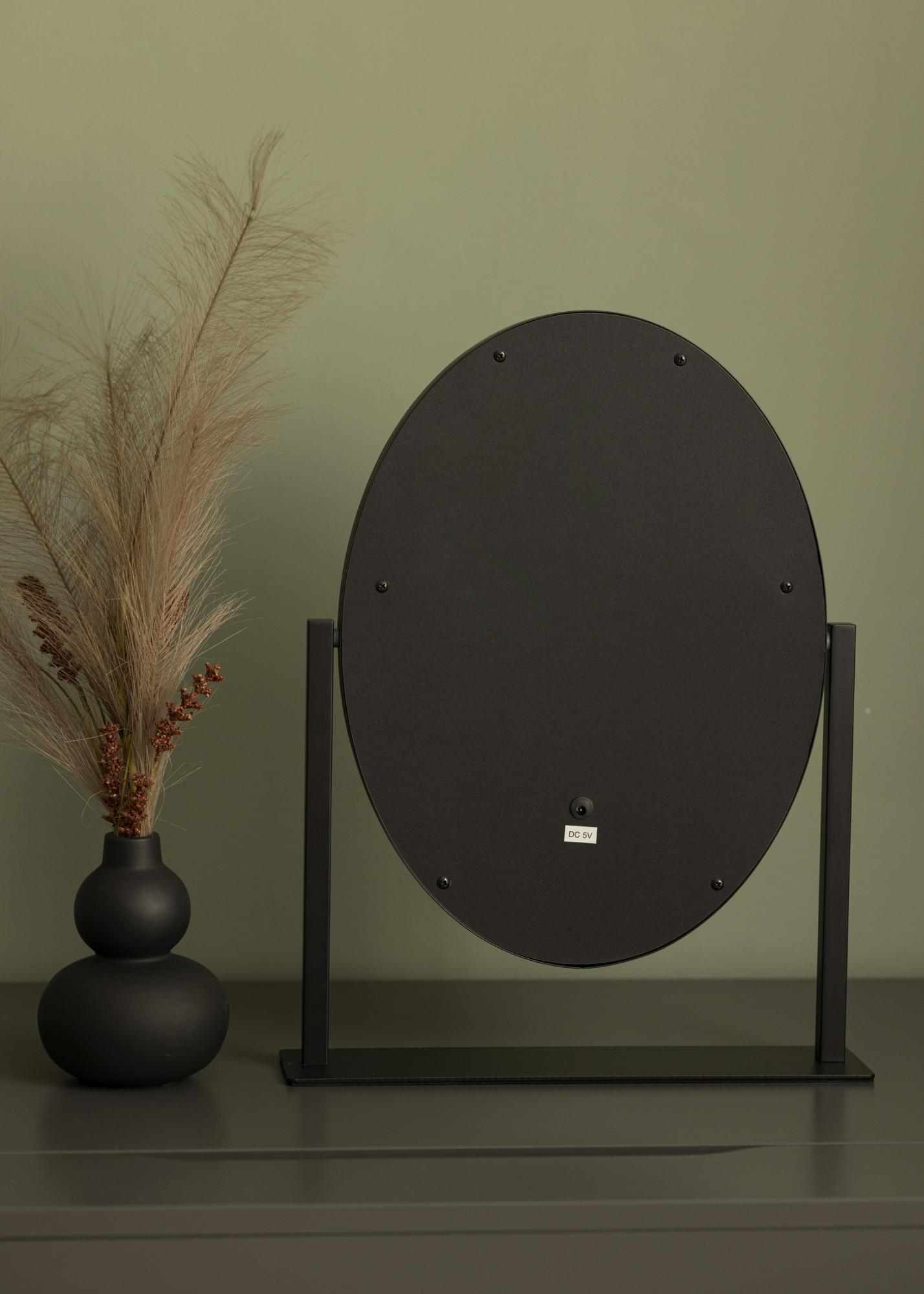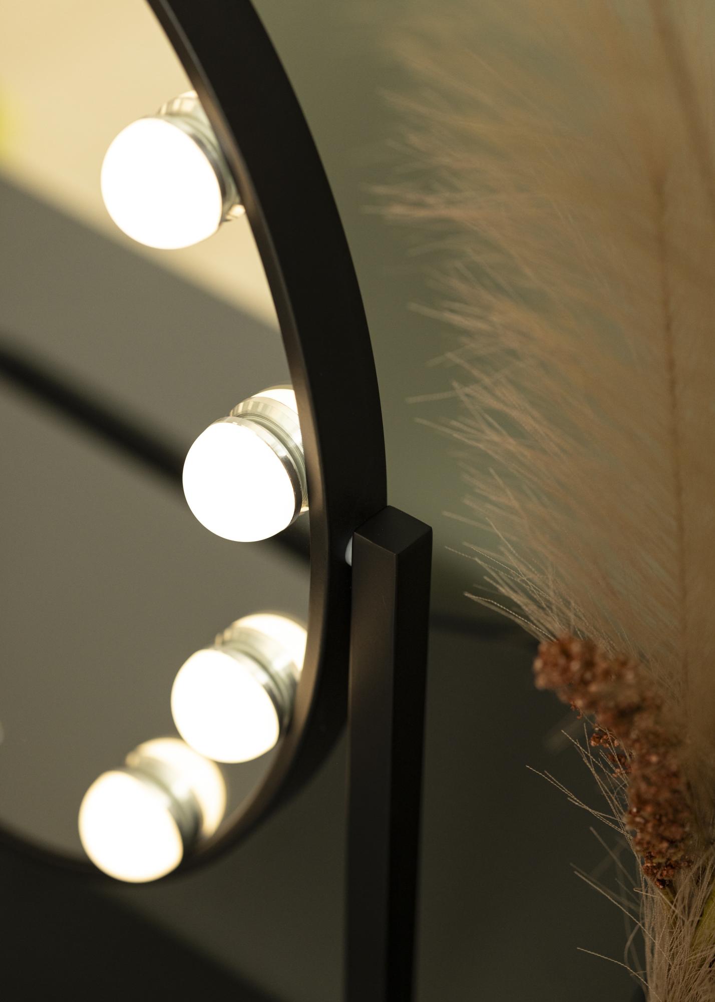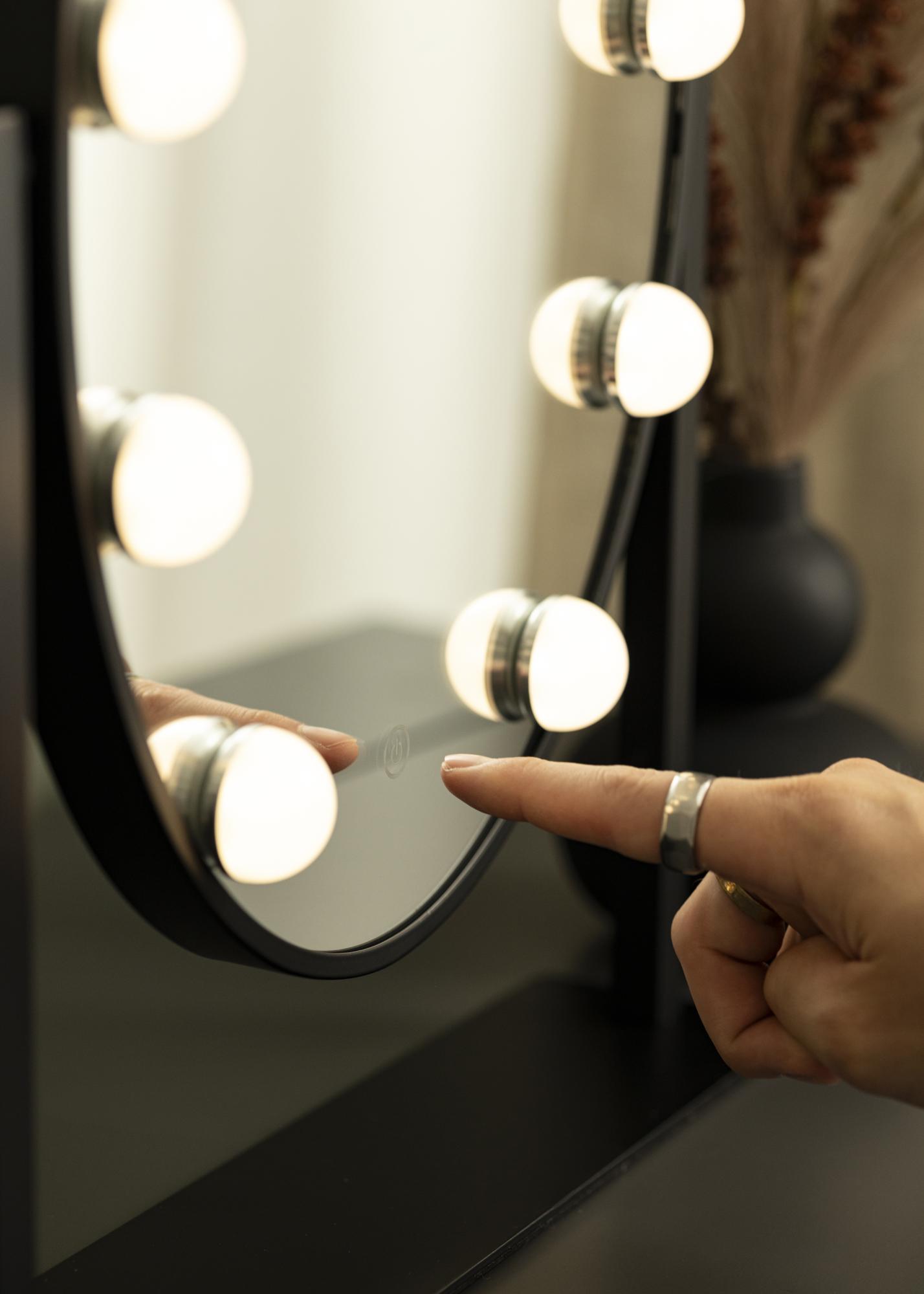Questo è uno specchio per il trucco in un elegante forma ovale del marchio svedese KAILA. Lo specchio per il trucco ha un design elegante in nero e ha un'illuminazione integrata a LED dimmerabile. L'illuminazione a LED sotto forma di 10 lampadine a incandescenza offre una tonalità bianca uniforme e calda a 3000K. L'illuminazione si accende premendo il pulsante touch e l'intensità si regola facilmente tenendo premuto il pulsante per alcuni secondi. Il LED è una fonte di luce a basso consumo energetico con una luce naturale perfetta per l'applicazione del trucco. Lo specchio per il trucco misura 34x47 cm e può ruotare di 360° verticalmente, consentendoti di specchiarti facilmente da diverse angolazioni. Il design senza tempo e glamour crea un'atmosfera da Hollywood nella tua casa!