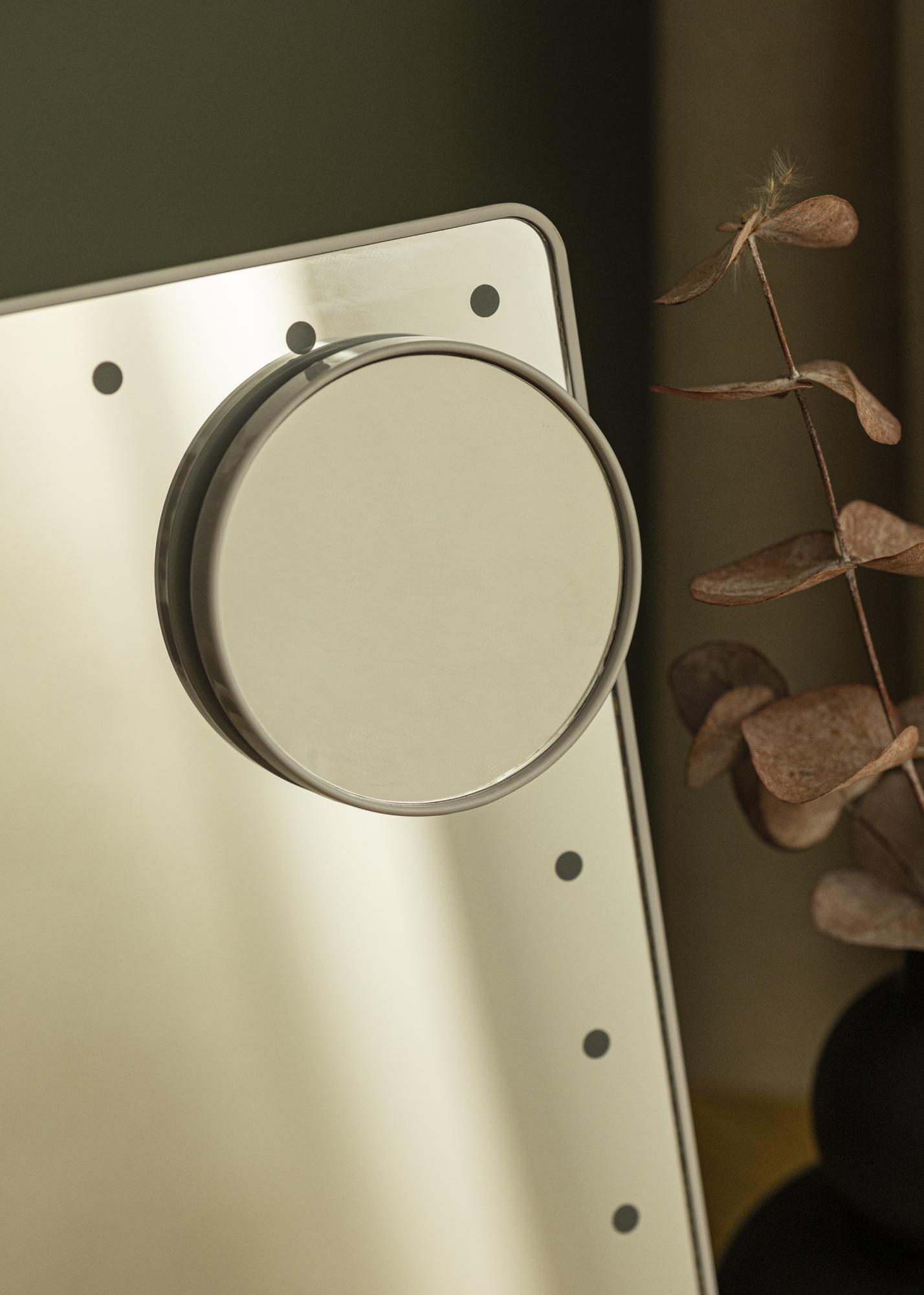 Lo specchio ha una dimensione compatta con una superficie riflettente di 16,5x25 cm, che lo rende facilmente trasportabile. La superficie riflettente può essere ruotata e inclinata per permetterti di impostare un angolo che ti sia comodo. È inclusa anche una piccola specchiera con zoom 2x e 3x, che può essere utilizzata separatamente o fissata al vetro dello specchio più grande. Questo specchio per il trucco ha anche una luce LED integrata che illumina il tuo viso con una luce bianca fredda quando ti specchi. La luce può essere accesa e spenta tramite un pulsante on/off sul retro dello specchio e hai anche la possibilità di regolare l'intensità luminosa. Lo specchio è alimentato da una batteria integrata che si ricarica tramite connessione USB. Cavo di ricarica incluso.