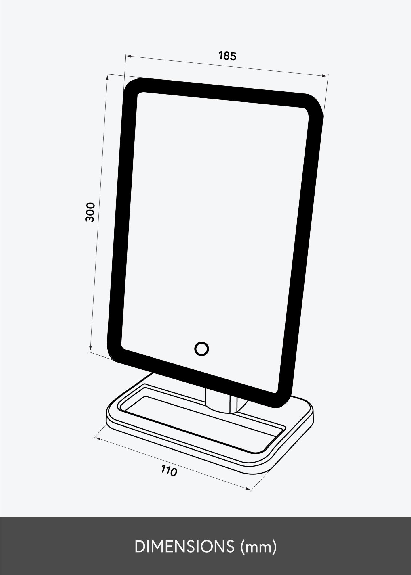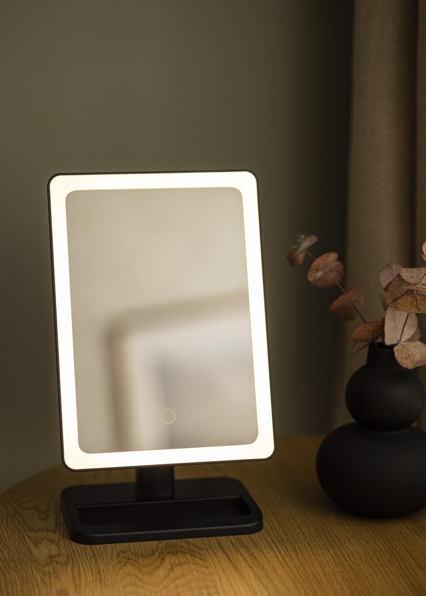Lo specchio ha un design intelligente con caratteristiche che rendono più facile truccarti con risultati eccellenti. La superficie dello specchio è circondata da una striscia LED che illumina il tuo viso - inoltre può essere ruotata e inclinata in modo da poter impostare un angolo che ti si addice. Puoi regolare l'intensità della luce premendo il pulsante sullo specchio. È incluso anche uno specchio più piccolo con zoom 10x, perfetto quando vuoi concentrarti su una piccola parte del viso. Lo specchio è alimentato da una batteria integrata che si ricarica tramite il cavo USB incluso.