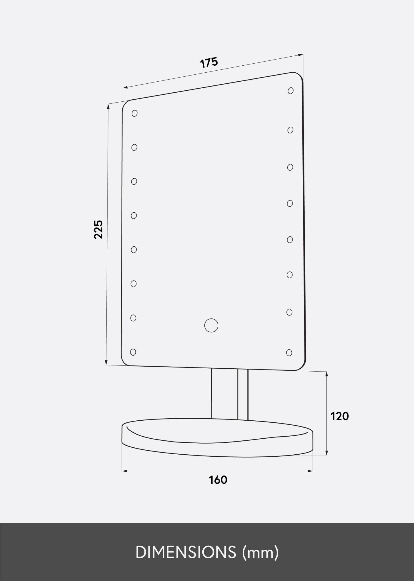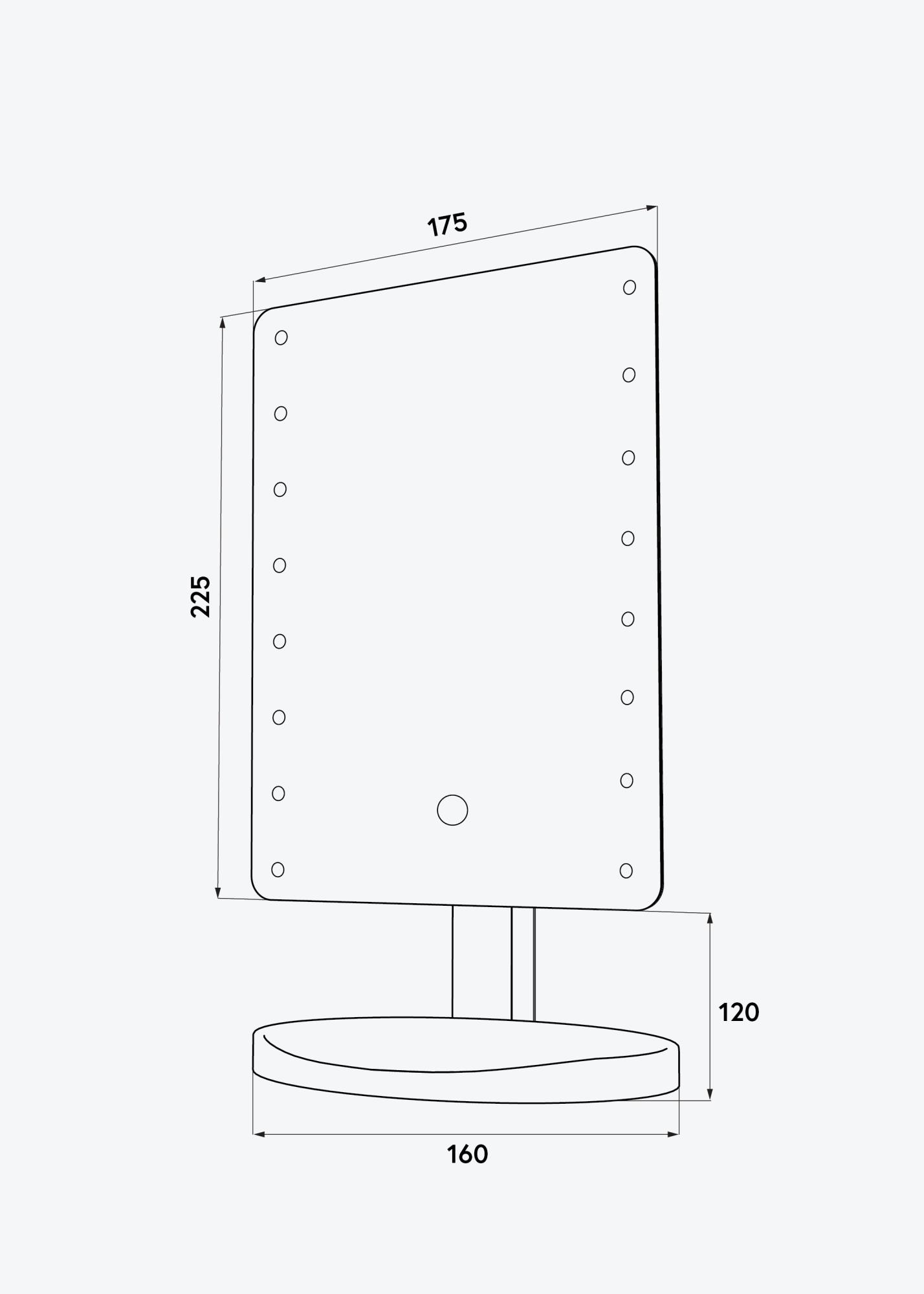Questo è un bello specchio per il trucco che è perfetto da usare sia a casa che quando sei in viaggio. È molto portatile, realizzato in un materiale composito leggero e ha un formato più piccolo con una superficie specchiante di 17,5x22,5 cm. Lo specchio può essere e ruotato in posizione orizzontale.