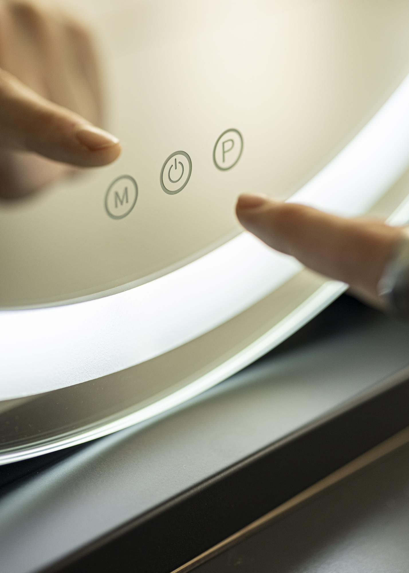 Questo è uno specchio da trucco modello verticale, con un piedistallo di colore nero neutro che può essere facilmente abbinato al resto dell'arredamento. La superficie dello specchio ha una forma rotonda classica con un diametro di 50 cm, incorniciata splendidamente da una striscia LED integrata. Ci sono tre pulsanti touch nella parte inferiore dello specchio - un pulsante di accensione/spegnimento che accende e spegne l'illuminazione, un pulsante "M" che regola la temperatura del colore della luce e un pulsante "P" che ti permette di regolare l'intensità luminosa dell'illuminazione come desideri. L'alimentazione avviene tramite una presa di corrente.