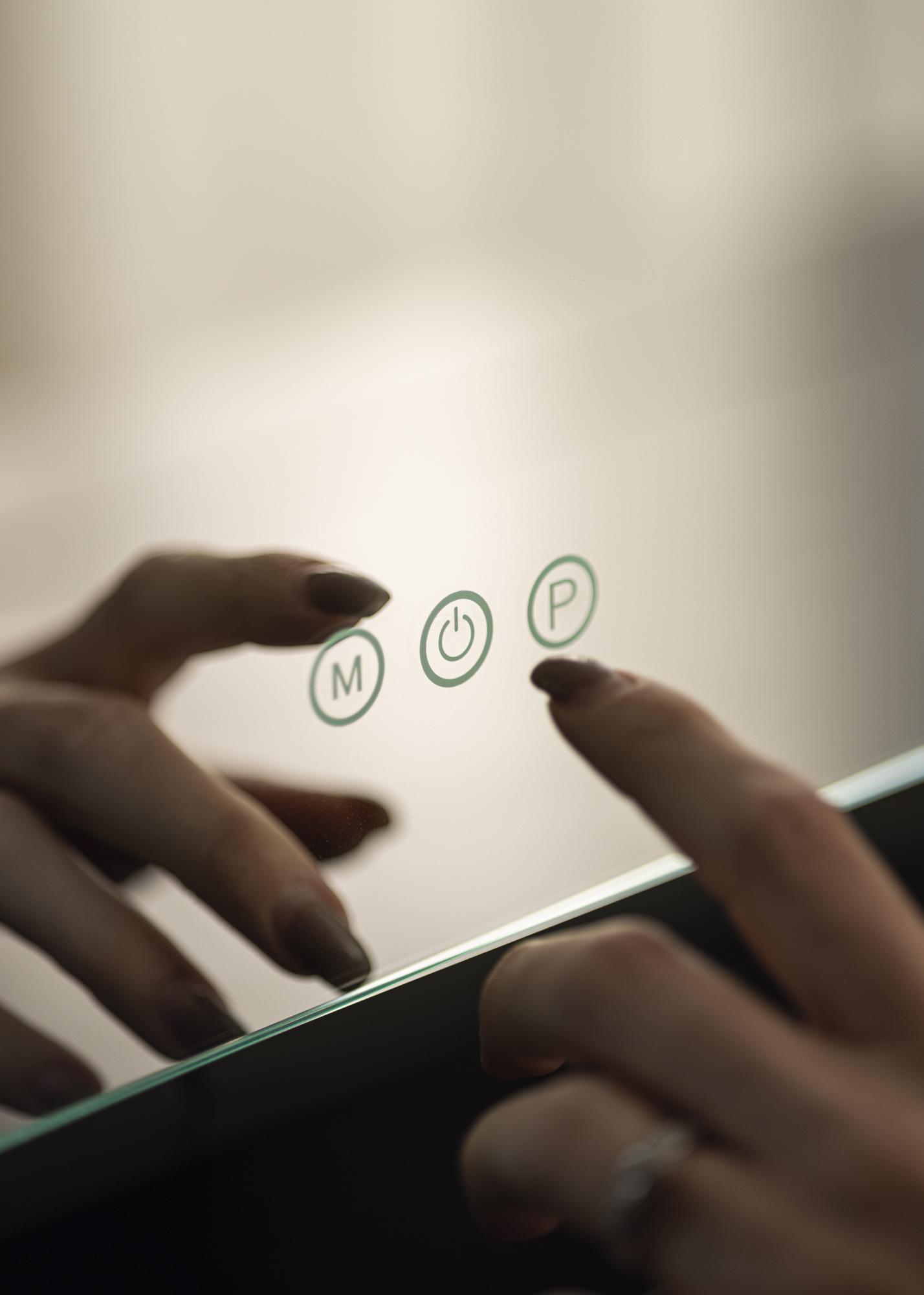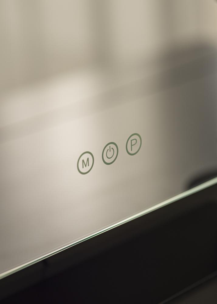 Questo specchio ha una striscia LED integrata che incornicia la superficie riflettente. Puoi regolare l'intensità della luce utilizzando il pulsante touch contrassegnato con "P" e regolare la temperatura del colore della luce utilizzando il pulsante touch contrassegnato con "M". In questo modo puoi modificare le impostazioni di illuminazione dello specchio per ogni occasione, che tu voglia una luce di sfondo morbida o una luce più intensa che ti aiuti a concentrarti sulla tua immagine riflessa. È presente anche un pulsante di accensione/spegnimento. L'alimentazione avviene tramite una presa di corrente.
