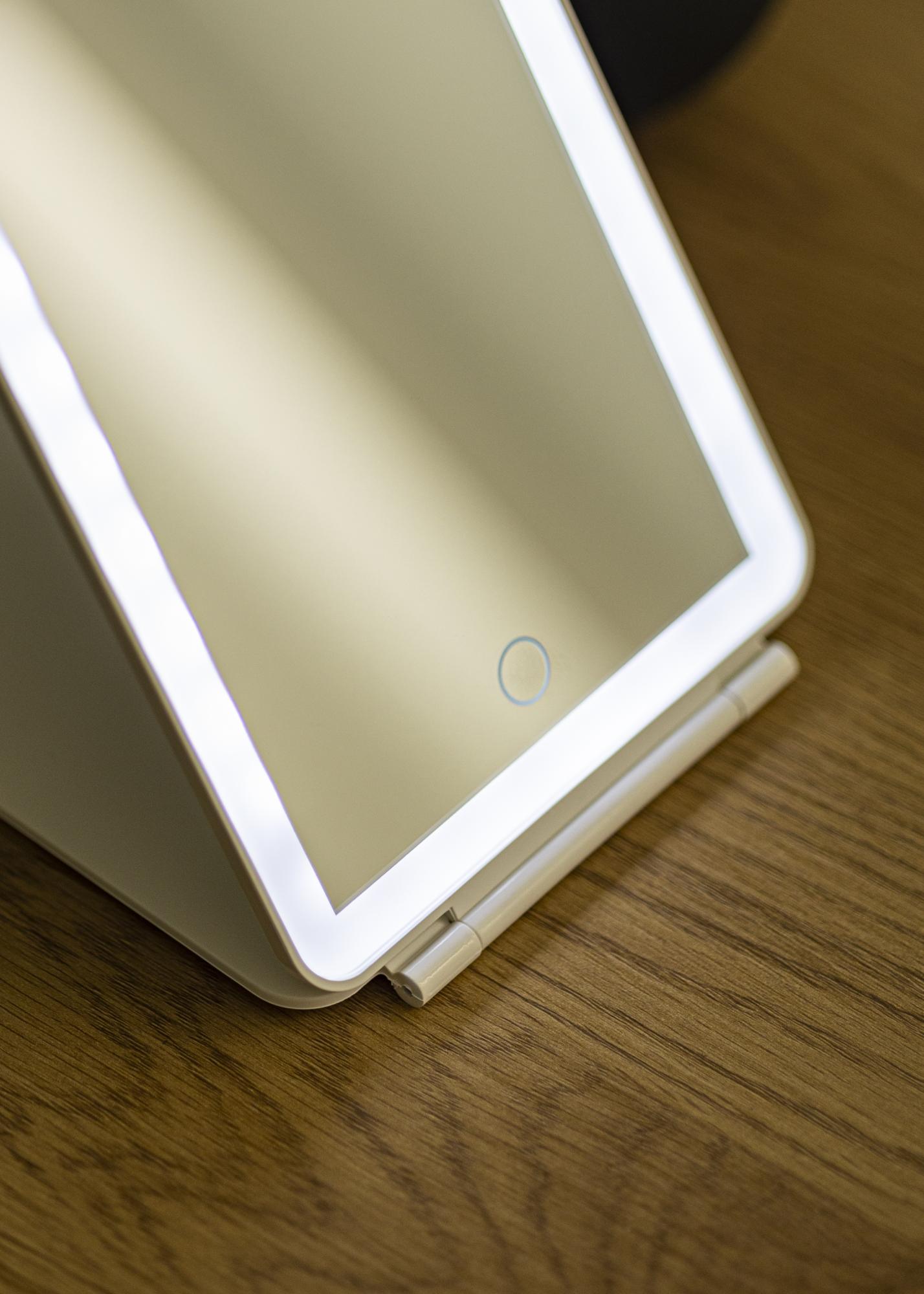 Questo è uno specchio bianco con illuminazione a LED integrata che offre una luce piacevole sul tuo viso. È alimentato a batteria e si ricarica facilmente tramite connessione USB quando la batteria è scarica. Cavo di ricarica incluso. Lo specchio si accende tramite un pulsante touch sulla superficie specchiante, con il quale puoi anche regolare l'illuminazione. Tenendo premuto il pulsante per alcuni secondi, puoi sia attenuare la luce che regolare la temperatura del colore.