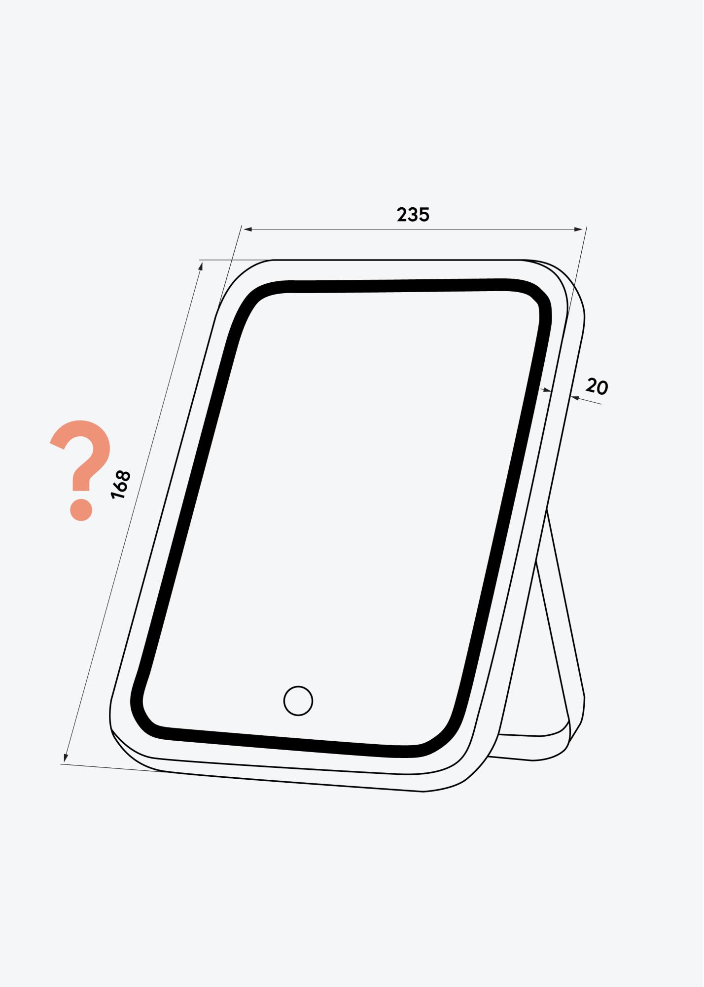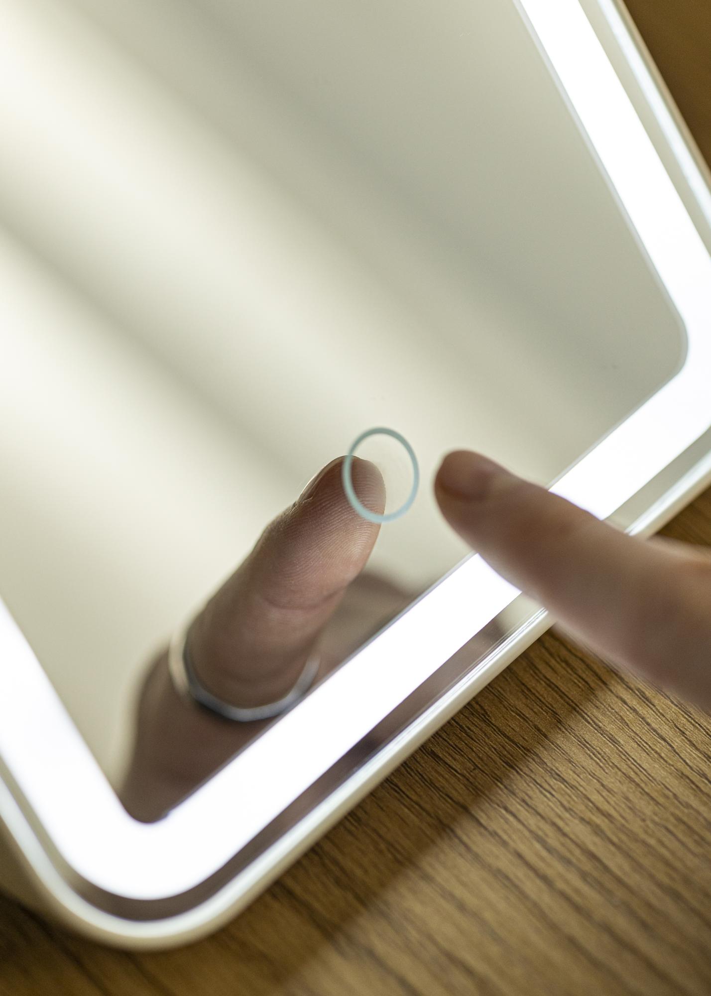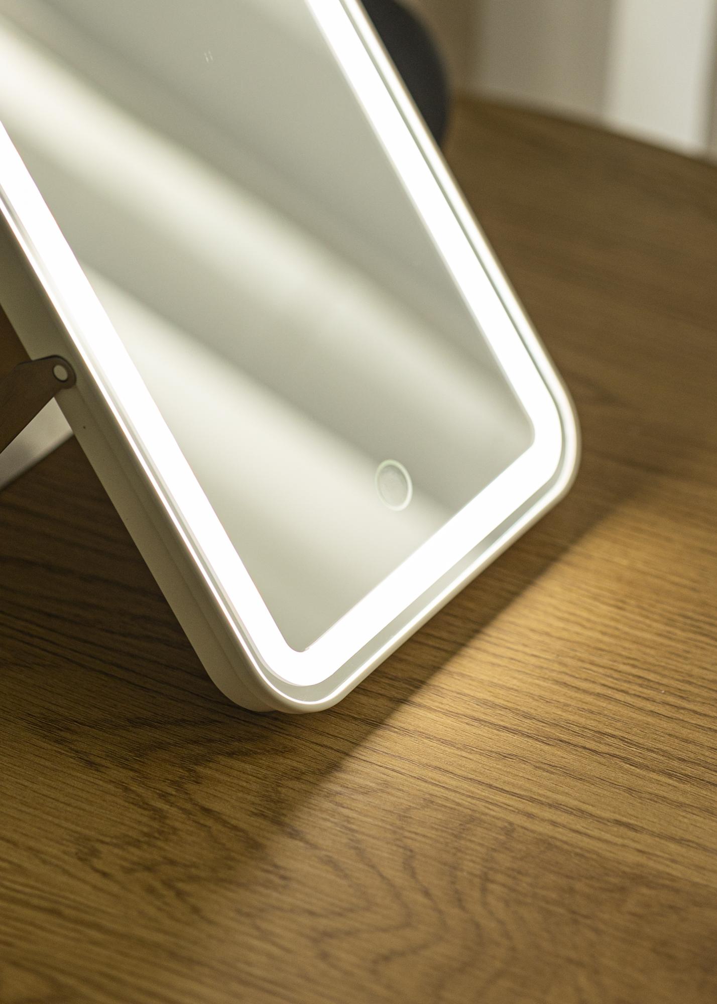 Questo è un piccolo specchio per il trucco, perfetto per chi ama portare uno specchio quando è in viaggio. Ha una superficie specchiante di 16,5x23 cm incorniciata da una elegante striscia LED. Per la tua comodità, puoi facilmente regolare l'intensità della luce o cambiare la temperatura del colore dell'illuminazione. Puoi farlo tenendo premuto il pulsante touch nella parte inferiore dello specchio per alcuni secondi.