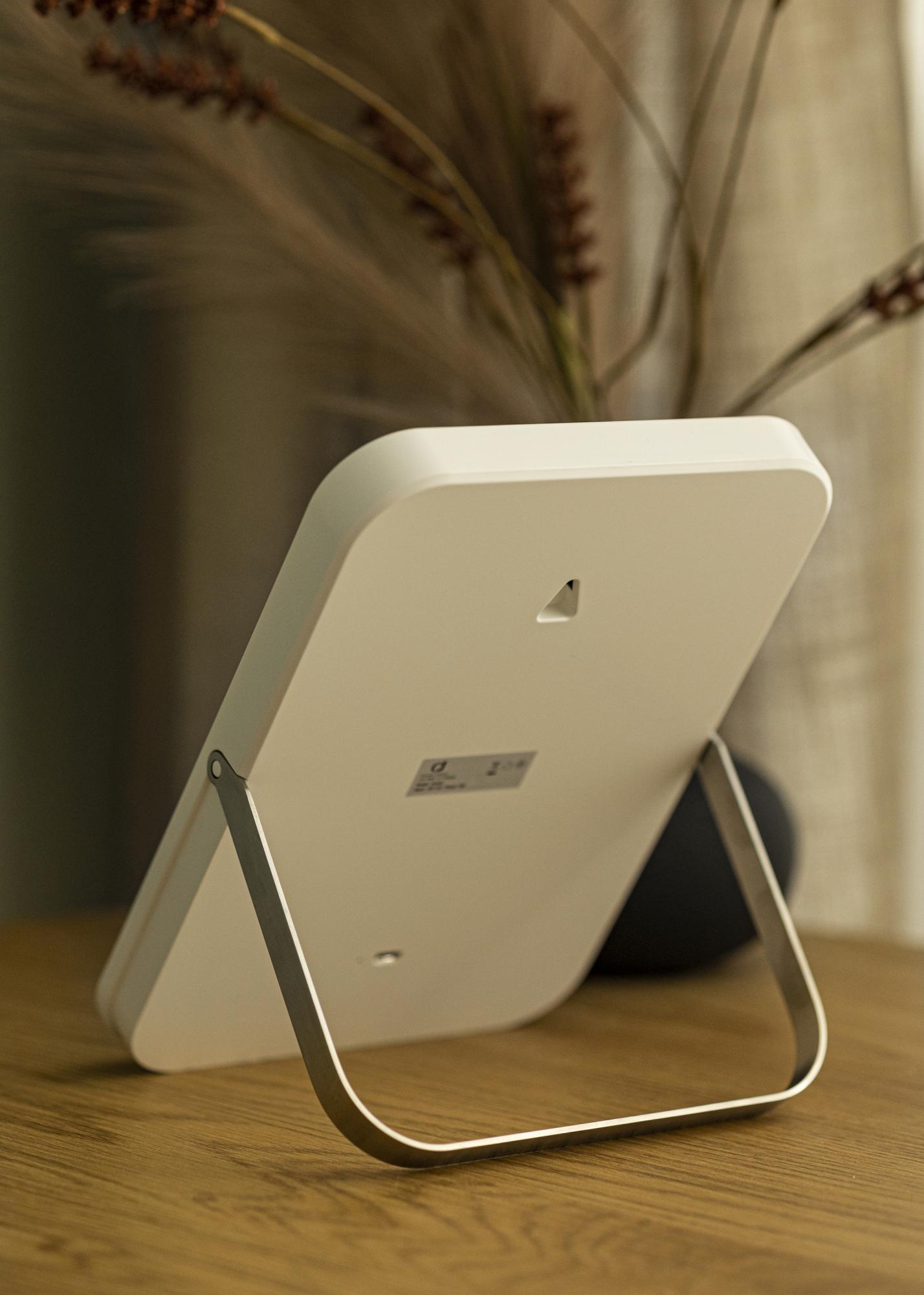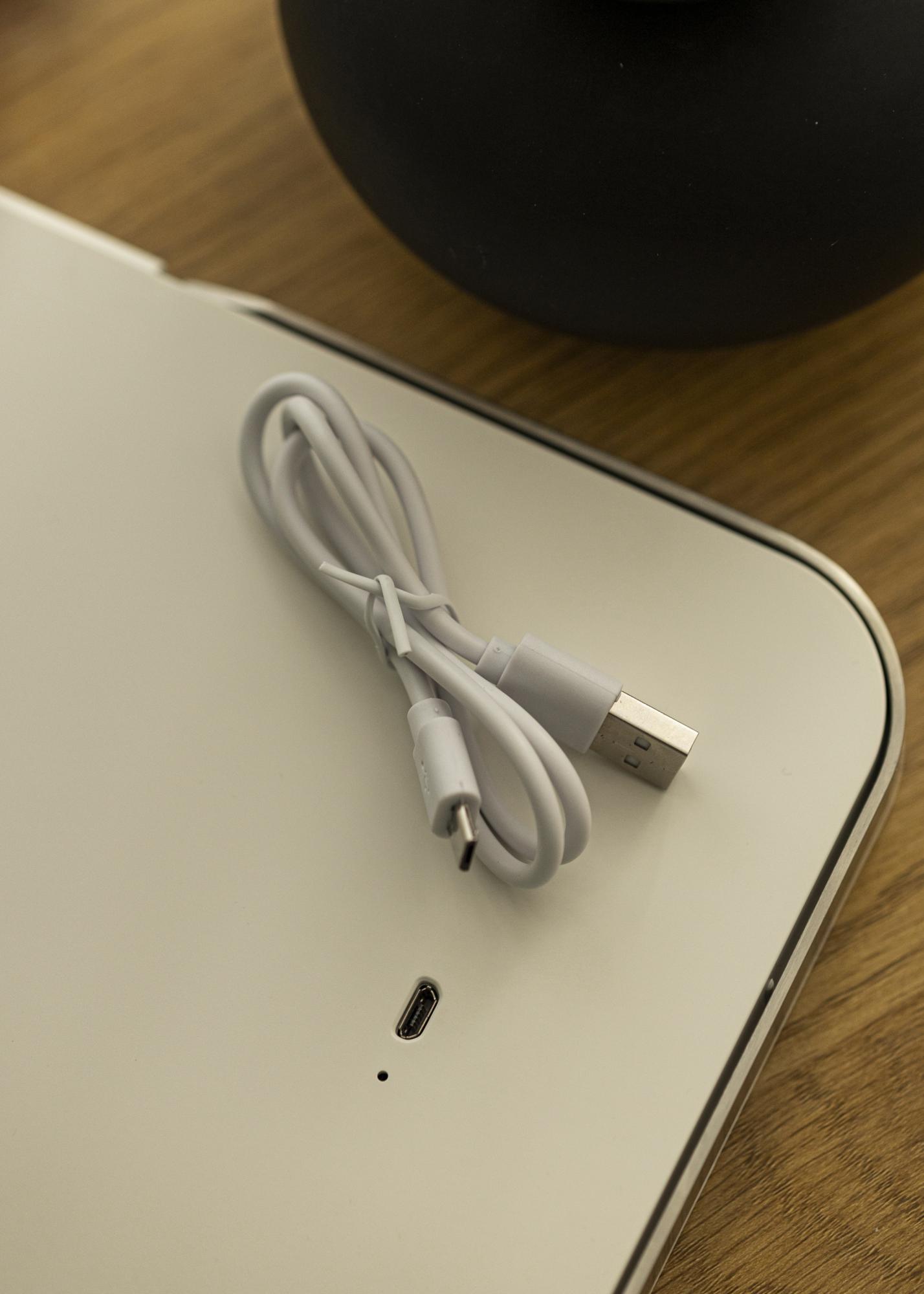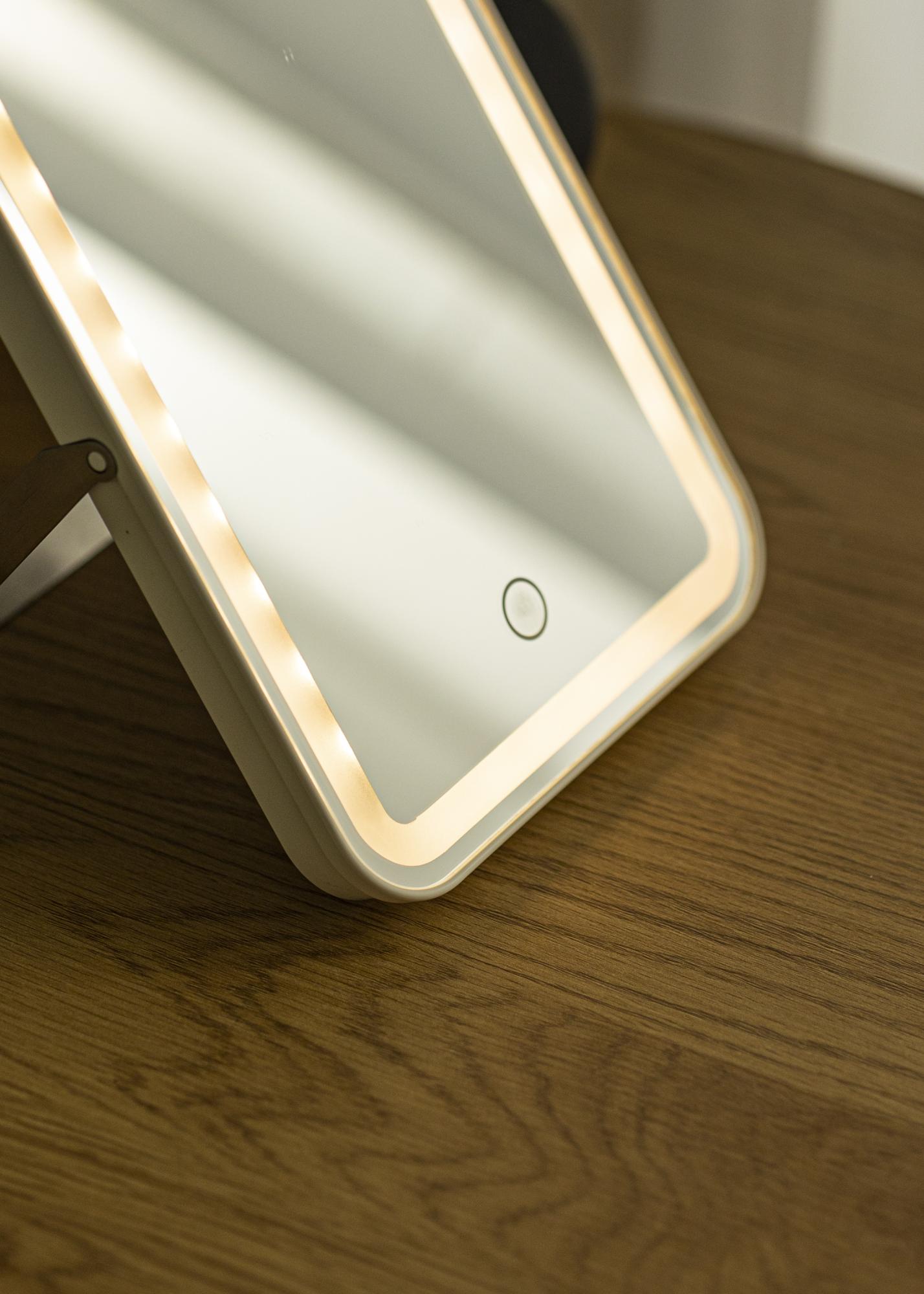 Questo specchio per il trucco ha un colore bianco neutro e un supporto argentato pieghevole. Lo specchio ha una batteria integrata che può essere ricaricata tramite connessione USB. Il cavo di ricarica è incluso.