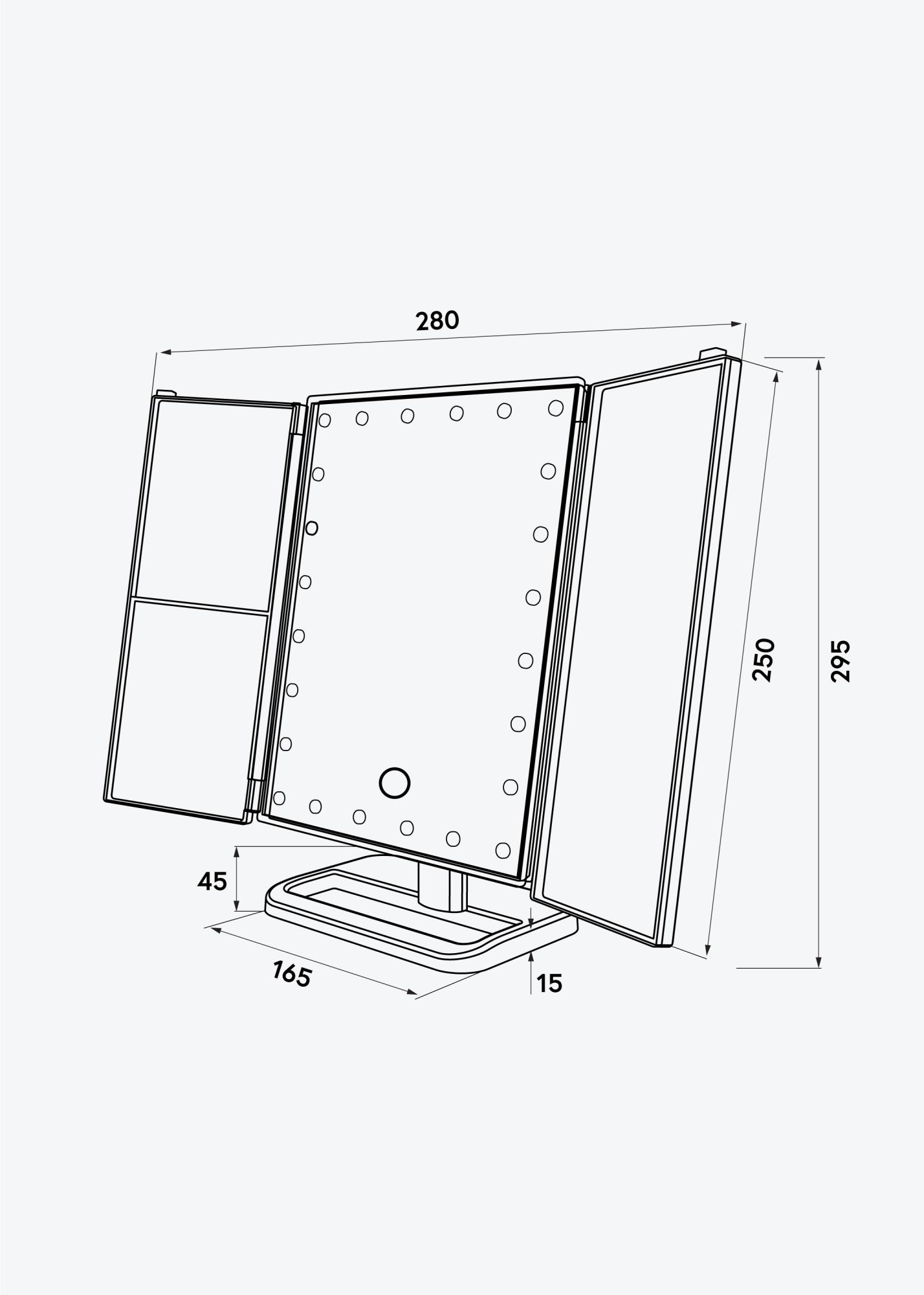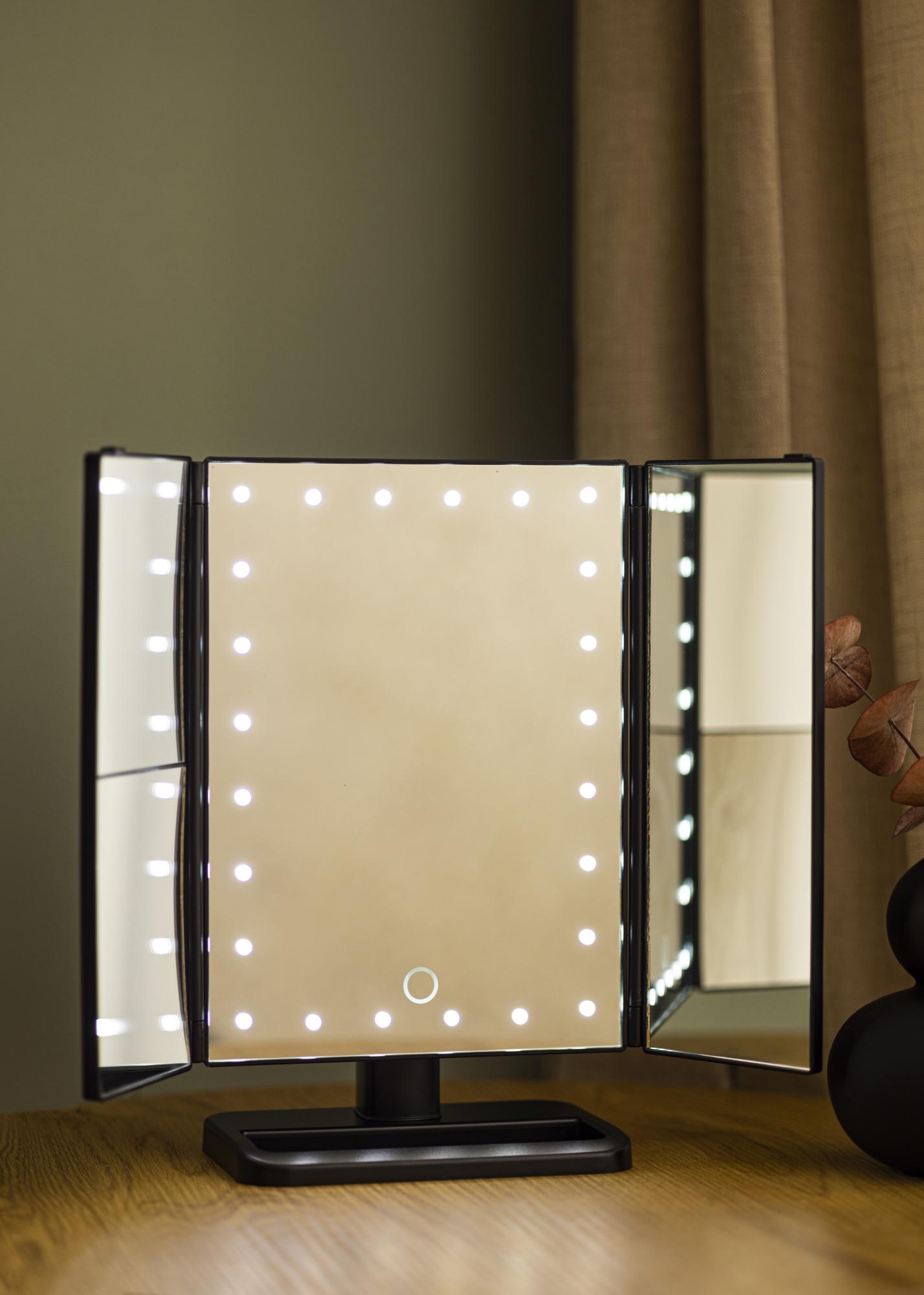 Questo specchio per il trucco è pratico e alla moda, con un elegante colore nero e illuminazione a LED. Ha un design intelligente che ti permette di regolare l'angolazione preferita delle ali laterali. La grande superficie dello specchio al centro è dotata di specchio normale e le superfici laterali hanno zoom 2x, 3x e 10x. È utile quando vuoi concentrarti su una piccola parte del viso per applicare il trucco con risultati perfetti.