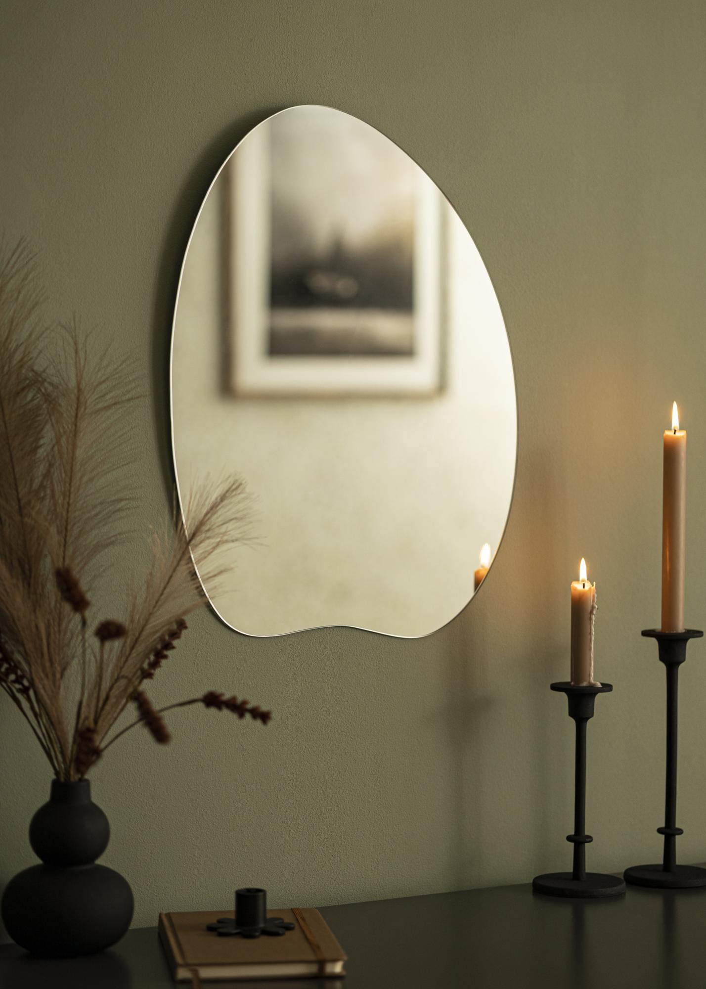 Se stai cercando uno specchio da parete con una forma interessante, questo è lo specchio per te. Il design unico, con una forma arrotondata e un bordo inferiore leggermente ondulato, è perfettamente combinato con il sottile vetro dello specchio di 4 mm. Lo specchio non ha una cornice, il che gli conferisce un aspetto minimalista. Grazie ai pratici supporti a parete sul retro, puoi facilmente appendere lo specchio al muro in posizione verticale.