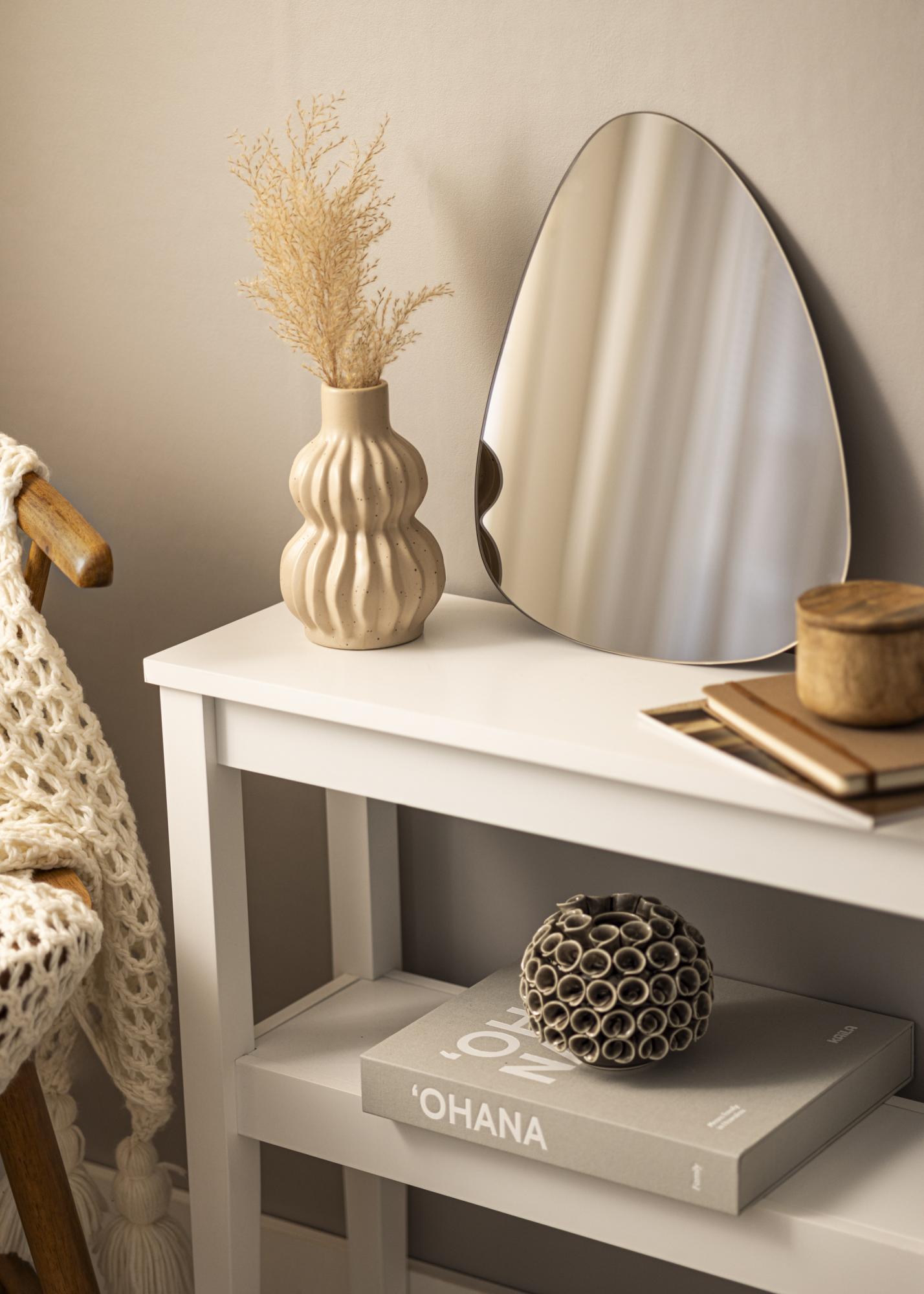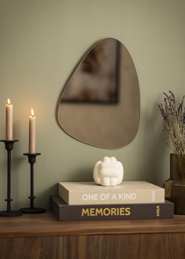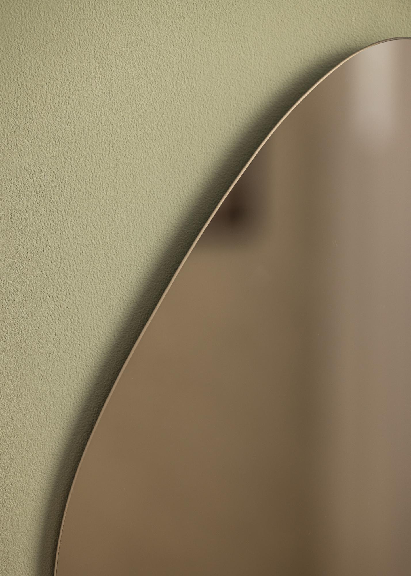Questo specchio asimmetrico diventa un dettaglio d'arredo davvero bello e alla moda nella tua casa! Oltre al design interessante a forma di uovo, questo specchio ha anche lastra di specchio dal tono bronzo elegante che enfatizza ulteriormente l'aspetto moderno e si armonizza splendidamente con molti schemi di colori diversi. La forma morbida combinata con il fatto che lo specchio è molto sottile e non ha una cornice, conferisce allo specchio una rara sensazione di eleganza e slancio. Perfetto come decorazione murale funzionale e alla moda in soggiorno, ingresso o camera da letto.