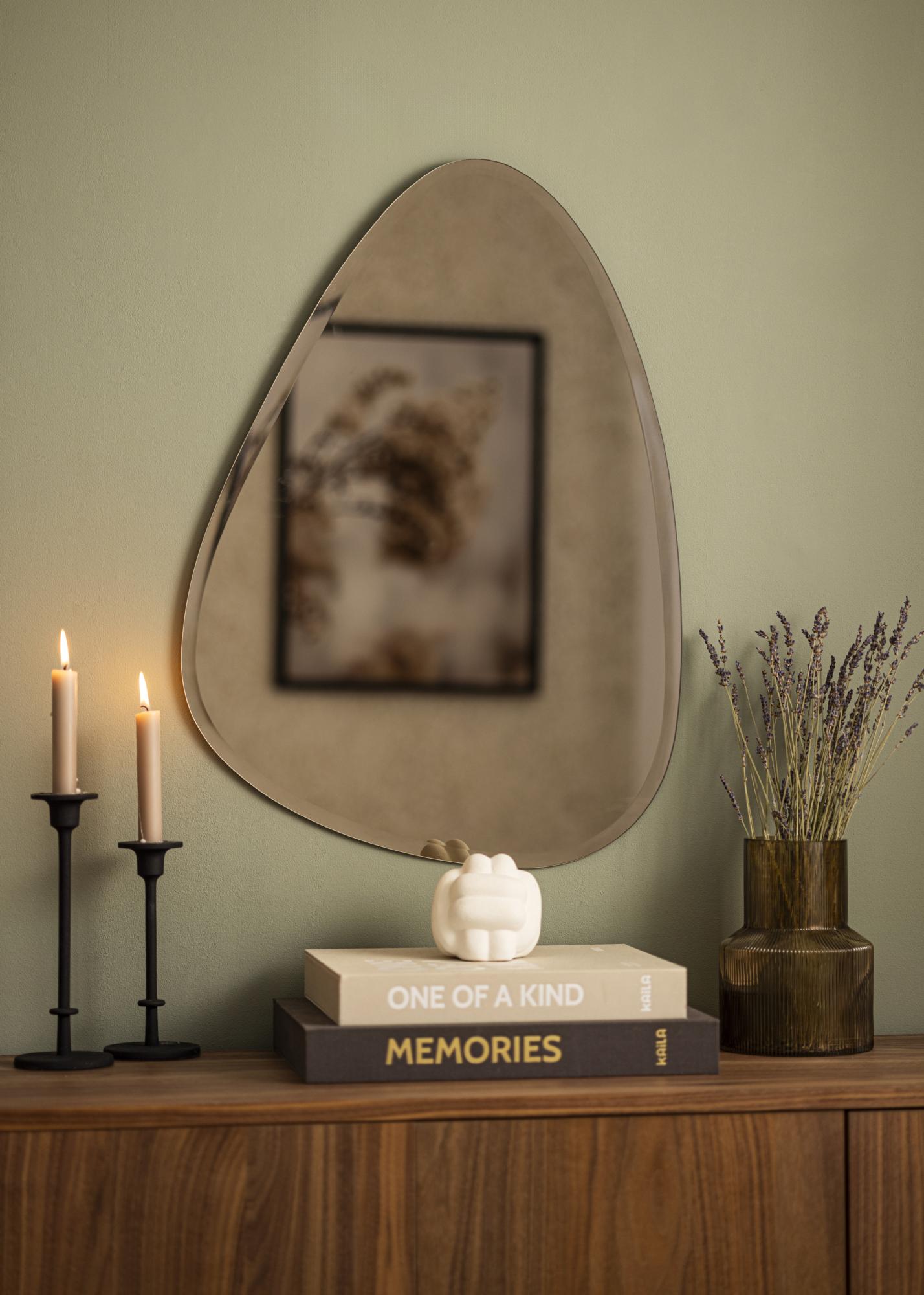 Questo è uno specchio da parete asimmetrico di KAILA, con lastra di specchio dal tono bronzo moderno. Uno specchio con lastra di specchio più scuro diventa un dettaglio drammatico che si adatta perfettamente alle case moderne. Lo specchio sottile non ha una cornice. Invece, i bordi della superficie dello specchio sono decorati con un'elegante bordatura sfaccettata.
