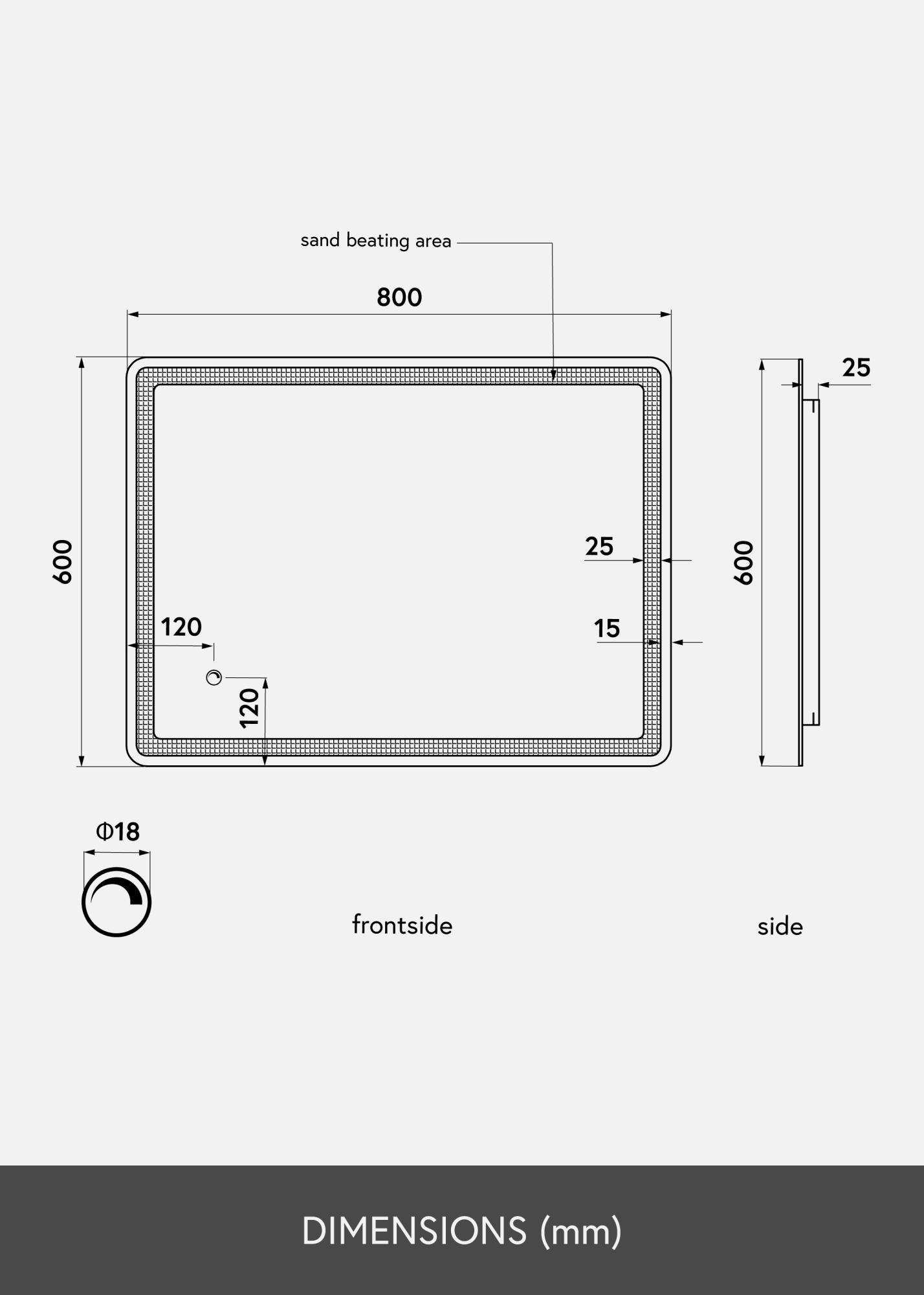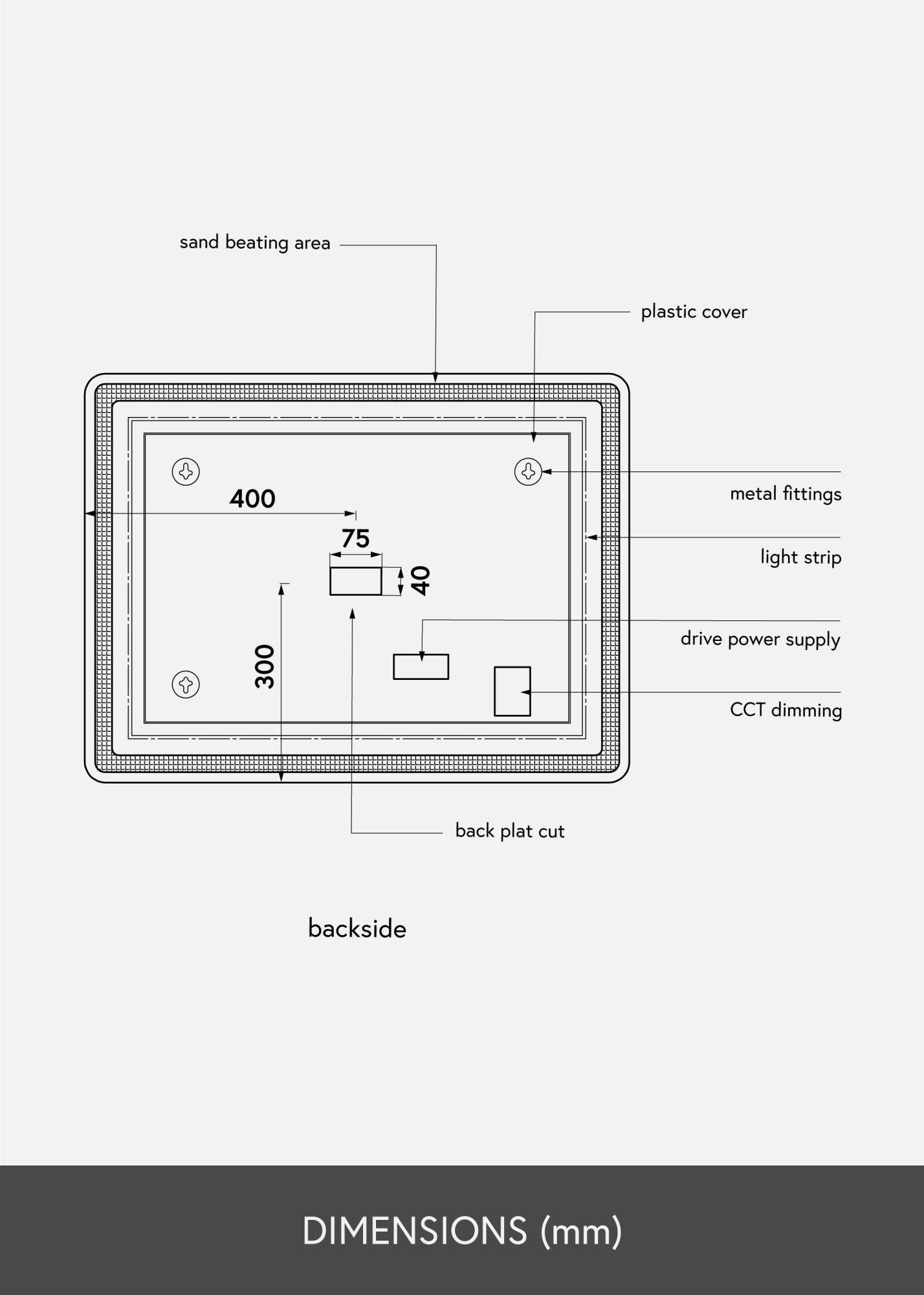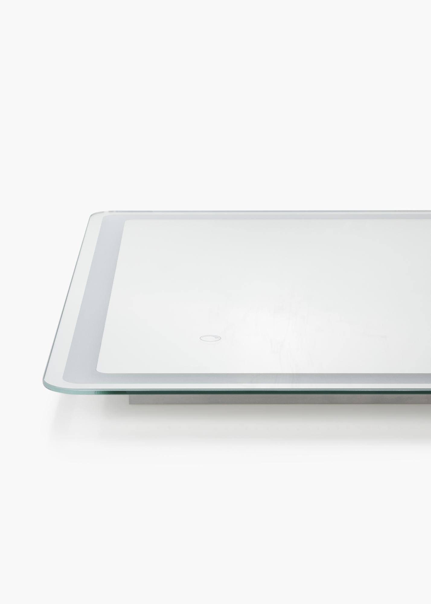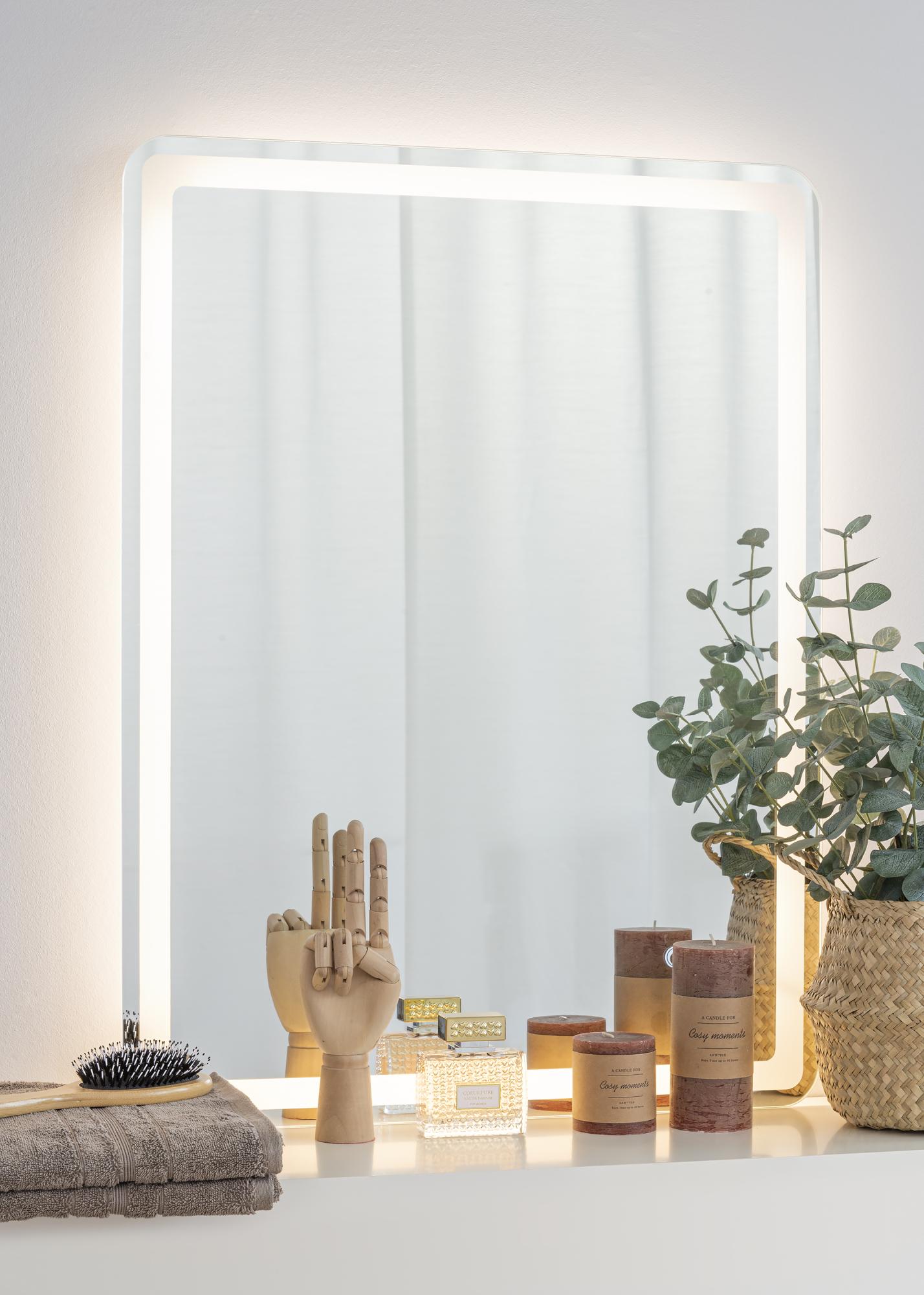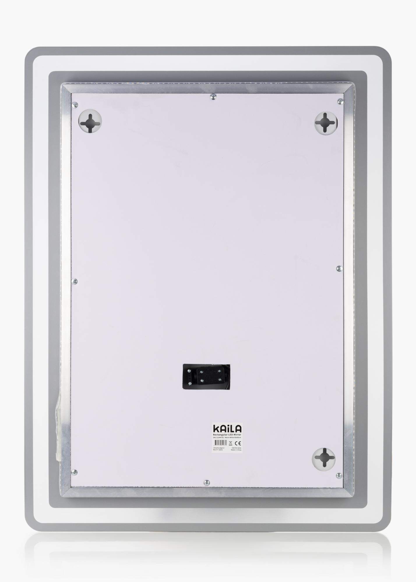 Lo specchio misura 60x80 cm e può essere posizionato sia in orizzontale che in verticale grazie ai supporti da parete inclusi. Lo specchio è approvato per l'uso in bagno. È progettato per un'installazione fissa e deve essere collegato a un interruttore. Per un corretto funzionamento dello specchio, è necessario collegarlo a un interruttore normale, non a un dimmer.